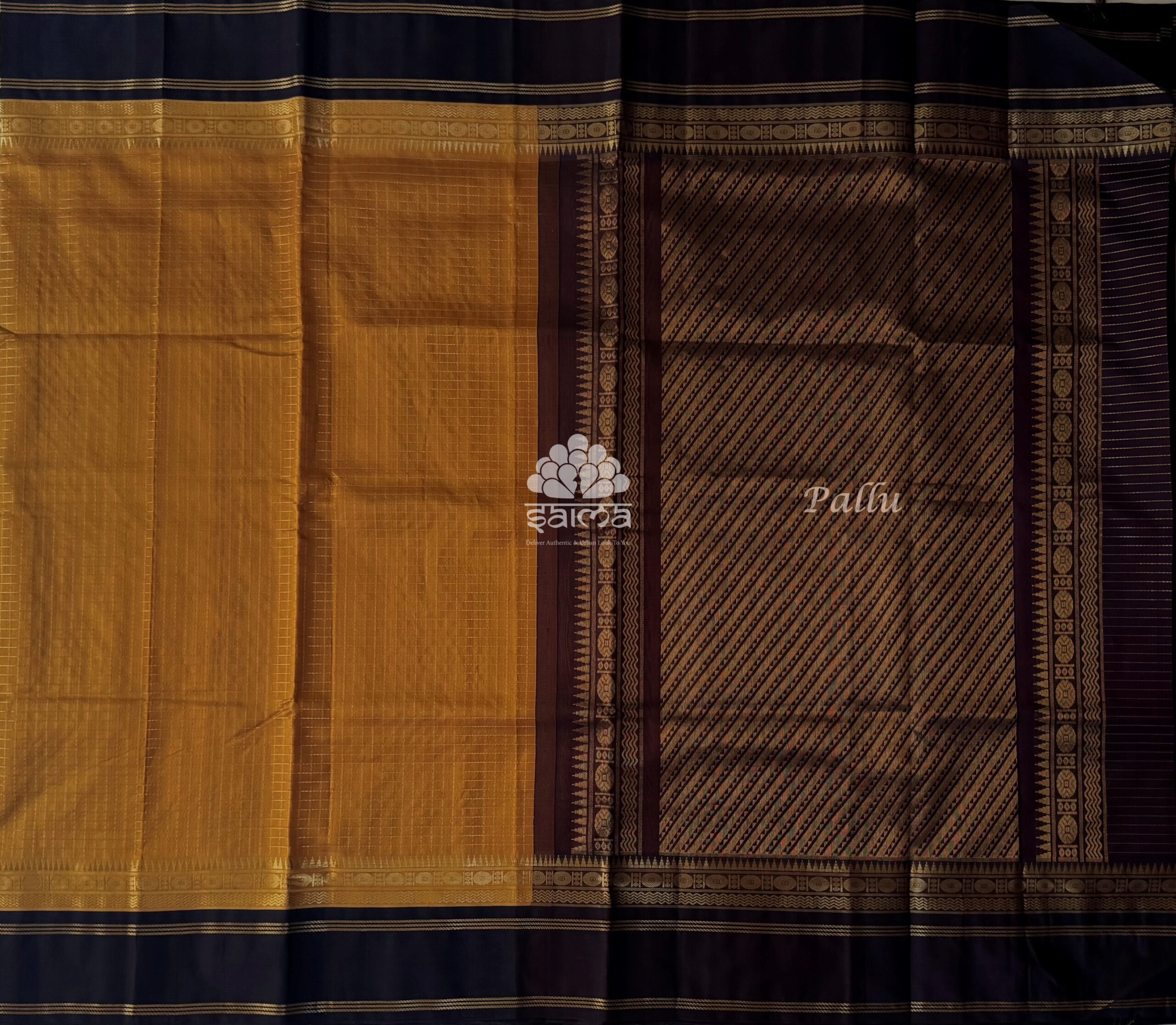 Kanchi korvai silk cotton in golden brown sugar color having zari kattam design all over the saree and rich korvai designed border. Pallu and blouse in dark coffee brown color.