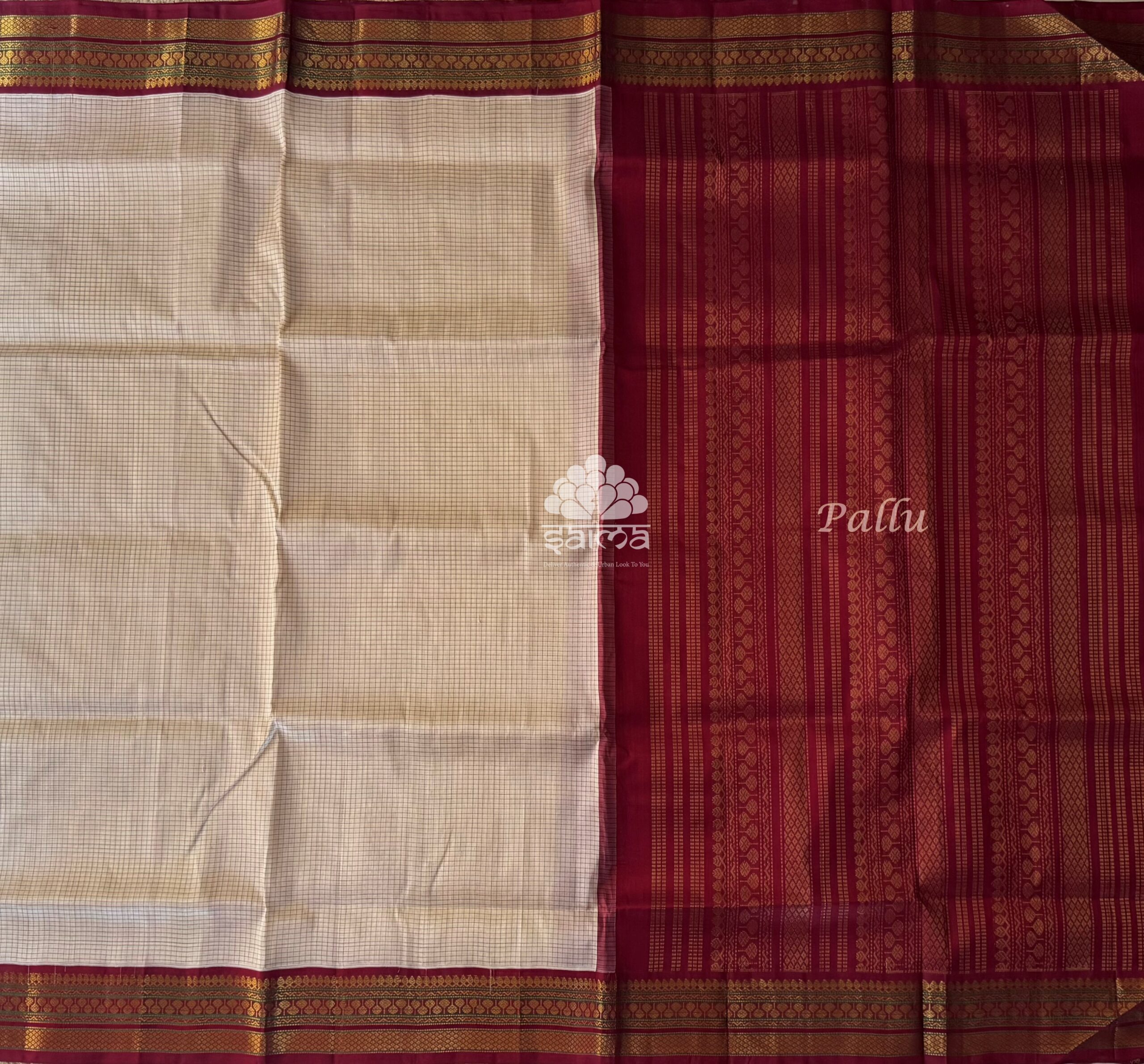 Kanchi korvai silk cotton in off white color having thread checks design all over the saree and rich mayil kanne and leafy designed korvai border. Pallu and blouse in reddish maroon color.