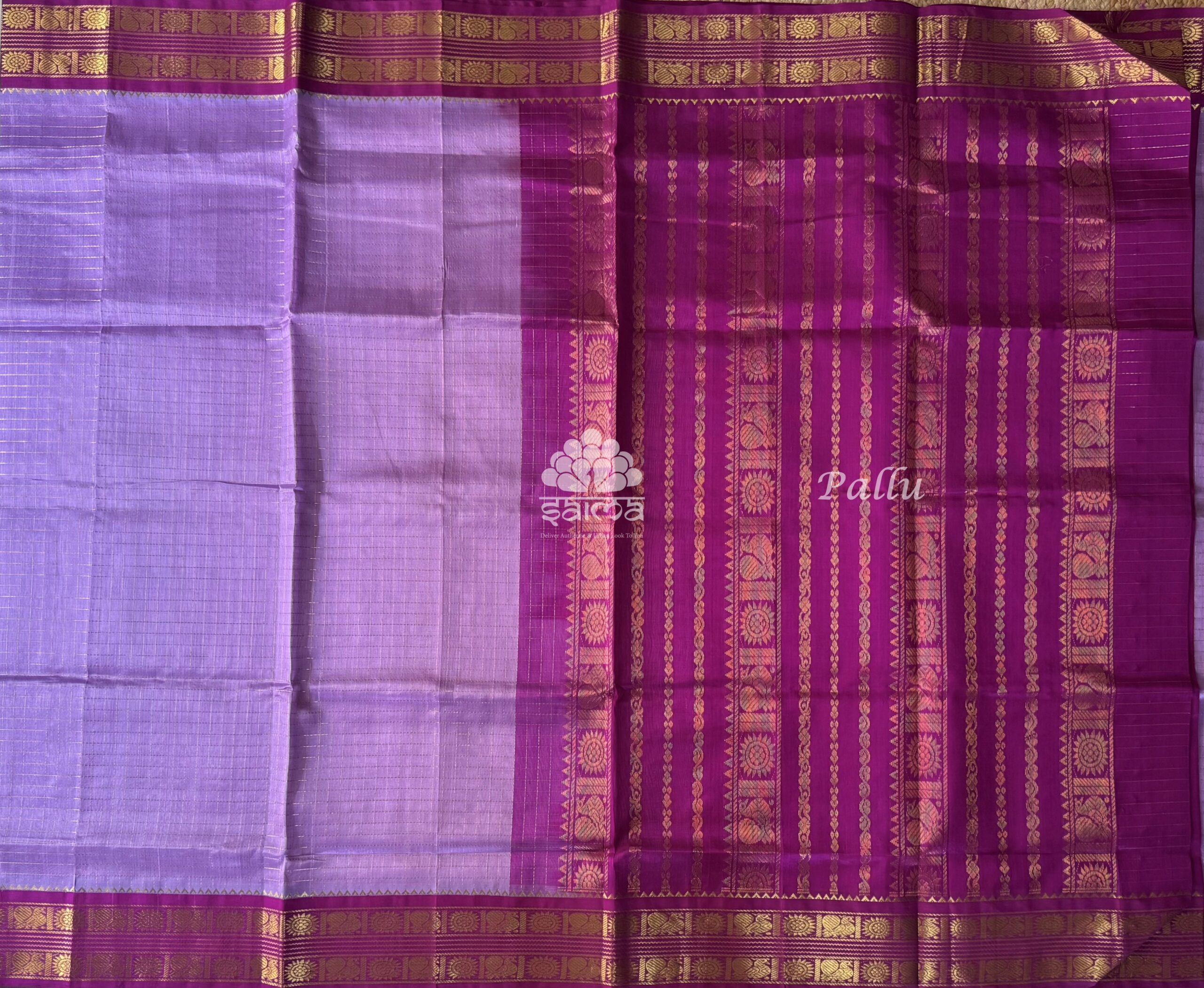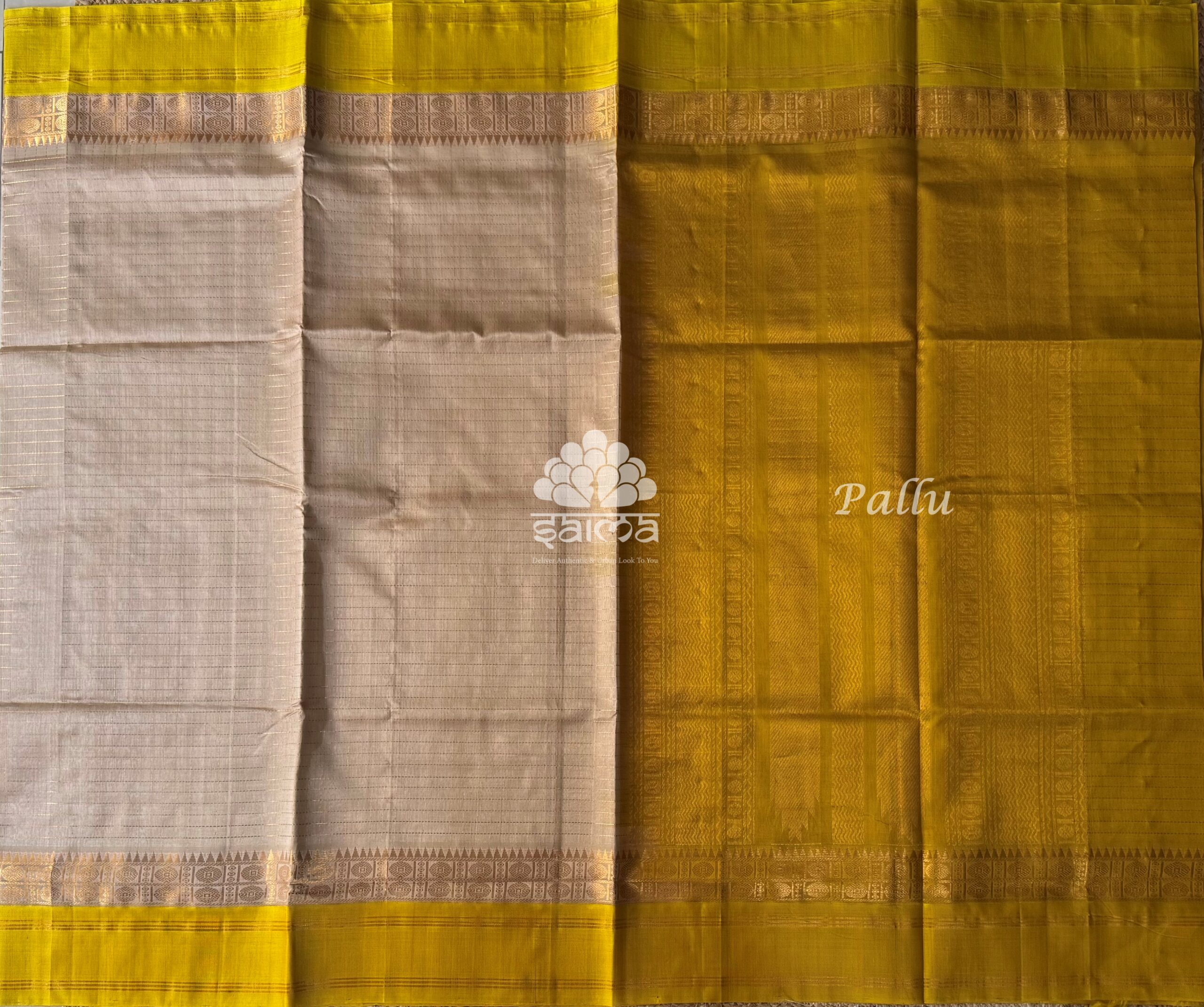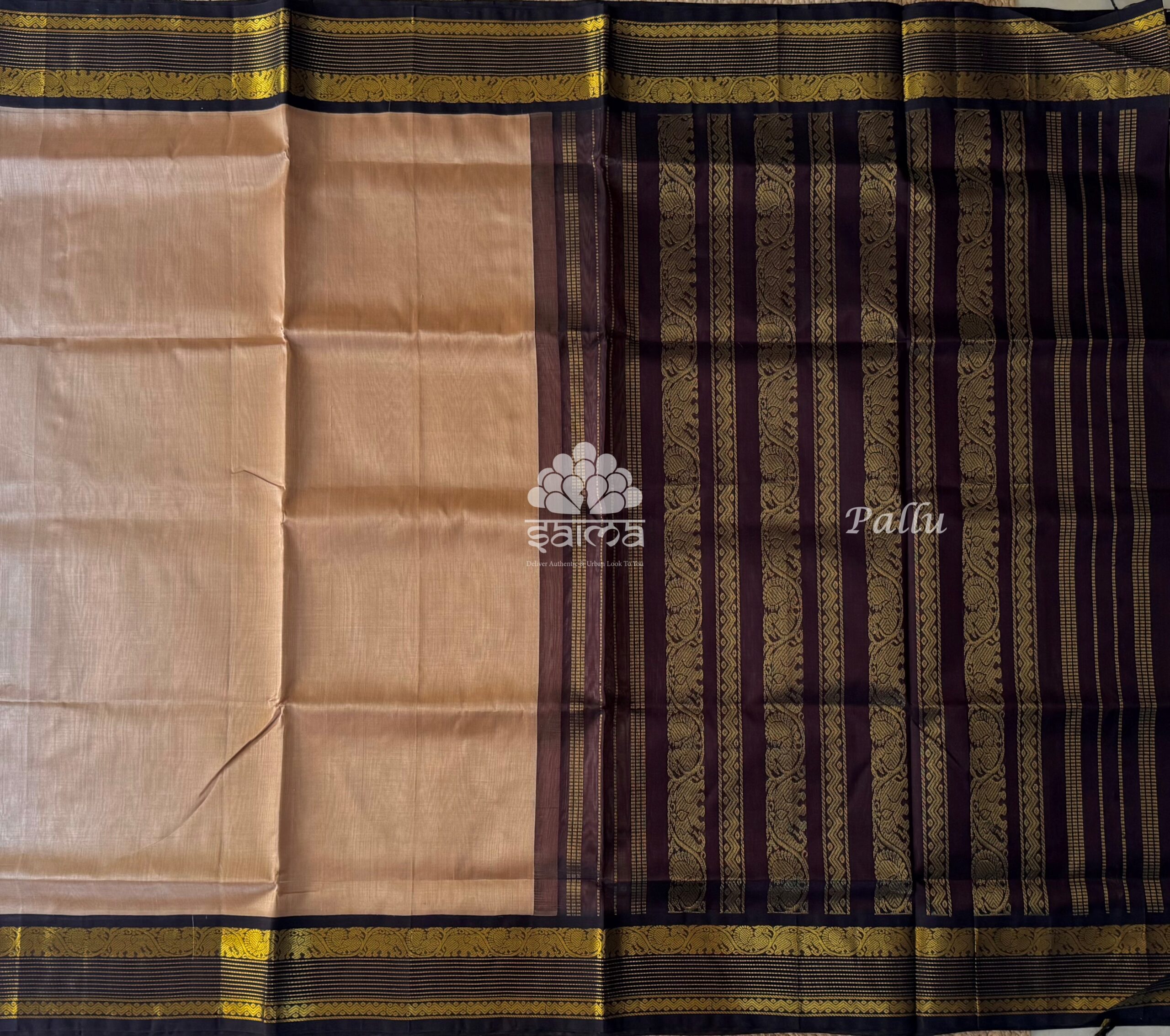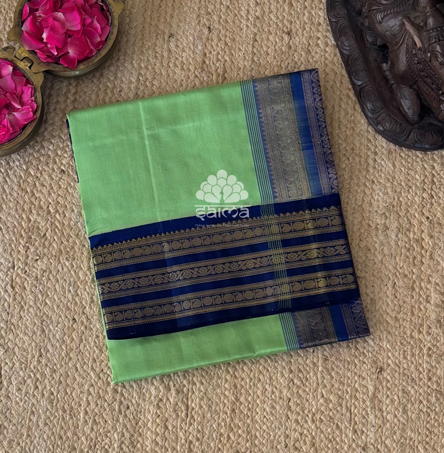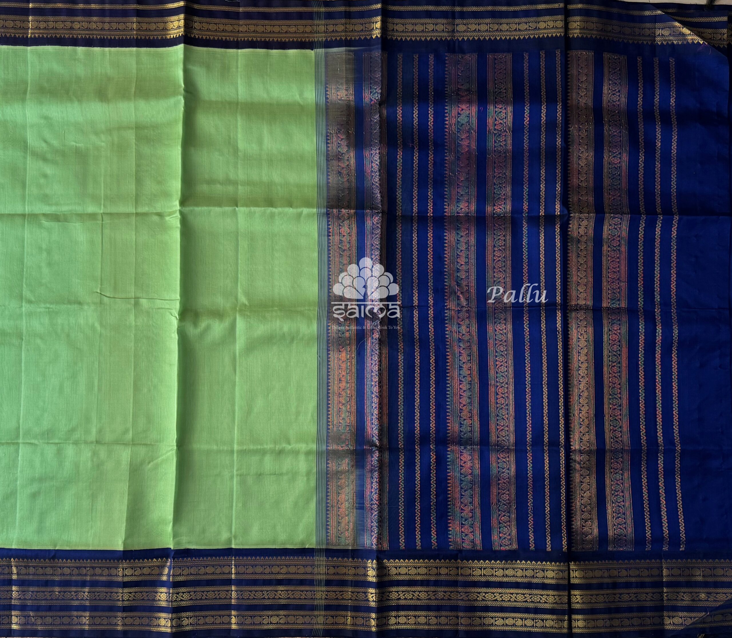 RM425.00RM375.00or 3 payments of RM125.00 withExclusive kanchi korvai silk cotton in pastel steel grey color with fine thread kattam design all over the saree and mango bhutta designed korvai lower border and khadi zari design at top korvai border. Pallu and blouse in navy blue color.