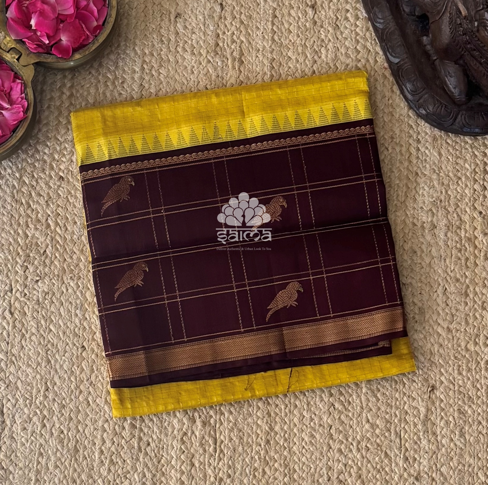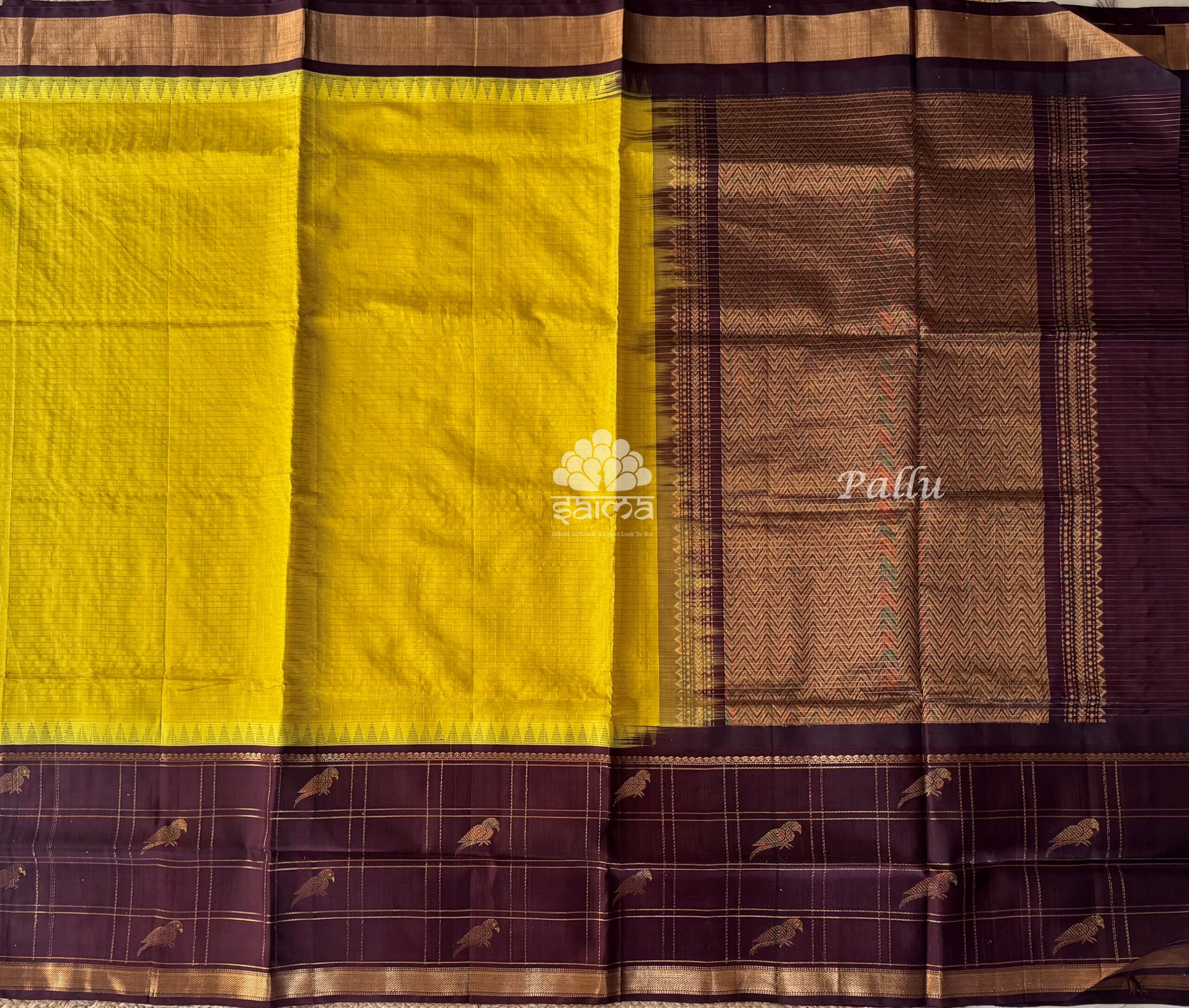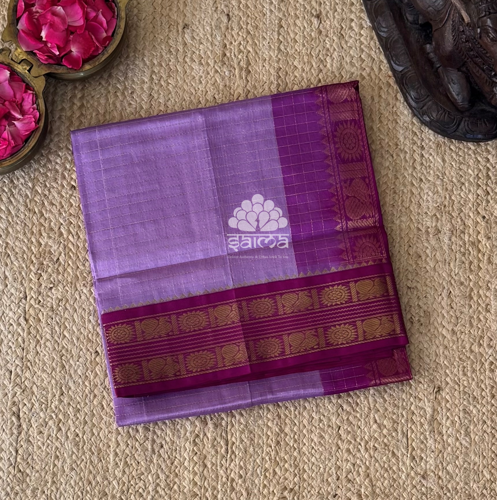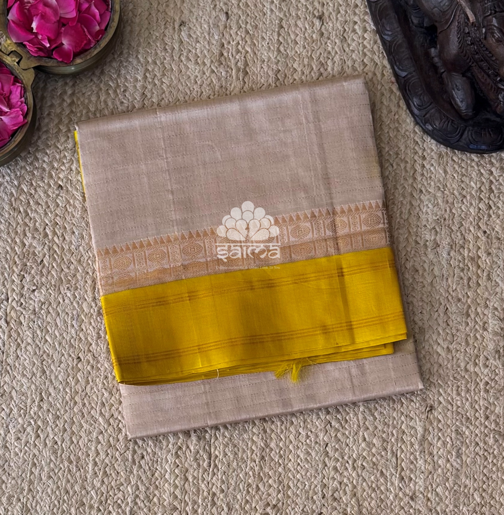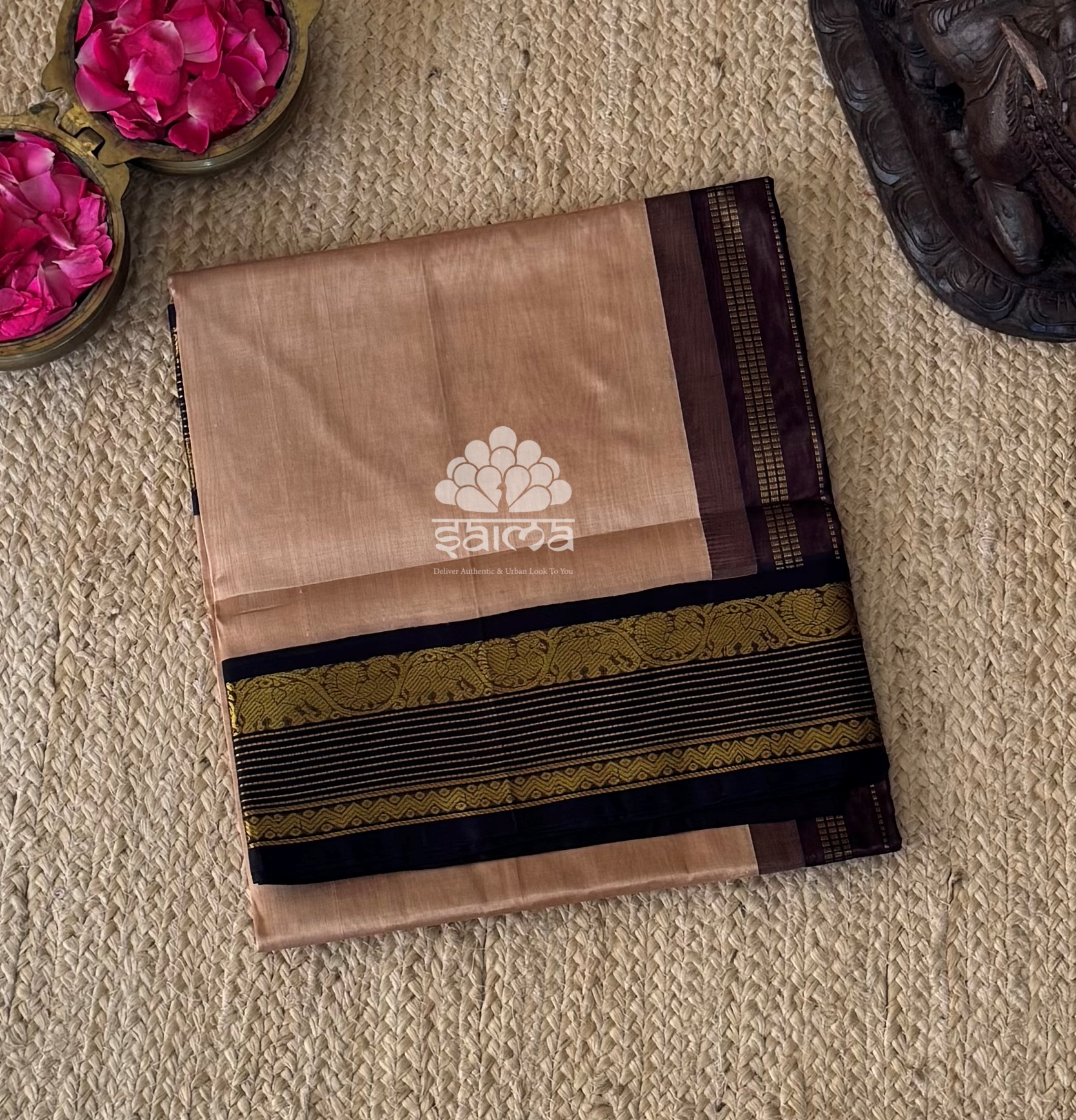 RM425.00RM375.00or 3 payments of RM125.00 withExclusive kanchi korvai silk cotton in pastel steel grey color with fine thread kattam design all over the saree and mango bhutta designed korvai lower border and khadi zari design at top korvai border. Pallu and blouse in navy blue color.