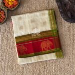 Kanchi korvai silk cotton in half white color having elephant bhuttas all over the saree and elephant bhutta design korvai border. Pallu and blouse in deep light green color and blouse has elephant bhuttas too.