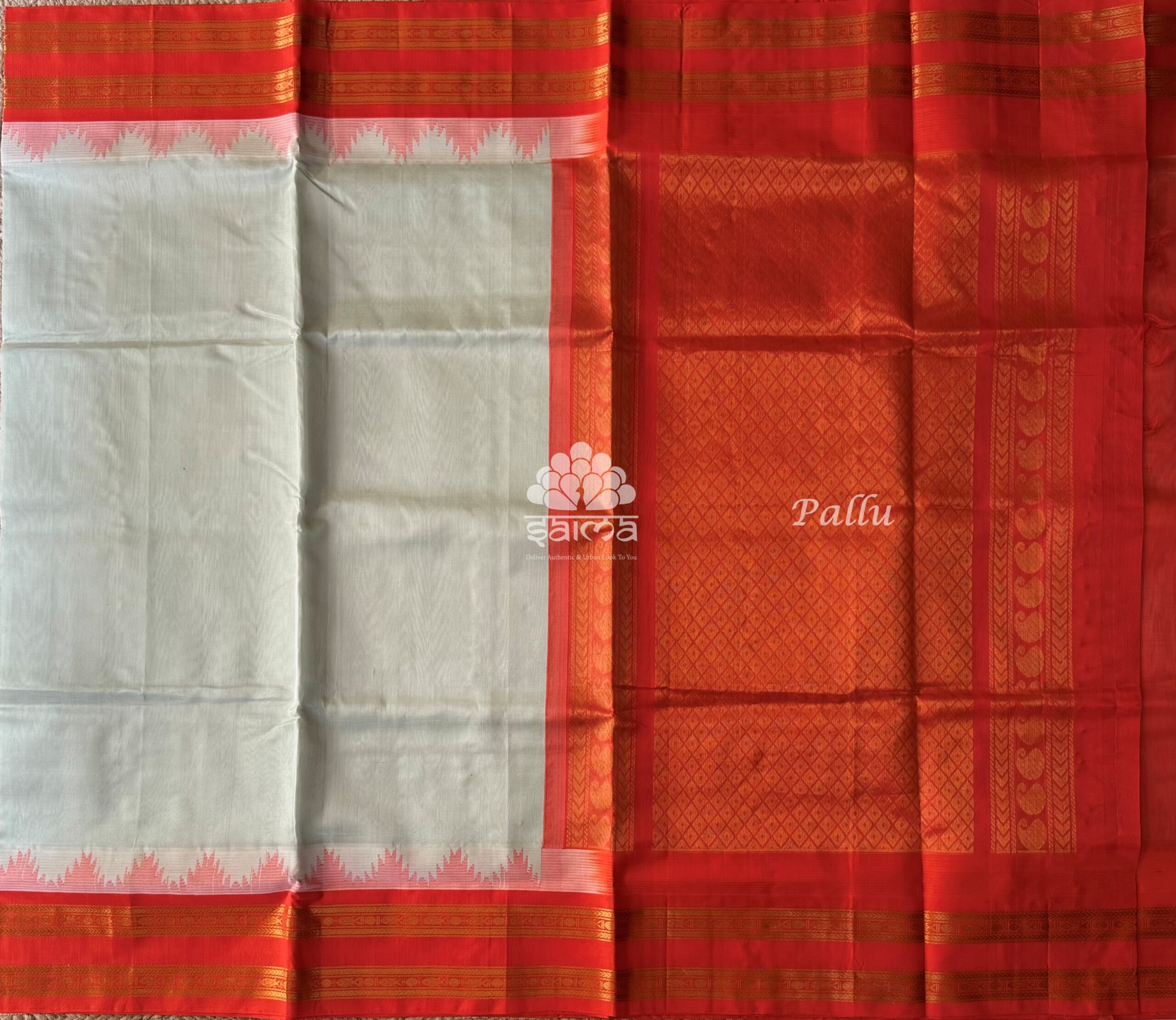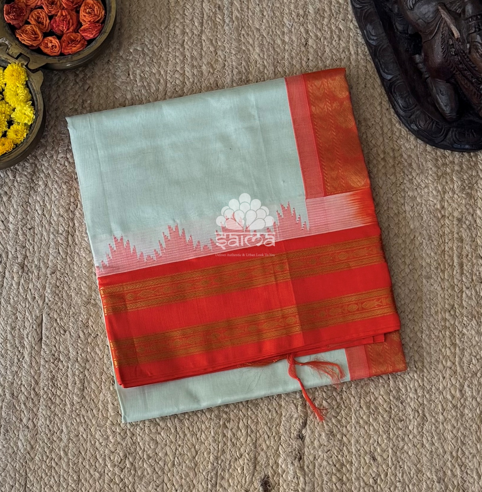 RM425.00RM375.00or 3 payments of RM125.00 withExclusive kanchi korvai silk cotton in pastel steel grey color with fine thread kattam design all over the saree and mango bhutta designed korvai lower border and khadi zari design at top korvai border. Pallu and blouse in navy blue color.