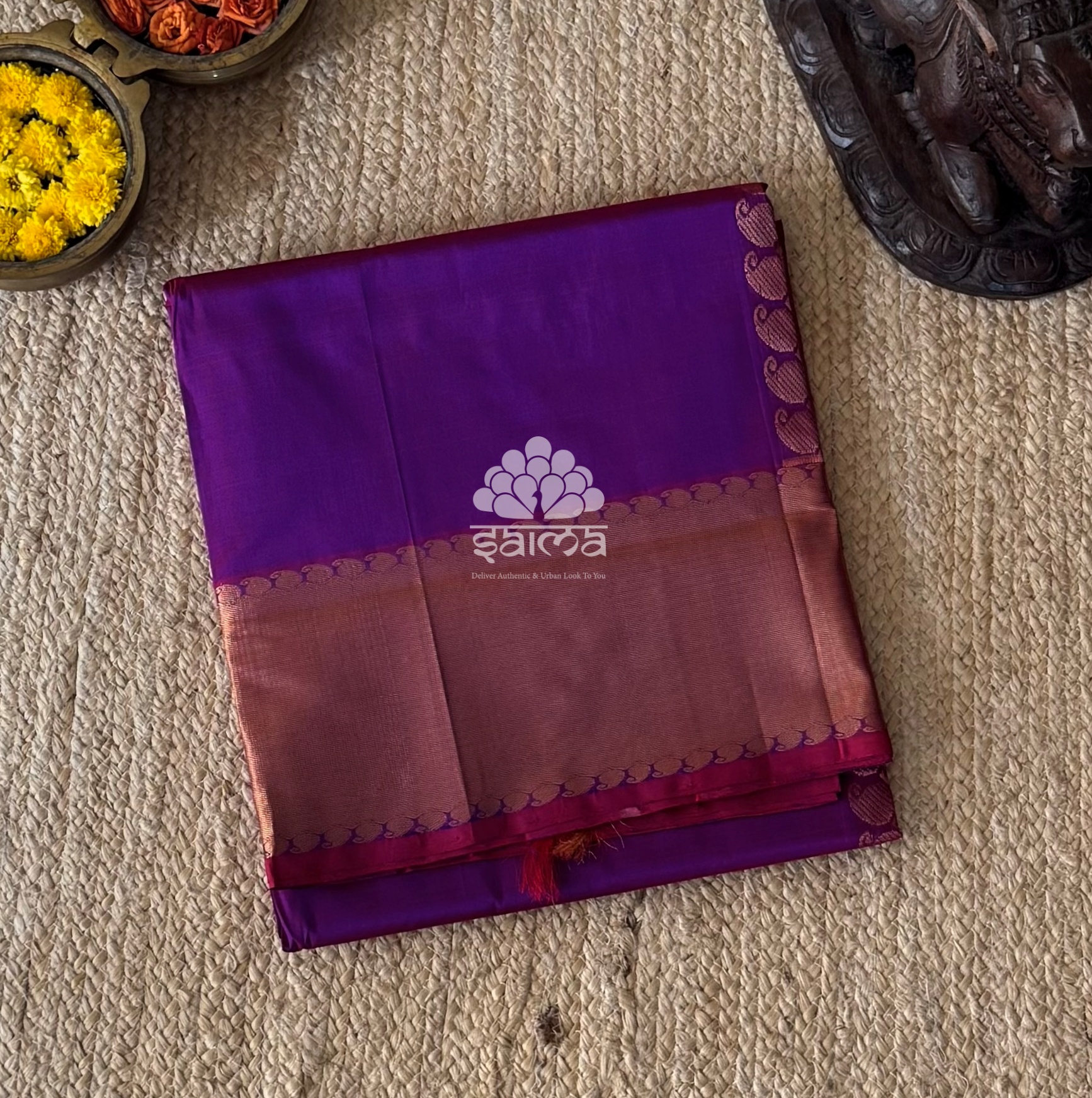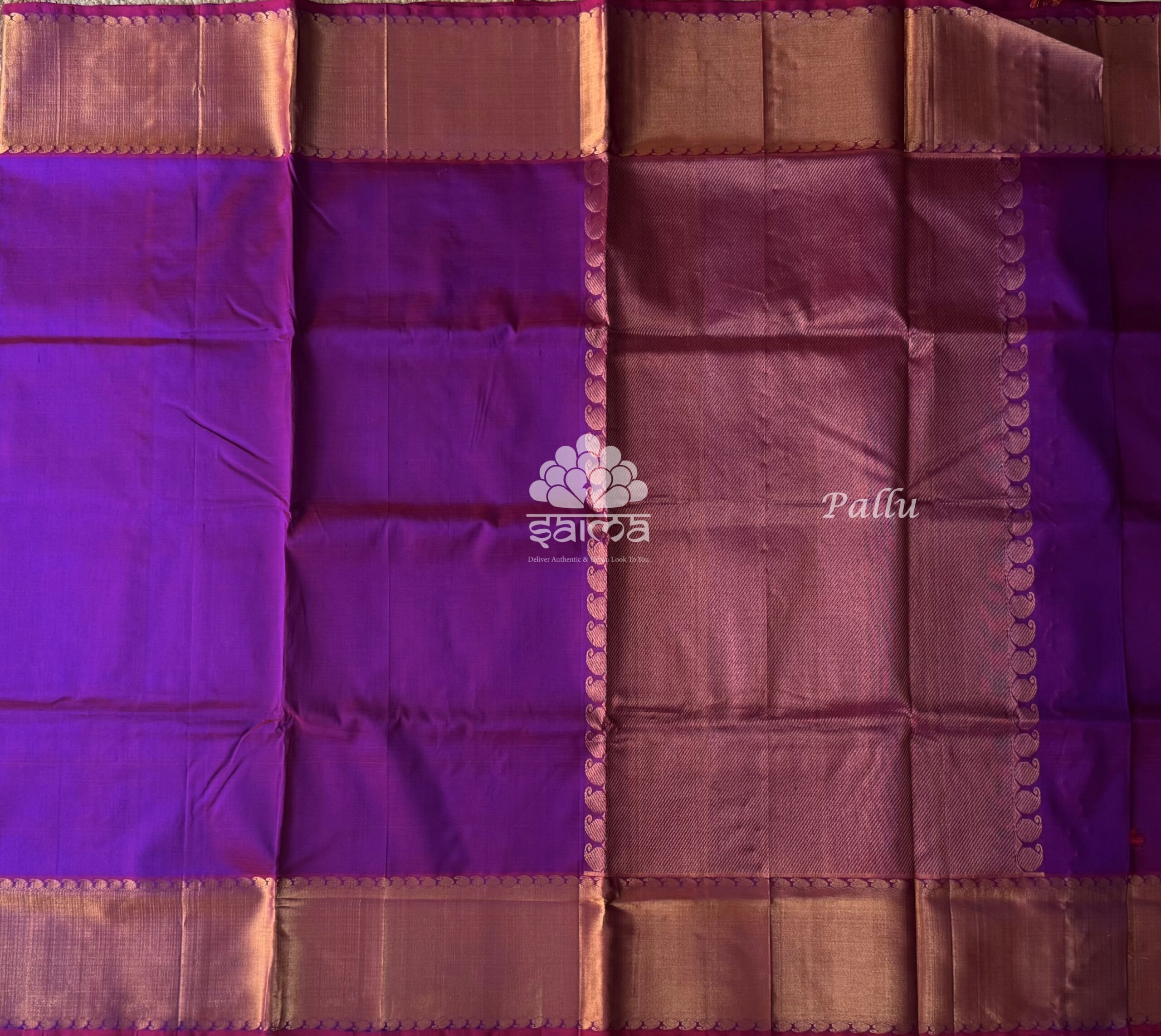 RM425.00RM375.00or 3 payments of RM125.00 withExclusive kanchi korvai silk cotton in pastel steel grey color with fine thread kattam design all over the saree and mango bhutta designed korvai lower border and khadi zari design at top korvai border. Pallu and blouse in navy blue color.