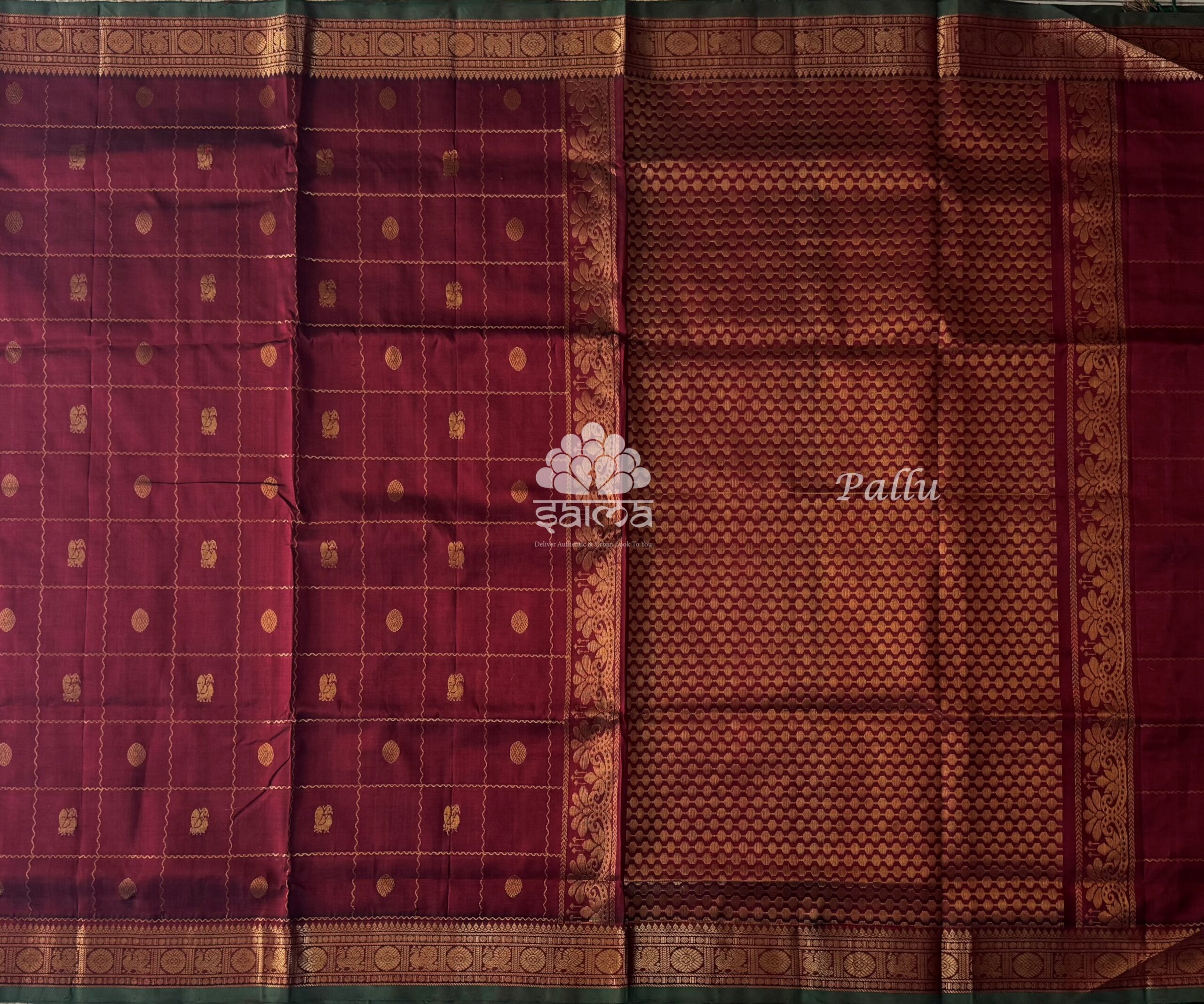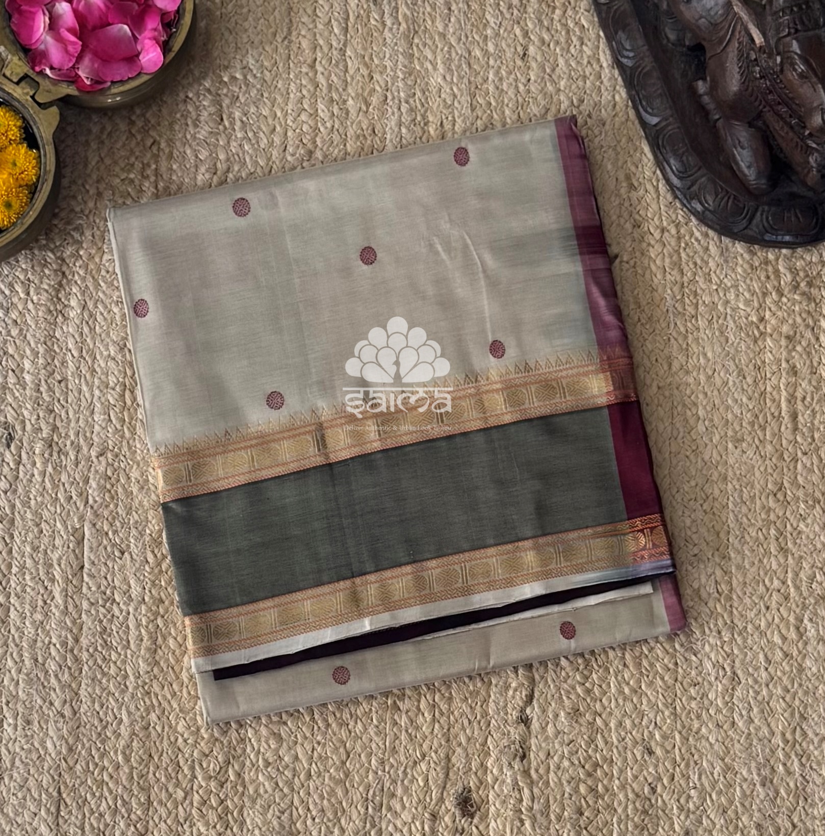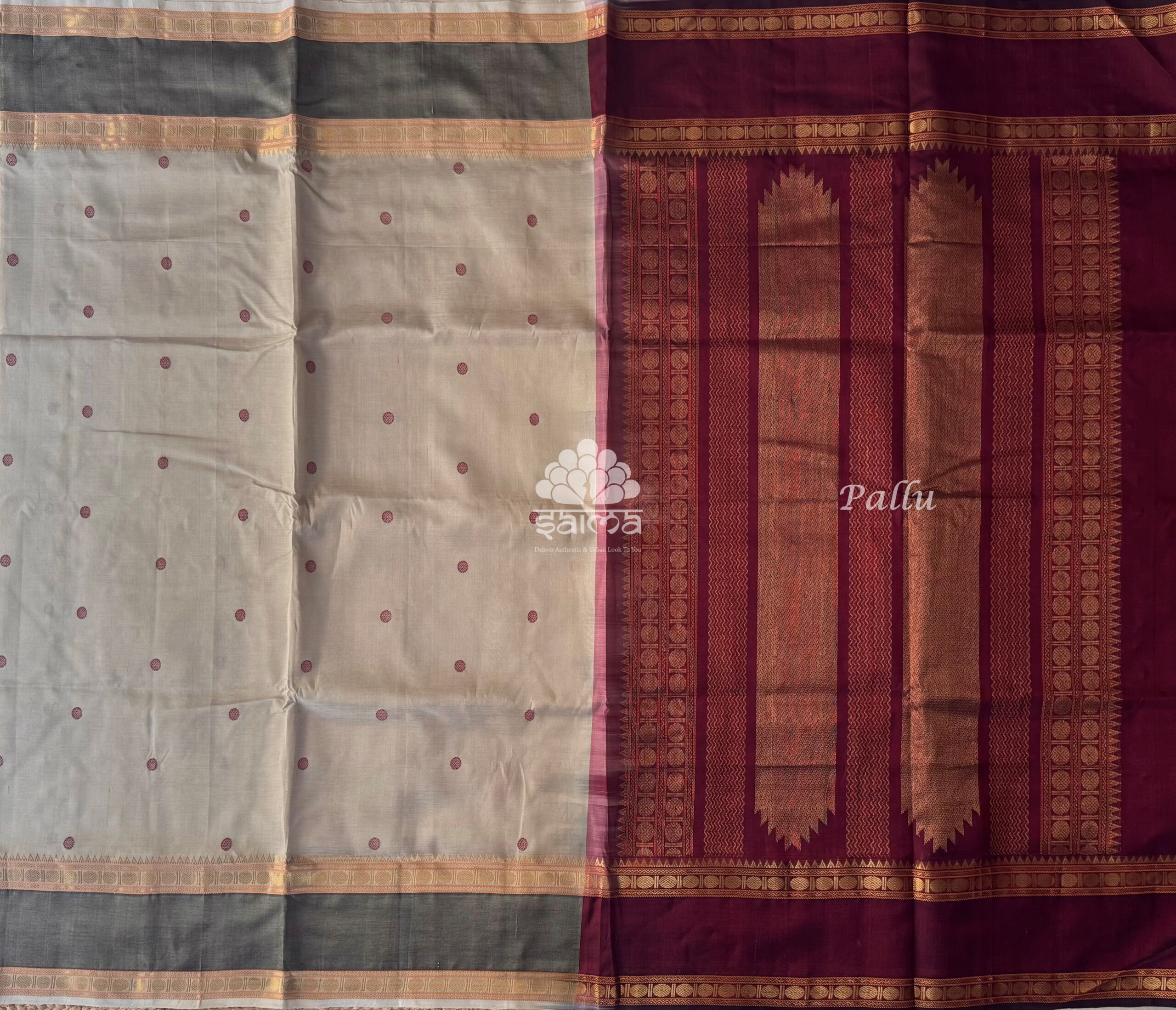 RM415.00or 3 payments of RM138.33 withExclusive kanchi korvai silk cotton in soft silver-grey color having thread kattam with bhuttas design all over the saree and rich elepehant with annapakshi with thazhampoo designed korvai lower border and floral designed korvai top border. Pallu and blouse in reddish maroon color.