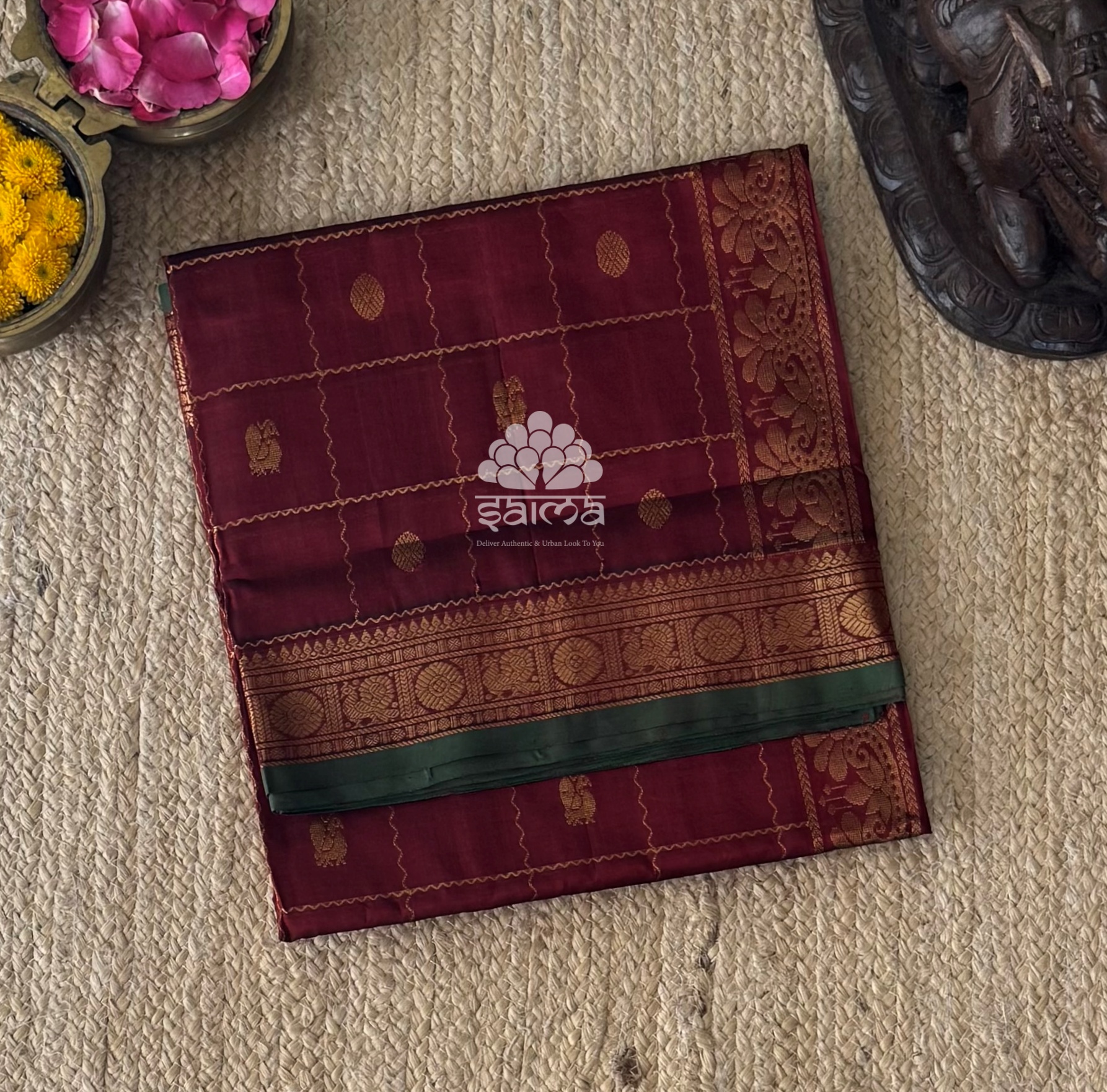 RM415.00or 3 payments of RM138.33 withExclusive kanchi korvai silk cotton in dark green color having zari kattam with bhuttas design all over the saree and rich floral with annapakshi with thazhampoo designed korvai lower border and floral designed korvai top border. Pallu and blouse in orange color.