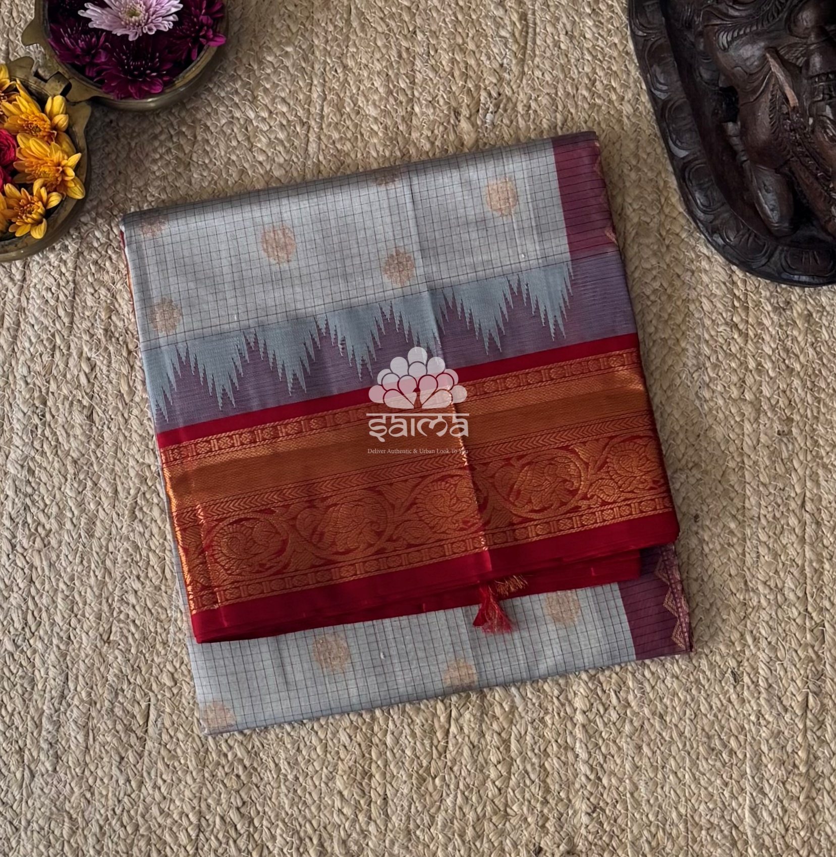 RM415.00or 3 payments of RM138.33 withExclusive kanchi korvai silk cotton in soft silver-grey color having thread kattam with bhuttas design all over the saree and rich elepehant with annapakshi with thazhampoo designed korvai lower border and floral designed korvai top border. Pallu and blouse in reddish maroon color.