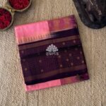 Kanchi korvai silk cotton in lotus pink color having thilak bhuttas all over the saree and podi zari kattam with bhuttas and small temple design lower korvai border. Pallu and blouse in deep wine shaded color.