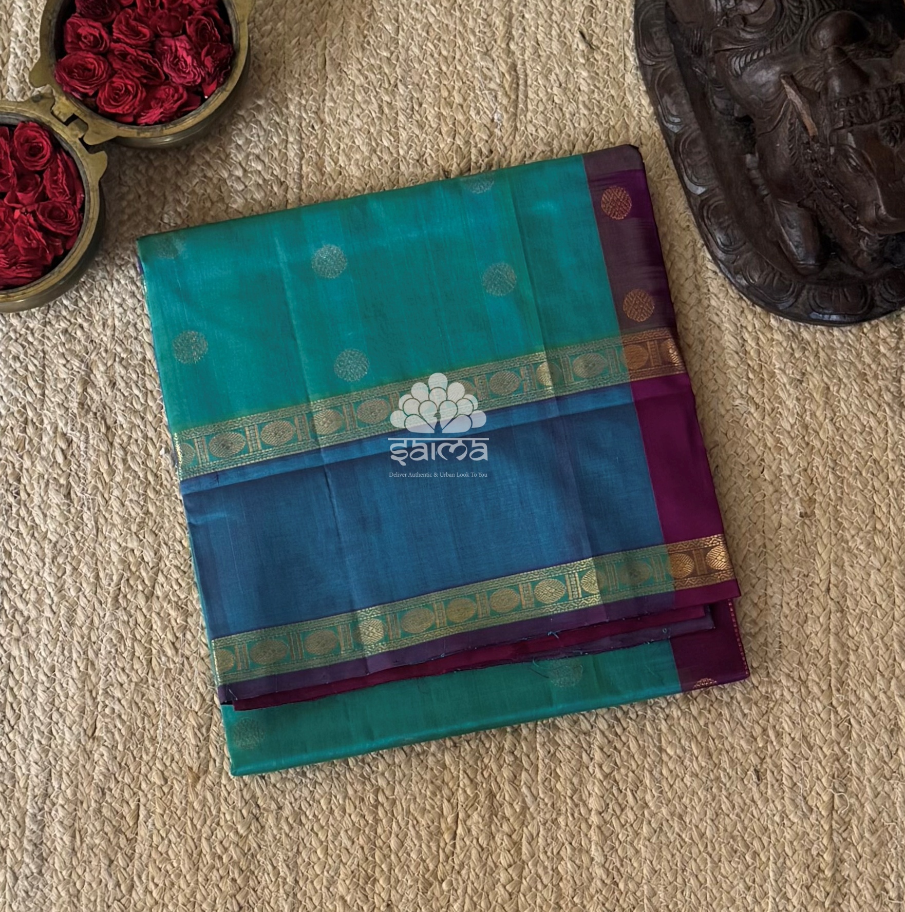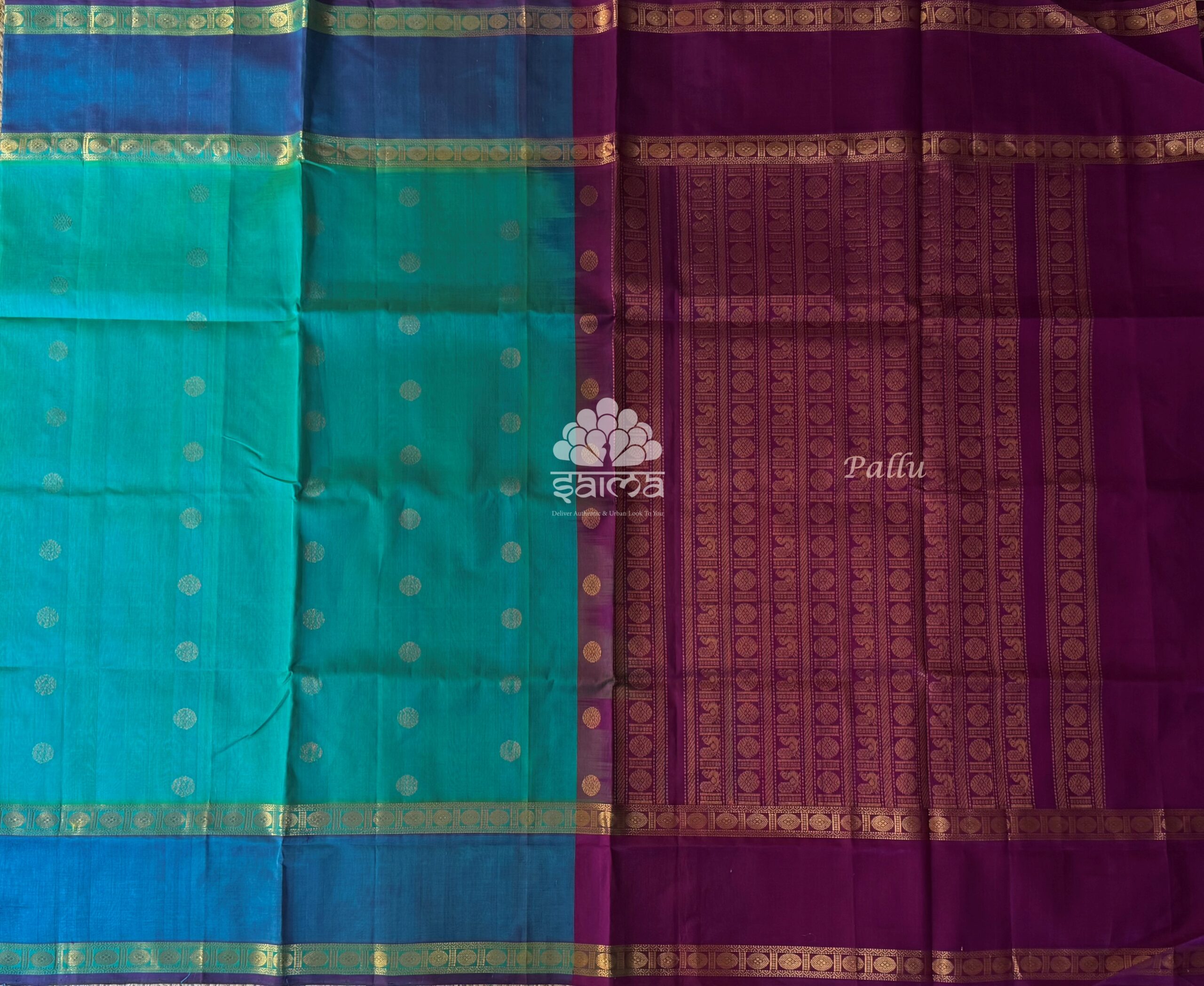 Kanchi silk cotton in deep sea blue color having coin bhuttas design all over the saree and rettai pettu designed border. Pallu and blouse in purple color.
