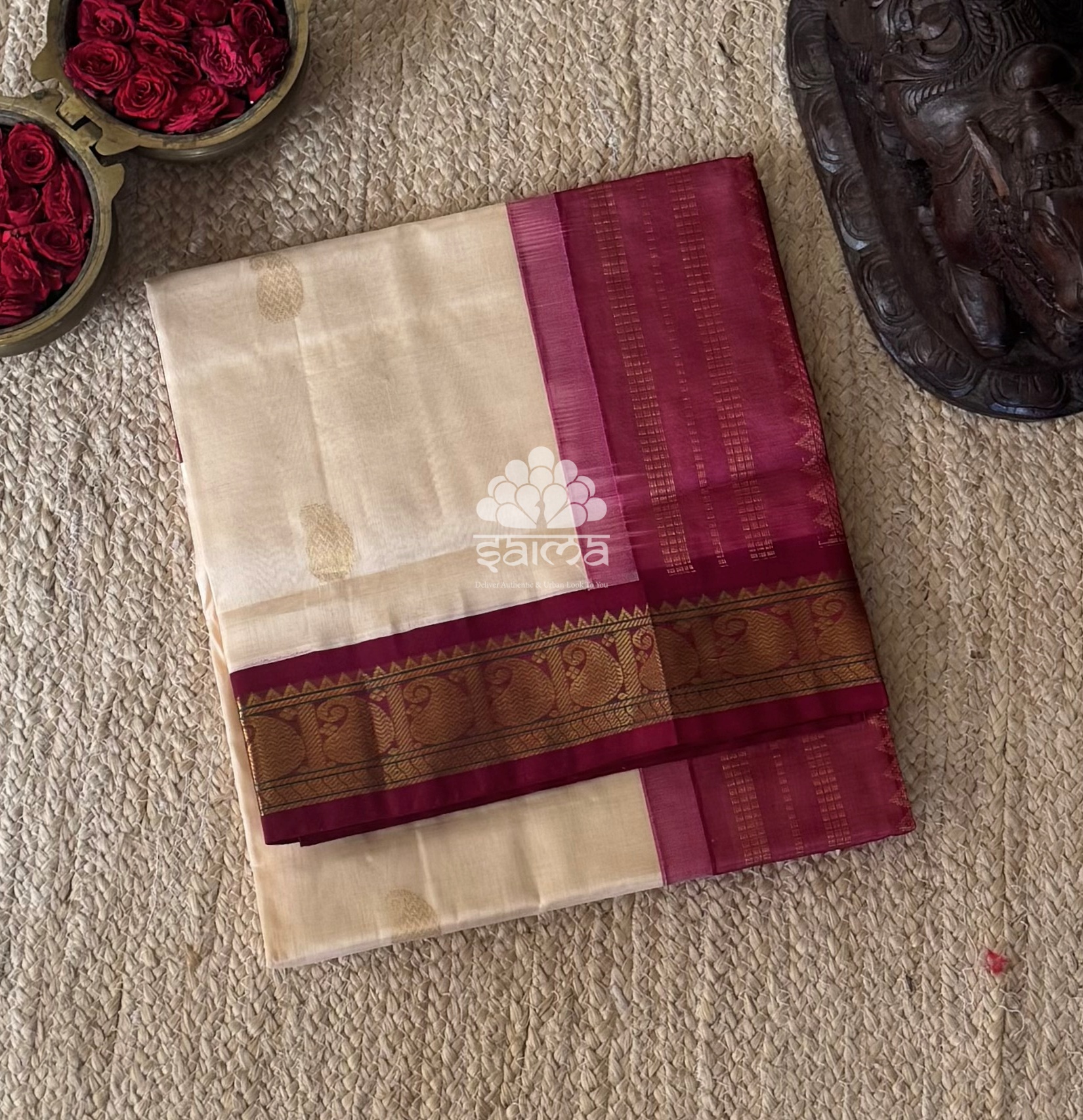 Kanchi korvai silk cotton in maroon color having mango bhuttas design all over the saree and rich annapakshi designed korvai border. Pallu and blouse in off white color.