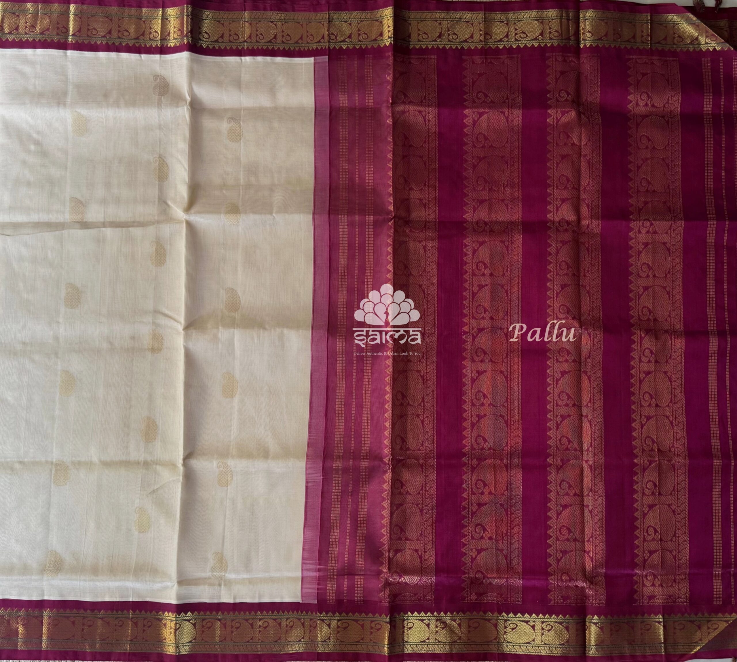 Kanchi korvai silk cotton in half white color having mango bhuttas all over the saree and annapakshi designed korvai border. Pallu and blouse in deep berry pink color.