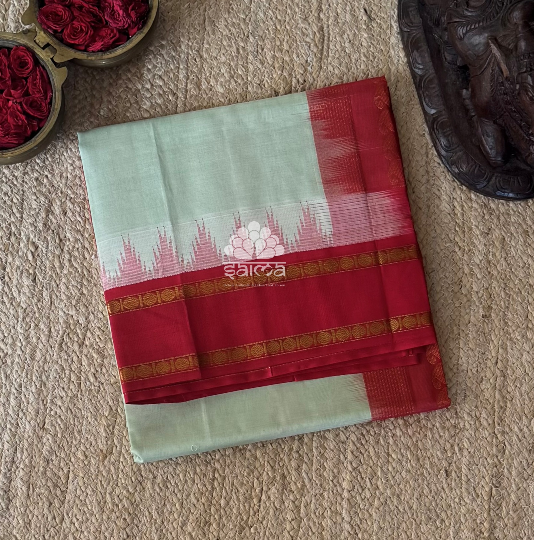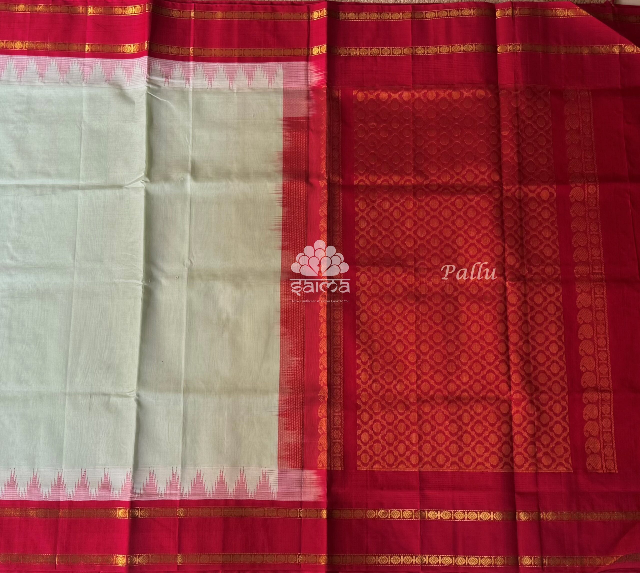 Kanchi korvai silk cotton in half white color having thread checks all over the saree and rich annapakshi designed korvai border. Pallu and blouse in green color.