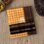Kanchi korvai silk cotton in yellow and white combo color kattam design saree and zari rich design korvai border. Pallu and blouse in dark brown color.