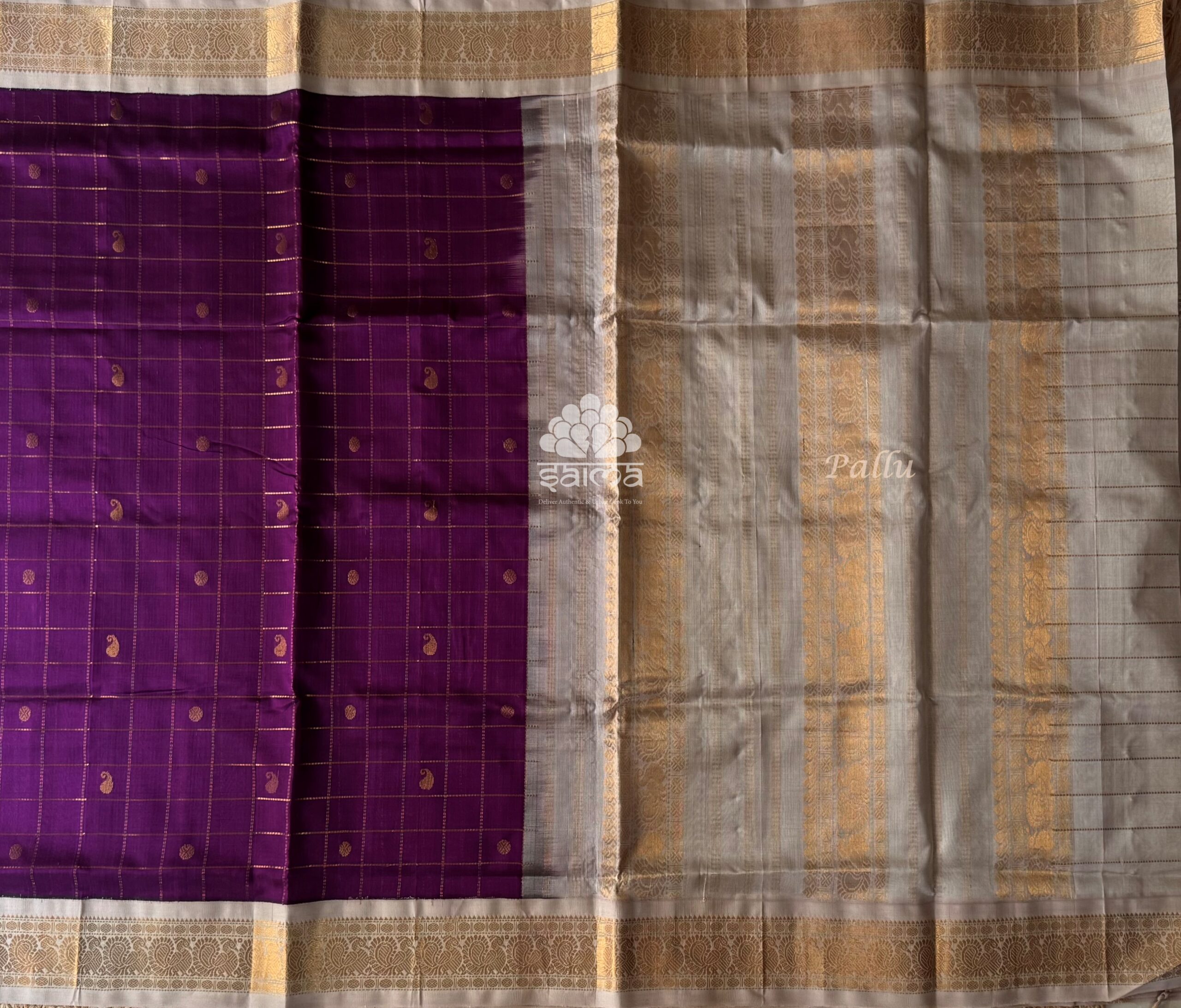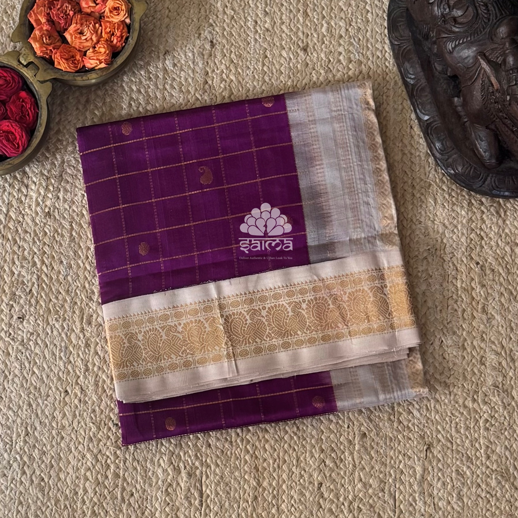 Kanchi korvai silk cotton in dark purple color having zari checks with small bhuttas design all over the saree and annapakshi designed korvai border. Pallu and blouse in off white color.