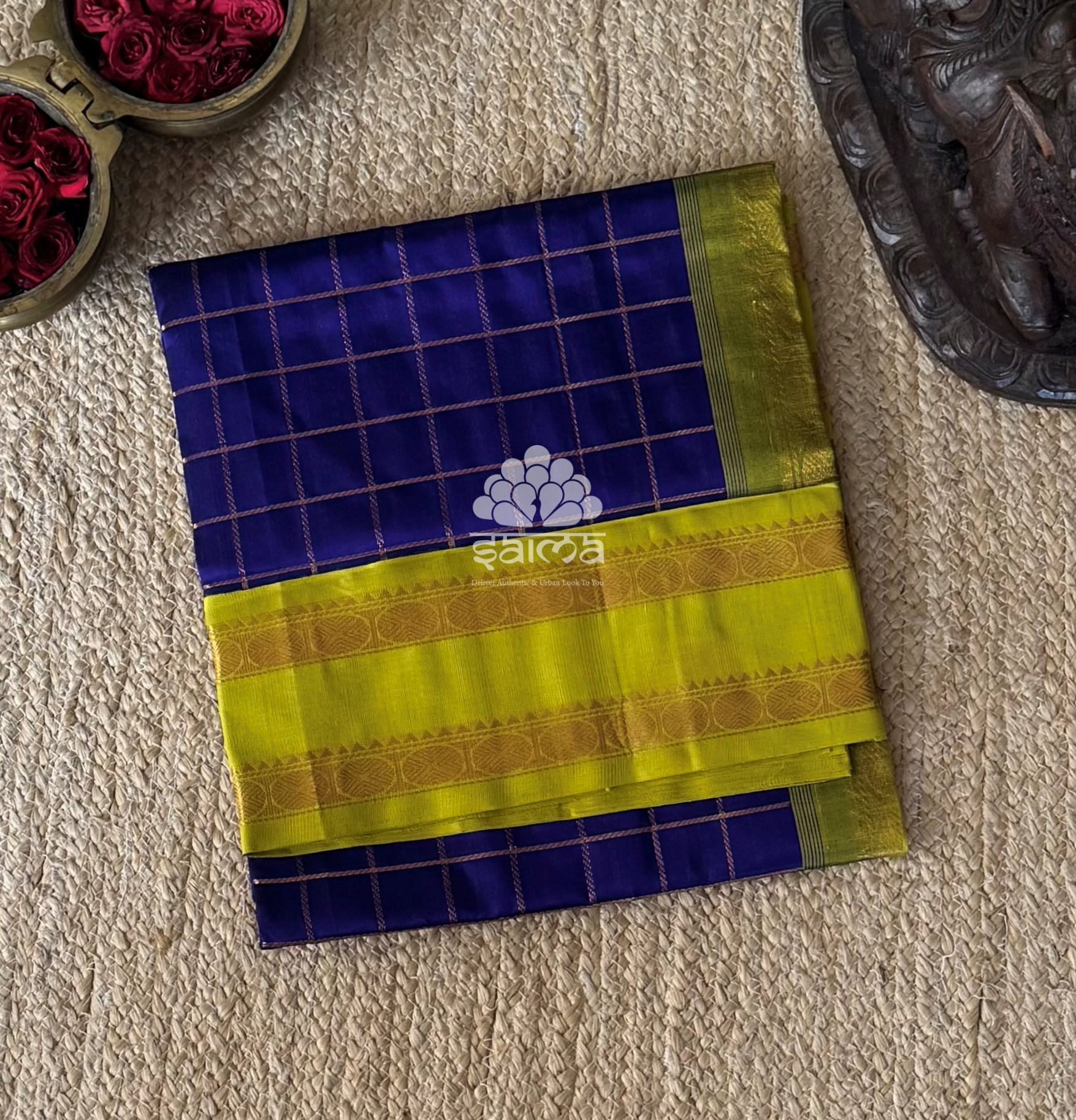Kanchi korvai silk cotton in ink blue color having zari checks body design and rettai pettu design korvai border. Pallu and blouse in lemon green color.