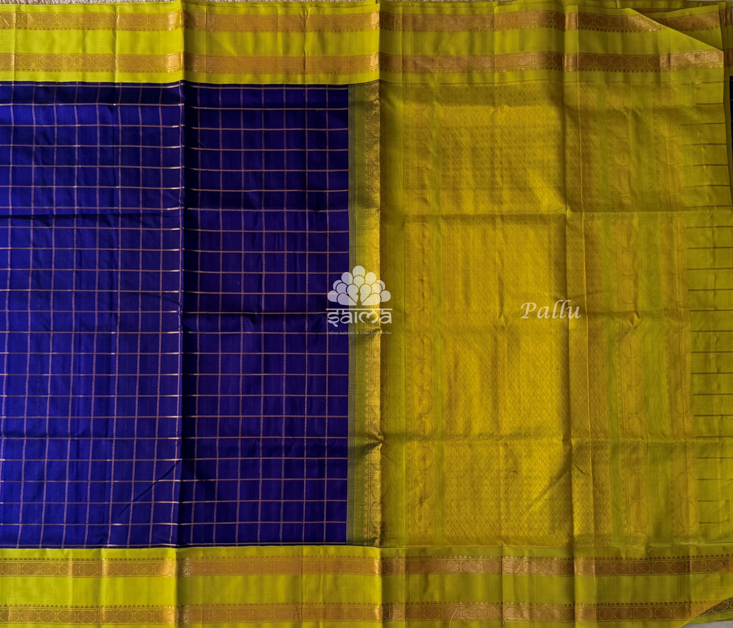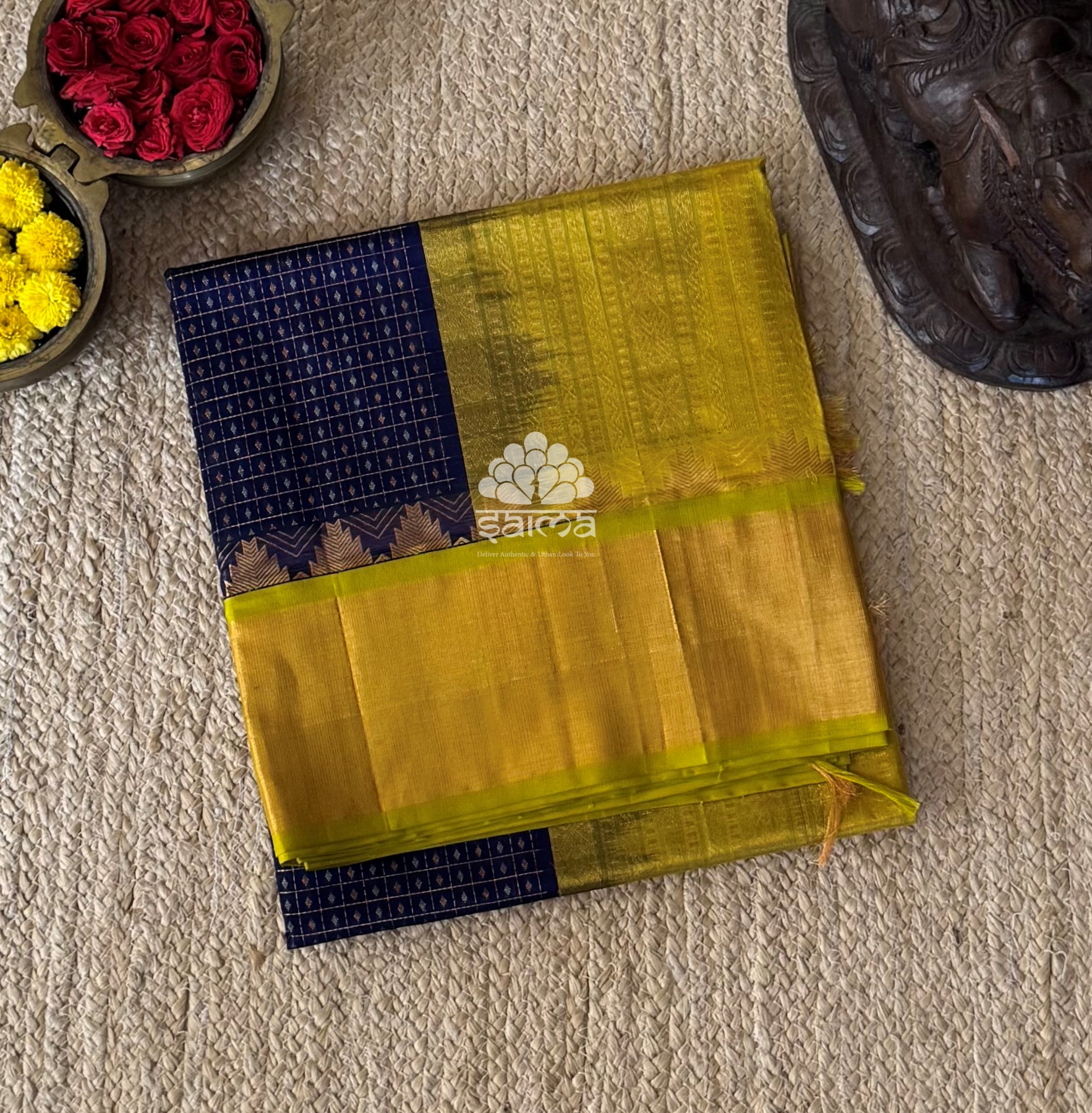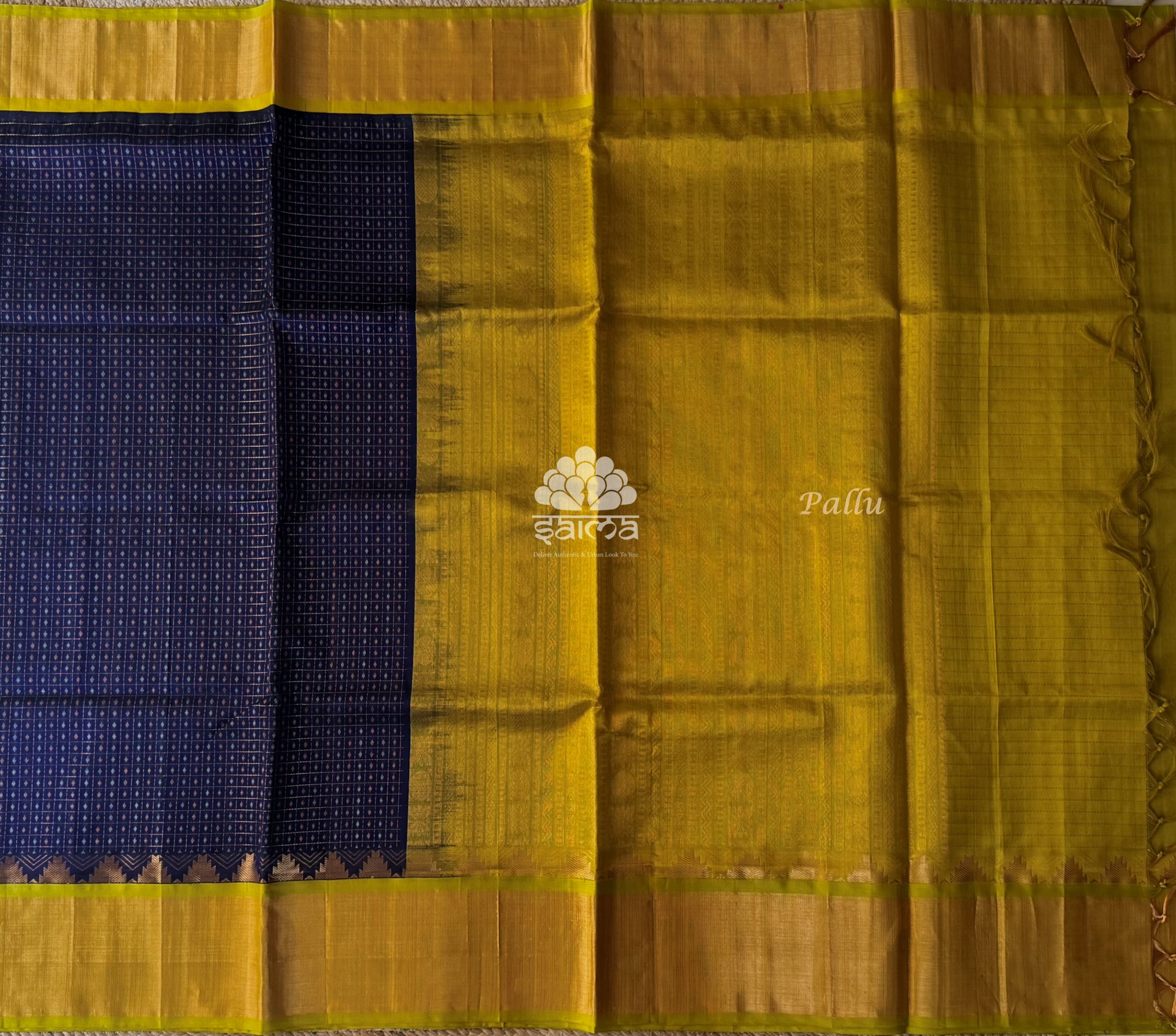 Kanchi korvai silk cotton in midnight blue having lakshadeepam zari checks all over the saree and khadi korvai border. Pallu and blouse in golden lime shaded color.