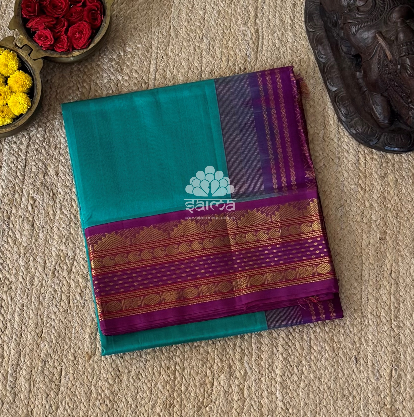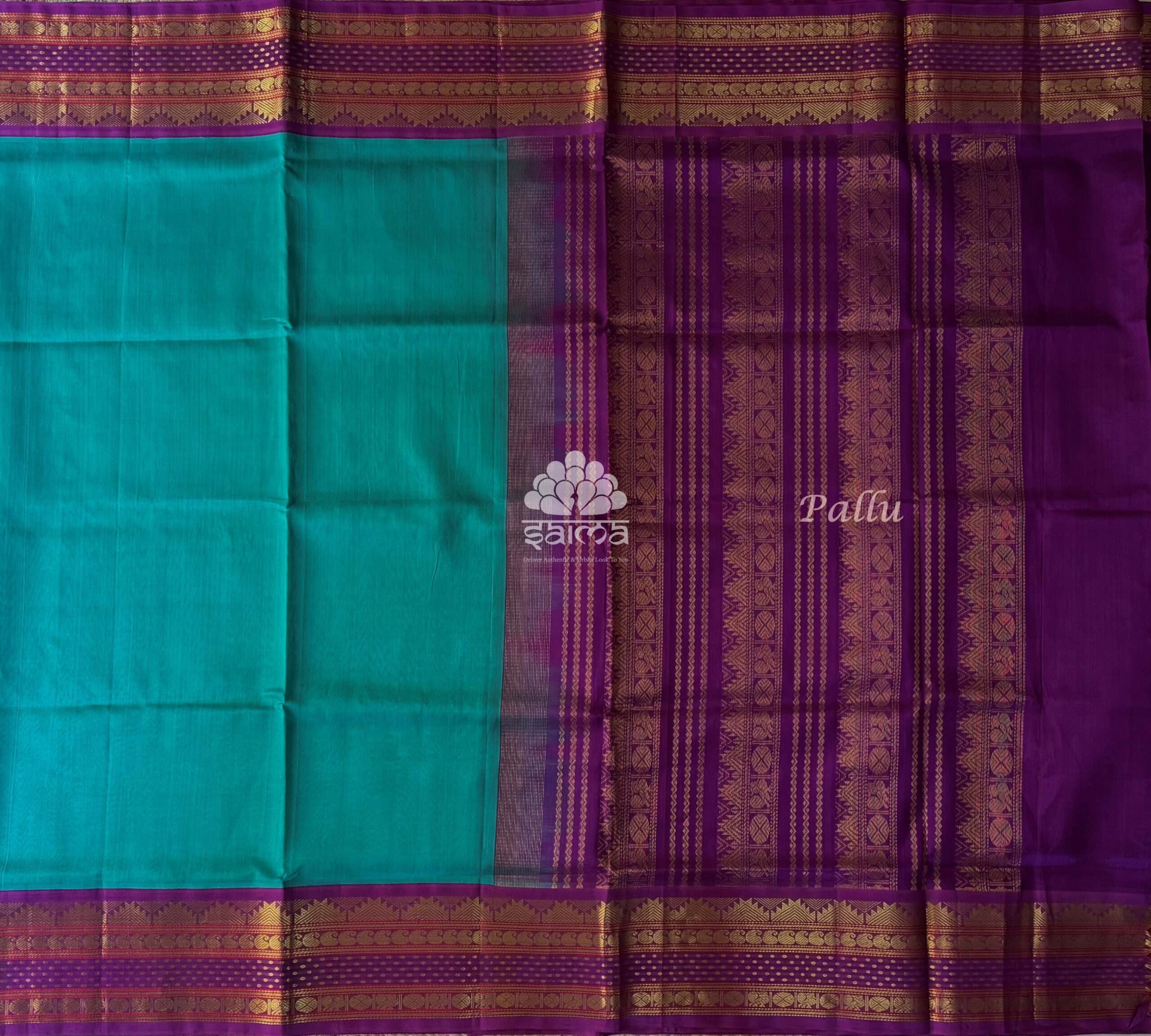 Kanchi korvai silk cotton in deep aqua blue having plain design and rich mango and zari bhuttas design korvai border. Pallu and blouse in magenta purple color.