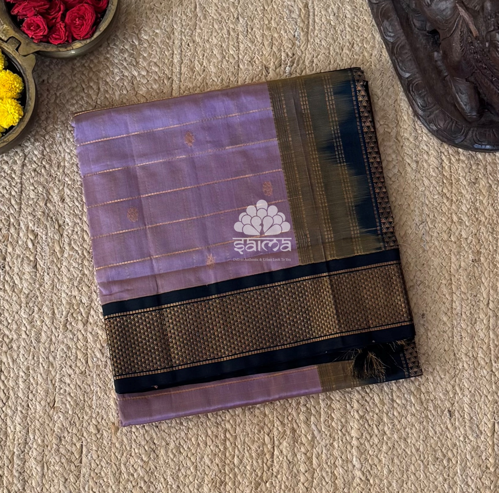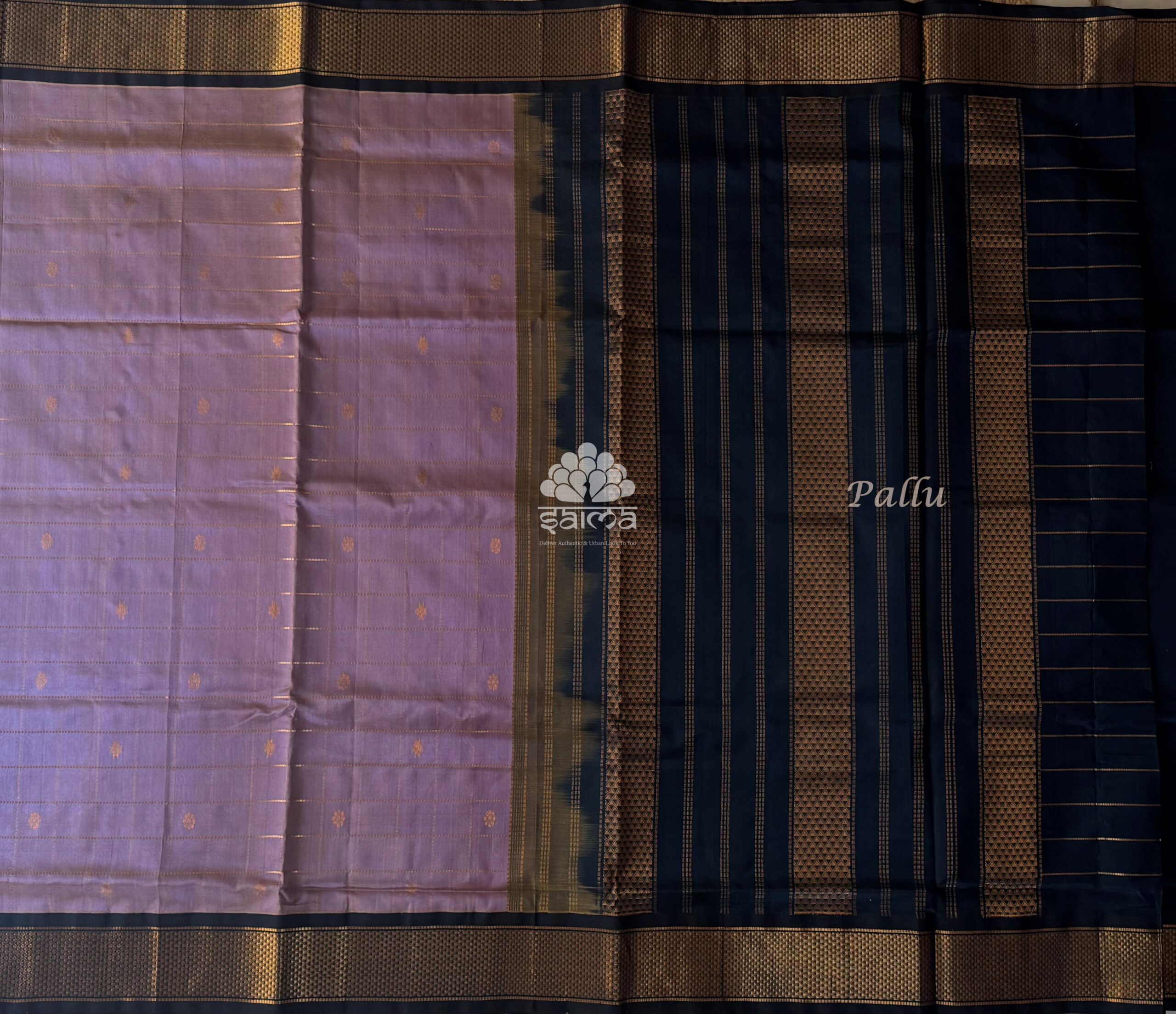 Kanchi korvai silk cotton in dusty lavender with teal undertone color having zari checks with bhuttas all over the saree and rich zari korvai design border. Pallu and blouse in karumpachai color.