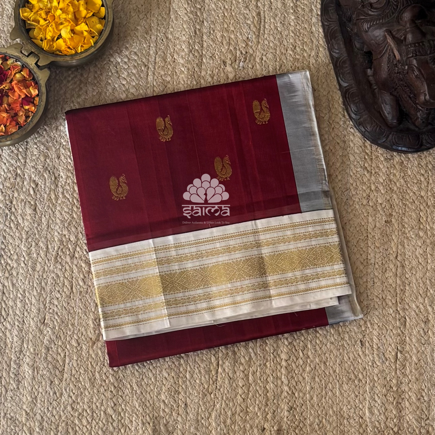 Kanchi korvai silk cotton in maroon color having mango bhuttas design all over the saree and rich annapakshi designed korvai border. Pallu and blouse in off white color.