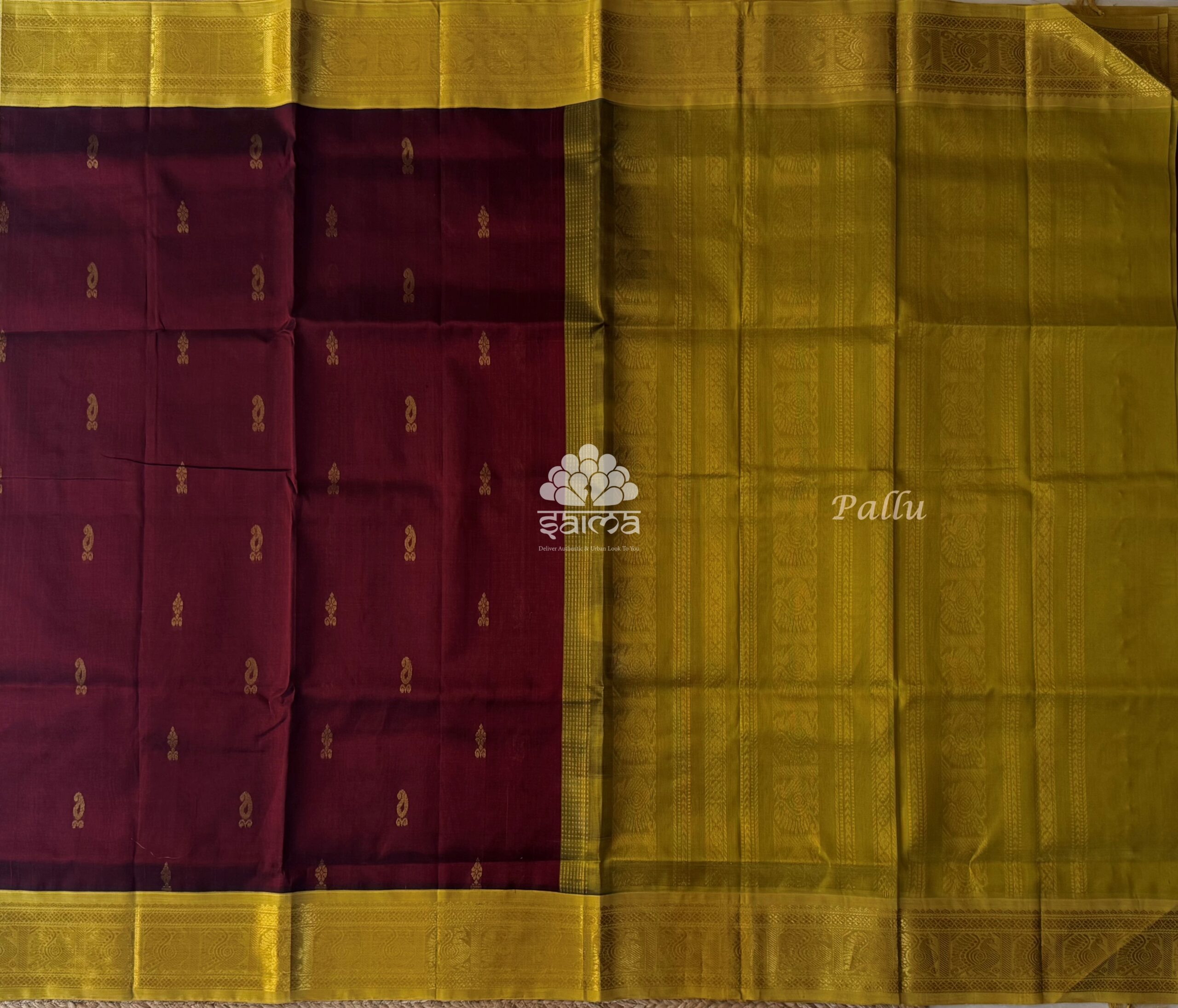 Kanchi korvai silk cotton in deep maroon color having small mango bhuttas all over the saree and rich annapakshi designed korvai border. Pallu and blouse in mustard green color.