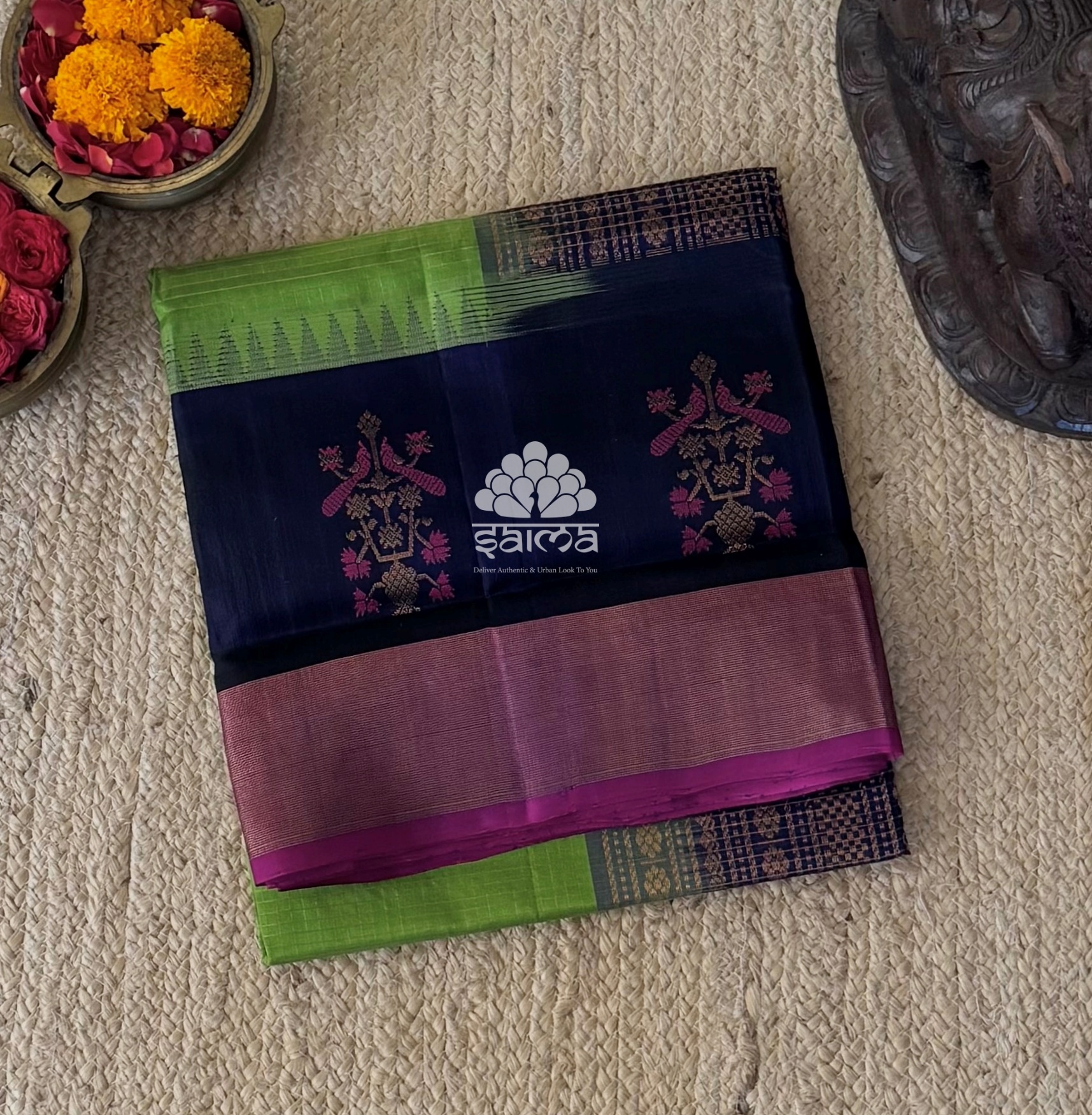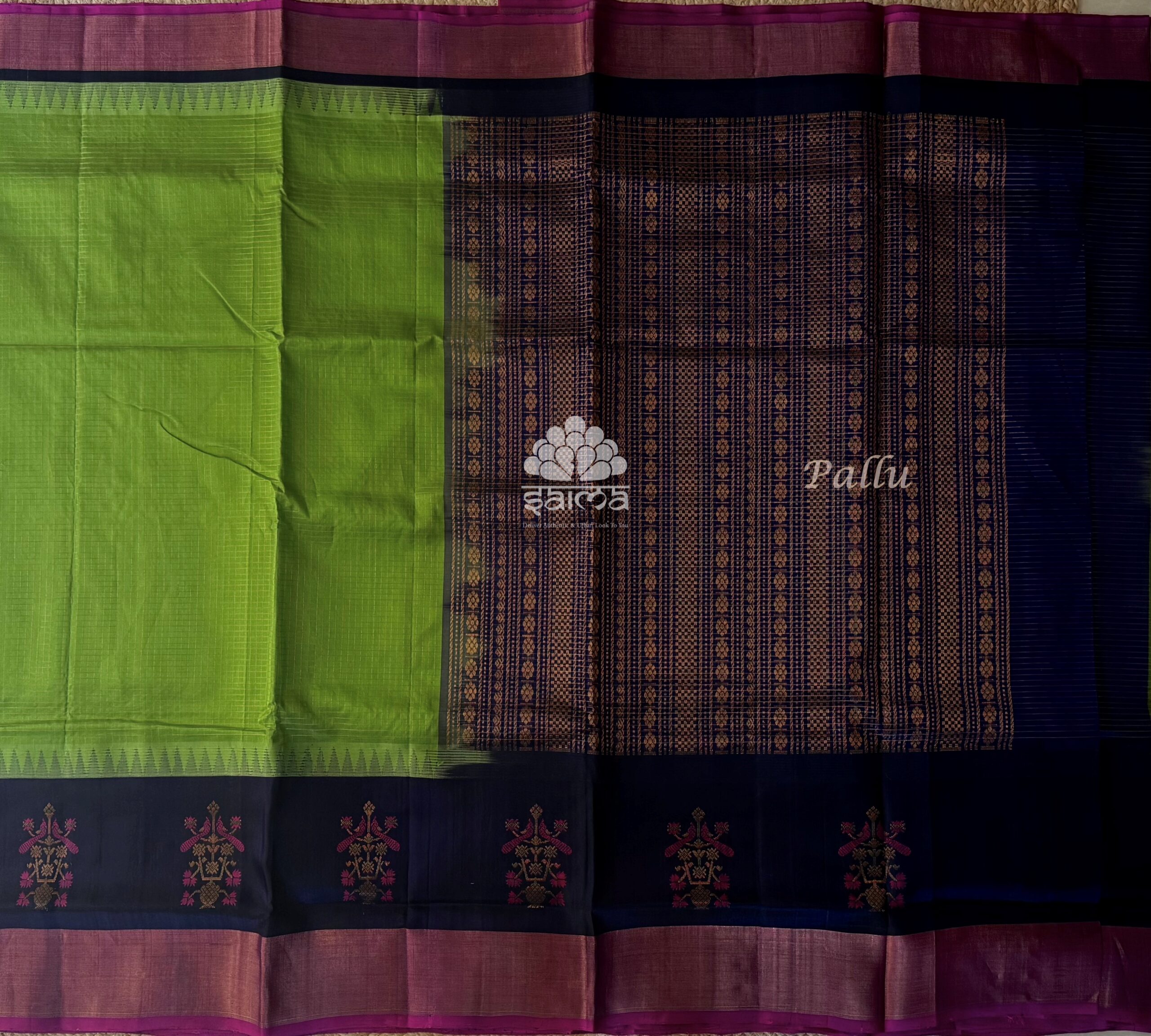 Kanchi silk cotton in leaf green color having elegant rich zari designed border. Pallu and blouse in running self color.