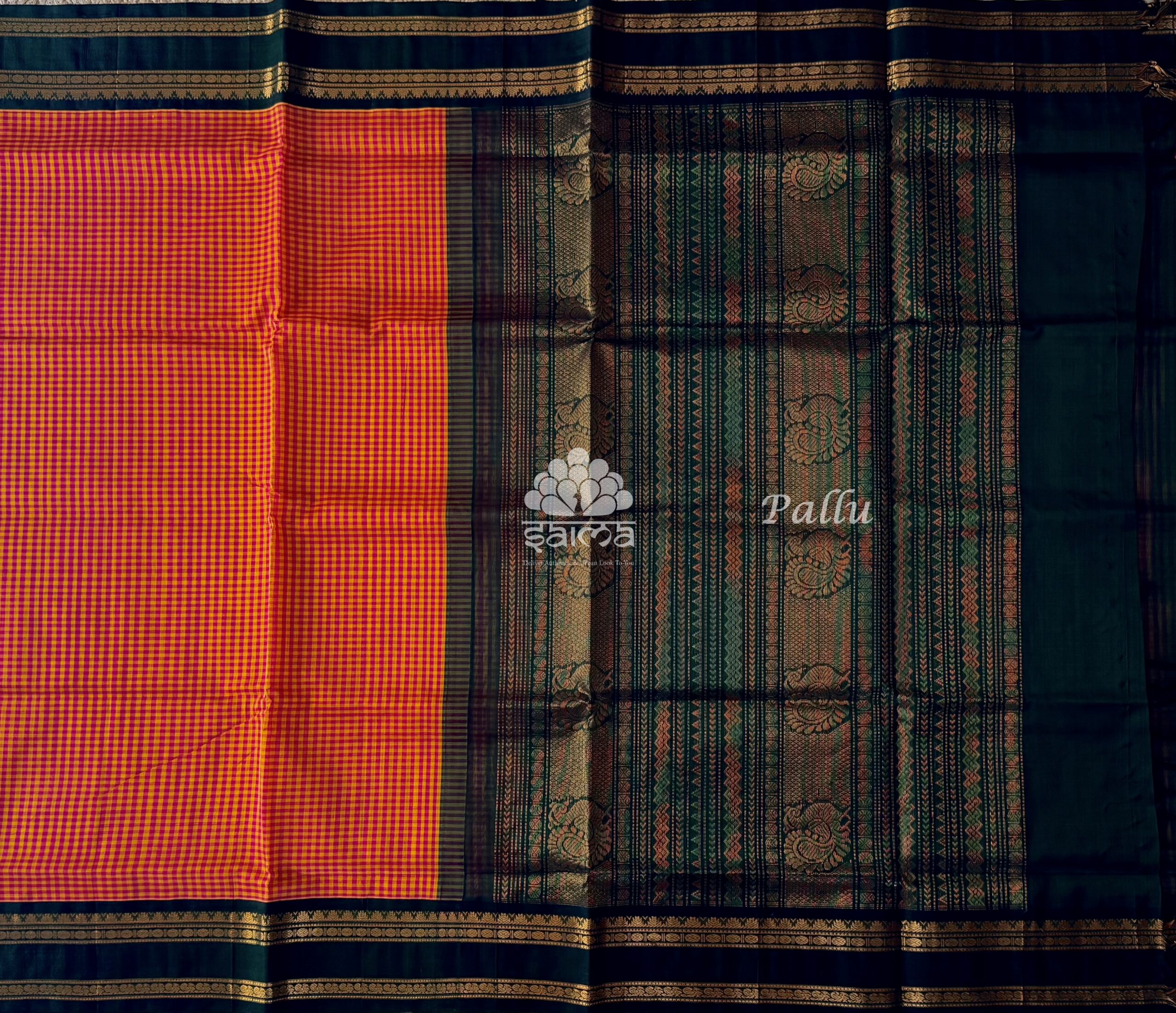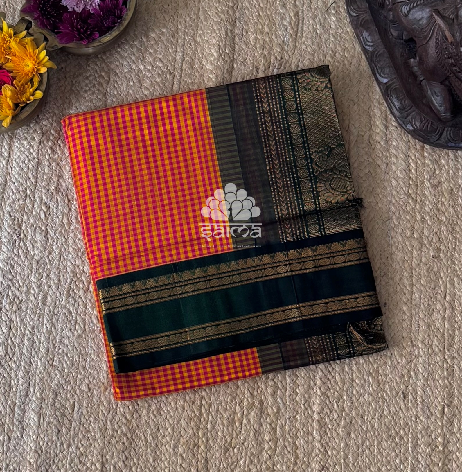 Kanchi korvai silk cotton in pink and yellow combo color having podi kattam design body and rettai pettu designed korvai border. Pallu and blouse in karumpachai color.