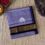 Deepavali Sale : Kanchi korvai silk cotton in off white and black combo color having podi kattam and annapakshi designed korvai border. Pallu and blouse in jewel purple color.