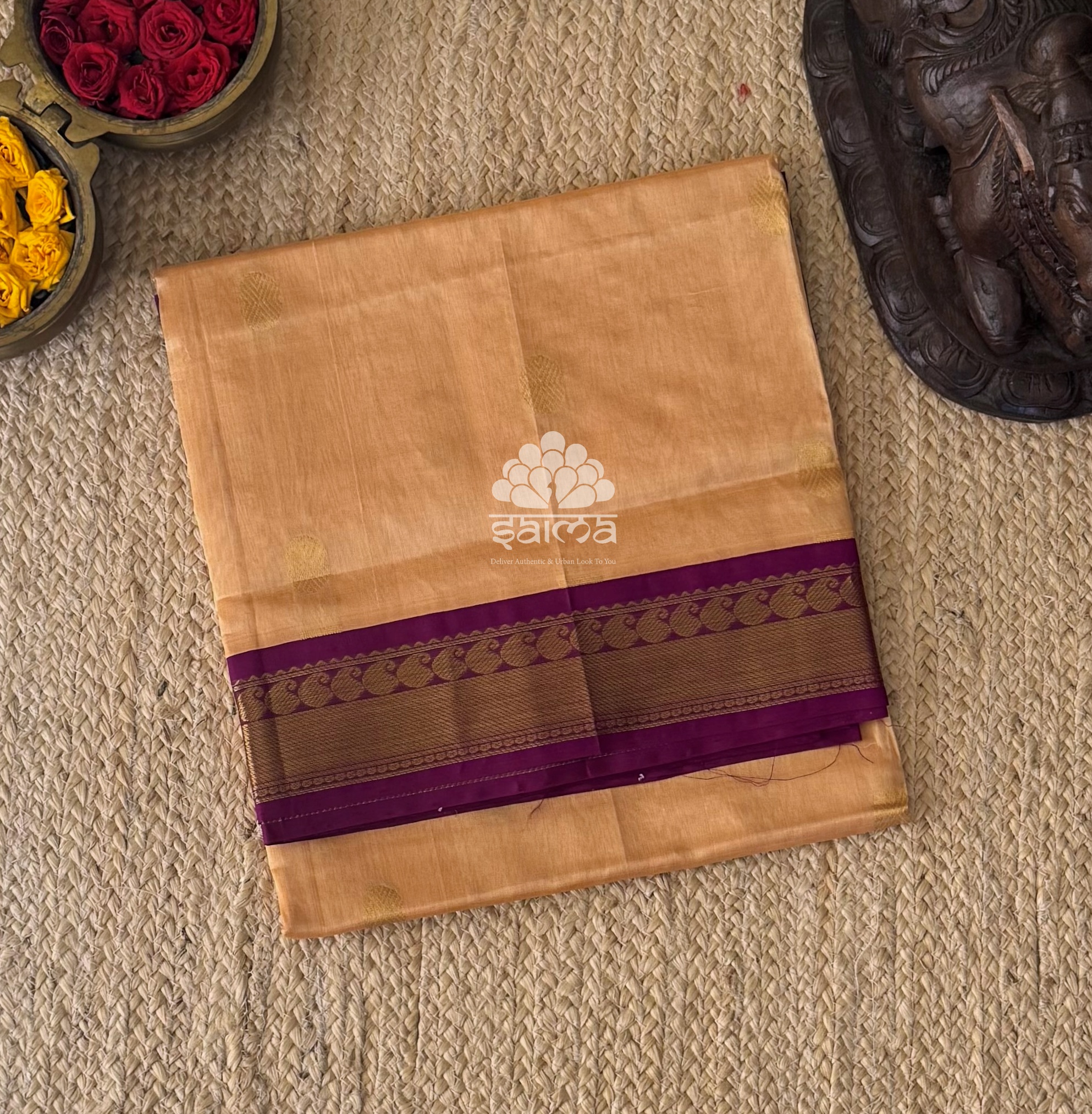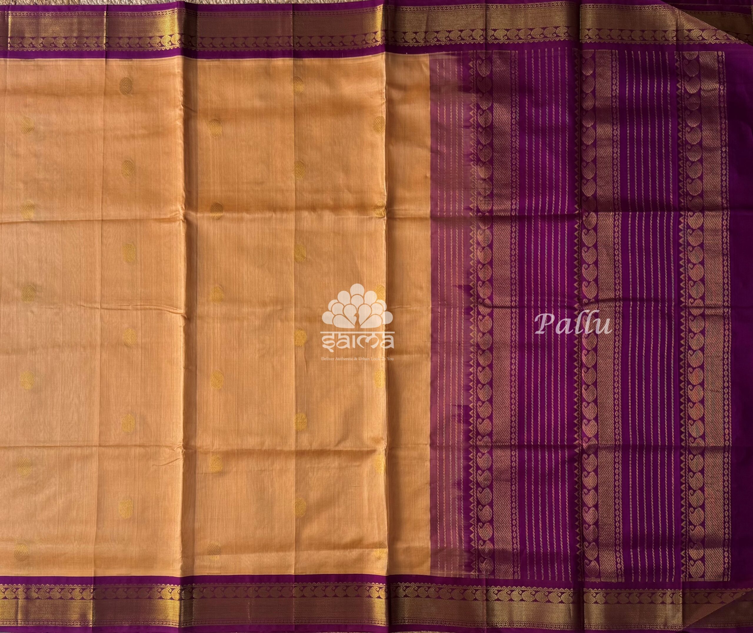 Kanchi korvai silk cotton in muted peach beige color and having polka bhuttas all over the saree and zari rich mango design korvai border. Pallu and blouse in purple color.