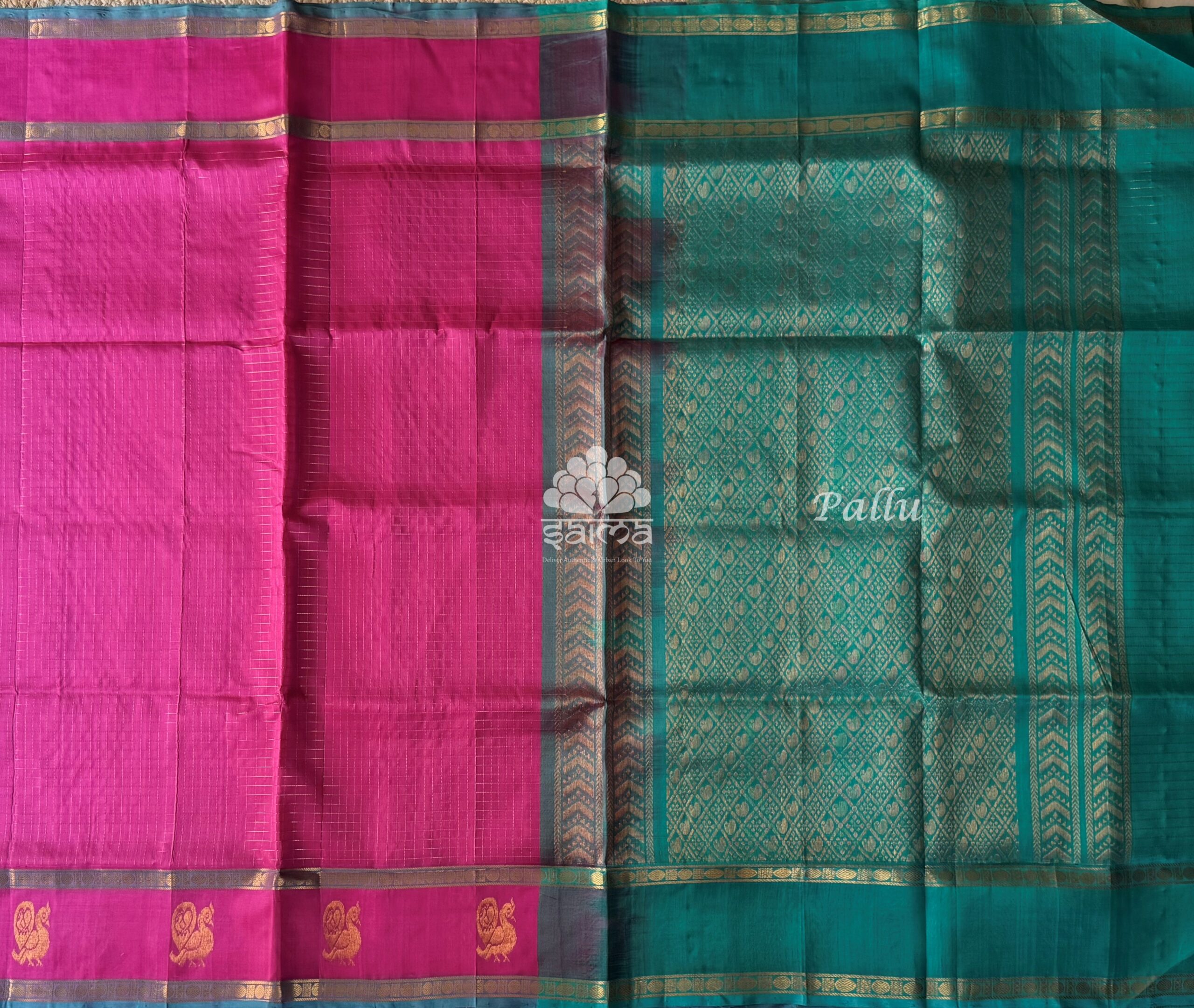Kanchi silk cotton in light fuchsia pink color having zari checks and annapakshi bhutta rettai pettu lower border and rettai pettu top border. Pallu and blouse in aqua blue green color.