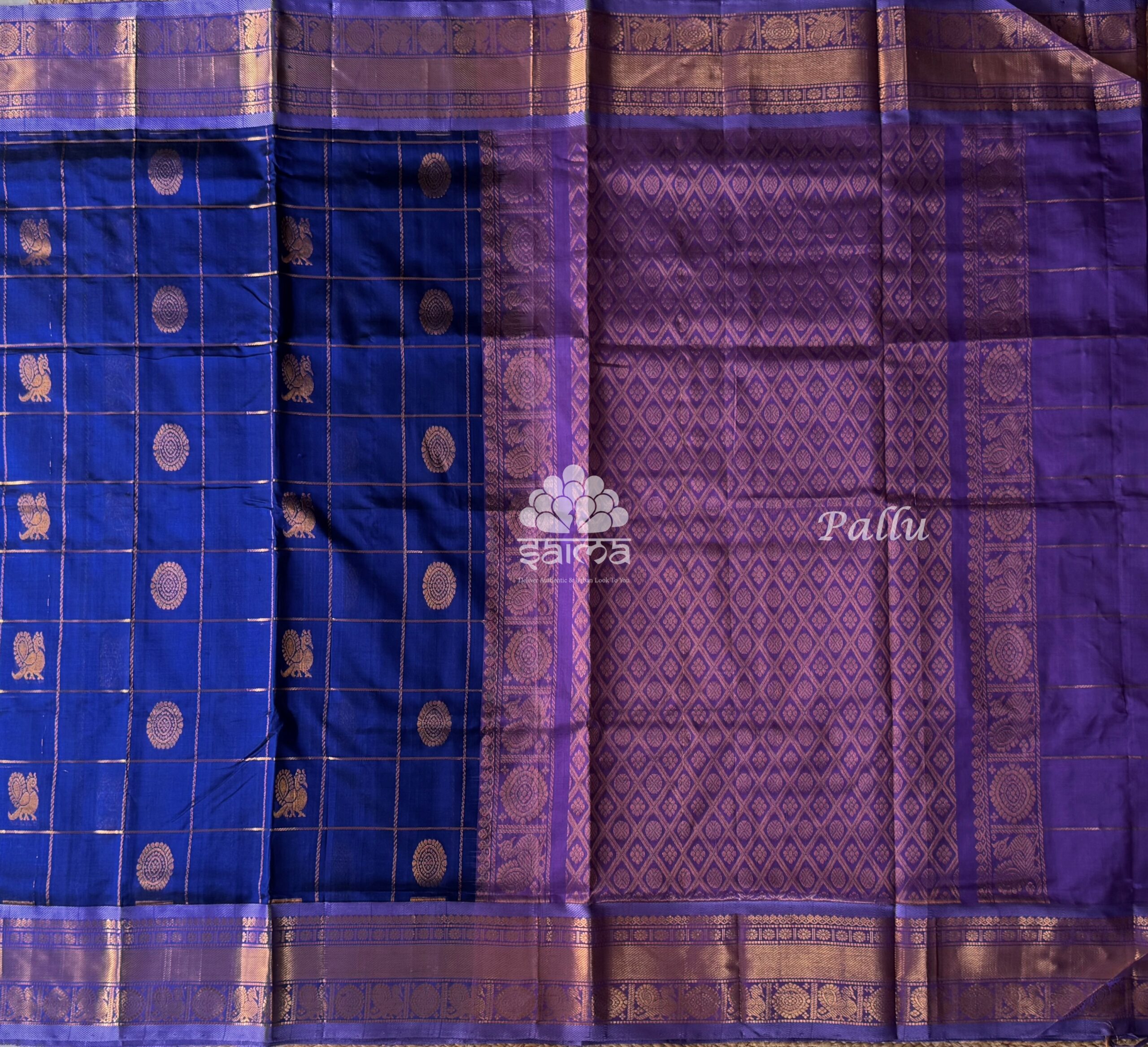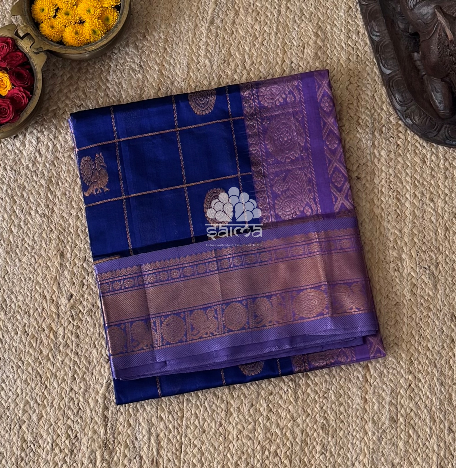 Kanchi silk cotton in navy blue color having zari kattam with annapakshi and chakram bhuttas body design and zari rich border. Pallu and blouse in lavender color.
