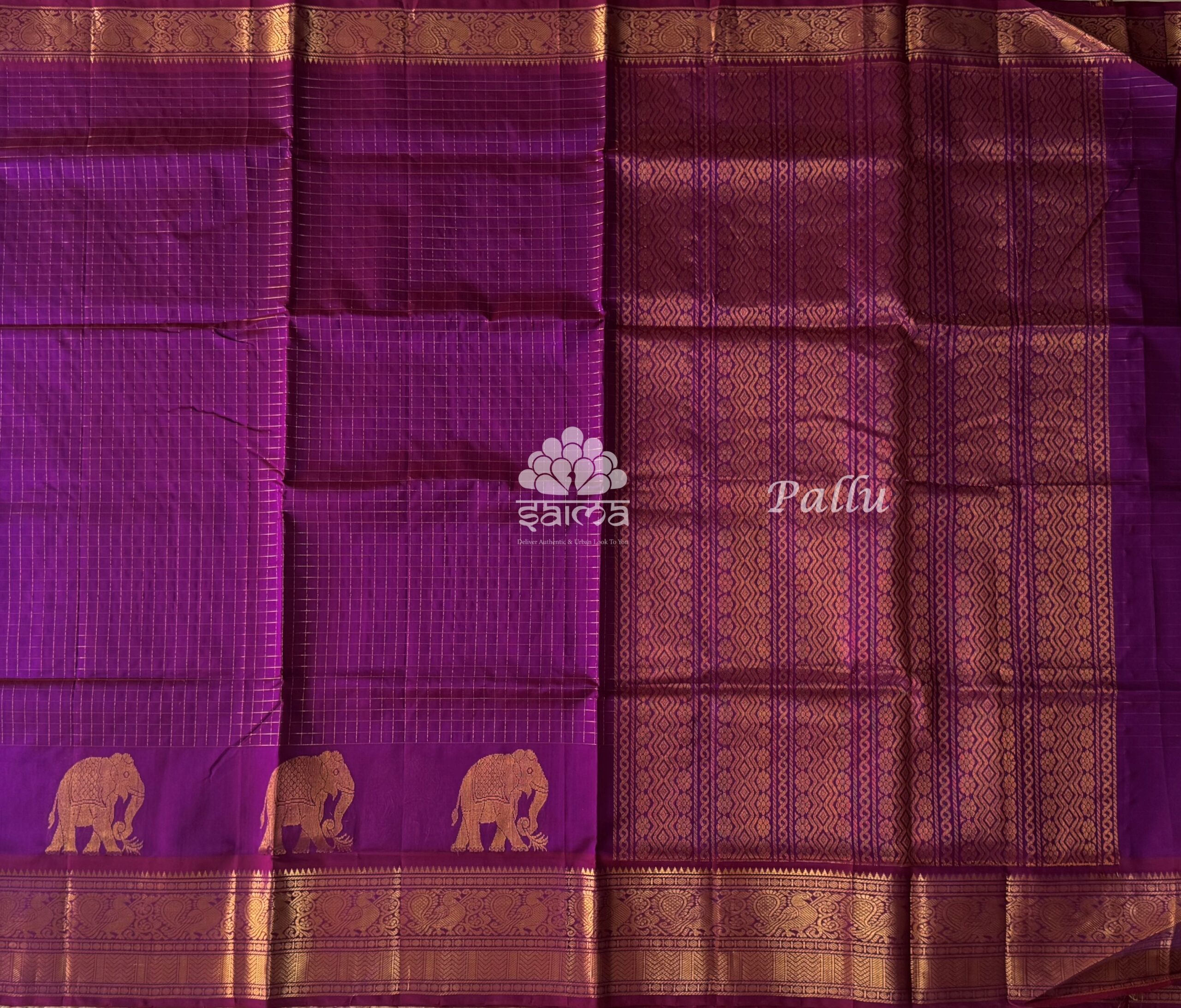 Kanchi silk cotton in vadamalli color having zari kattam all over the saree and yaanai bhutta at the lower kanchi designed border. Pallu and blouse in self color.