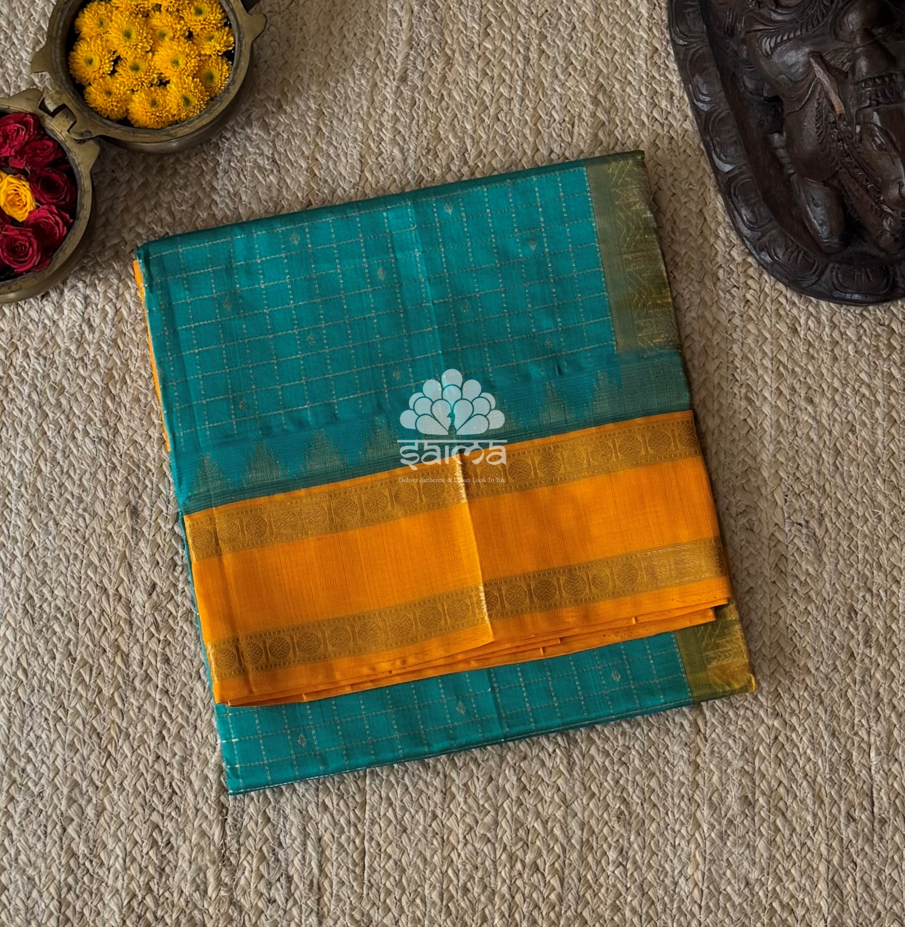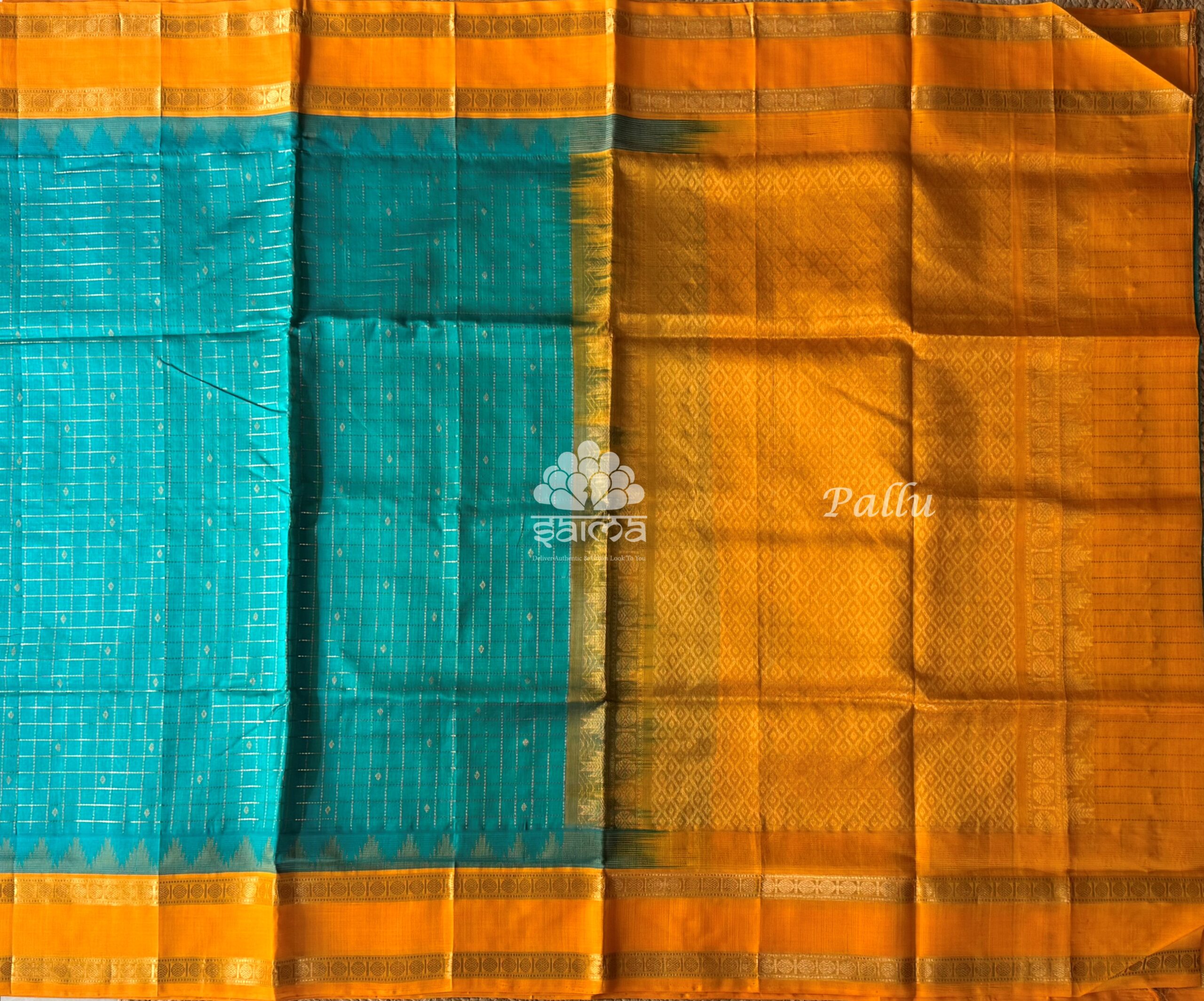 Kanchi korvai silk cotton in lagoon blue color having zari kattam with small bhuttas design body and rettai pettu with thazhampoo border. Pallu and blouse in marigold yellow color.