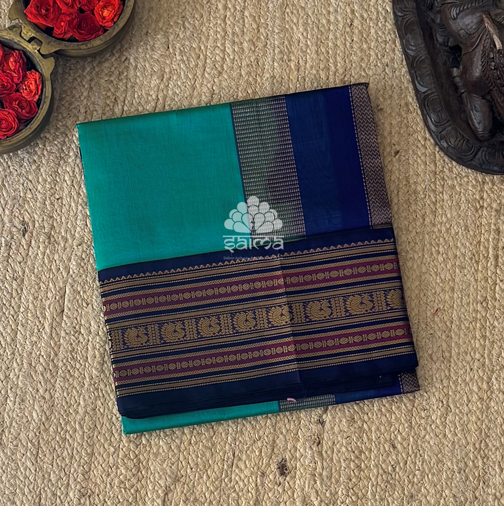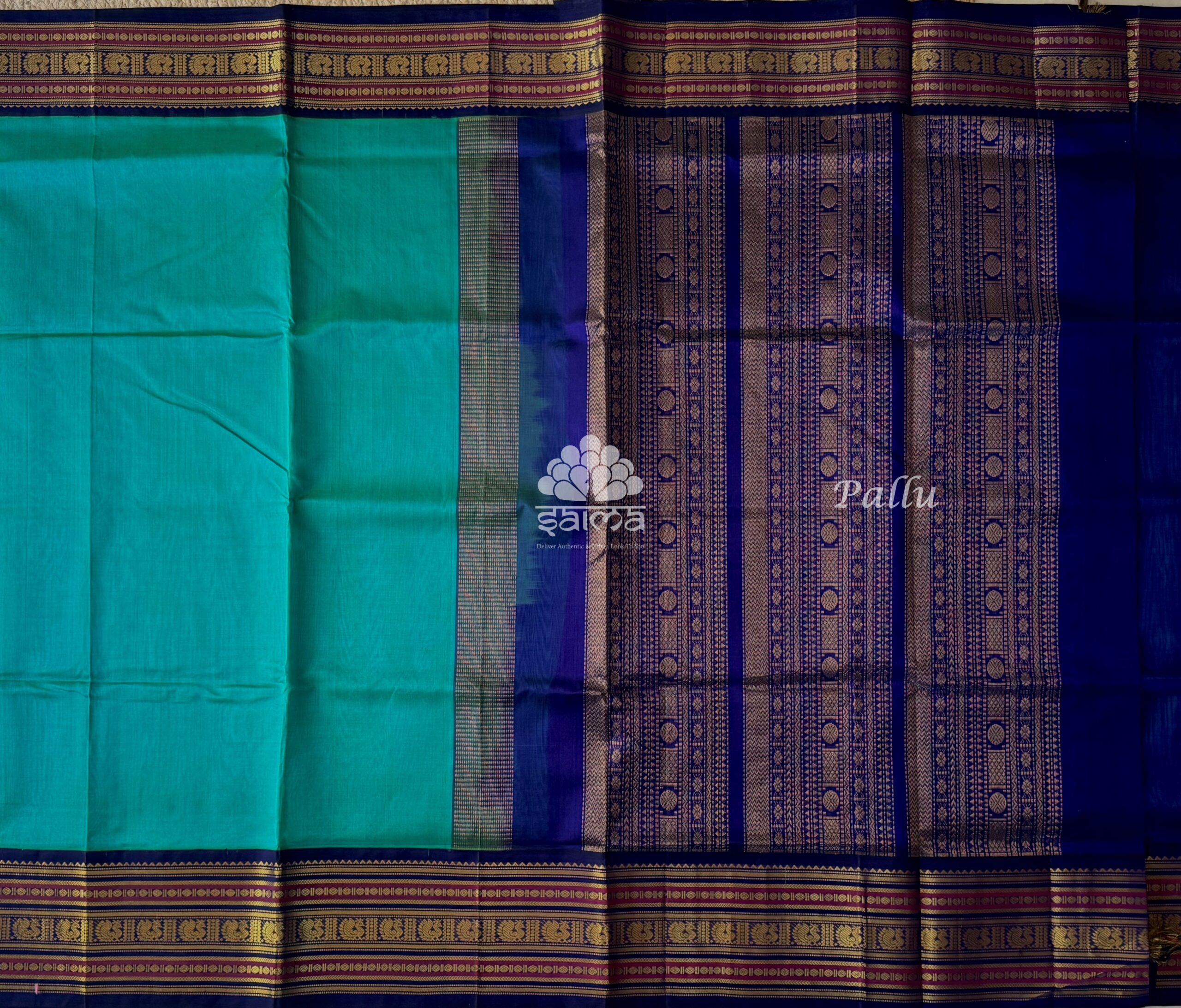Kanchi korvai silk cotton in soft golden undertone beige color having zari kattam with small bhuttas all over the saree design and annapakshi with small tazhampoo design korvai border. Pallu and blouse in karunilam shaded color.