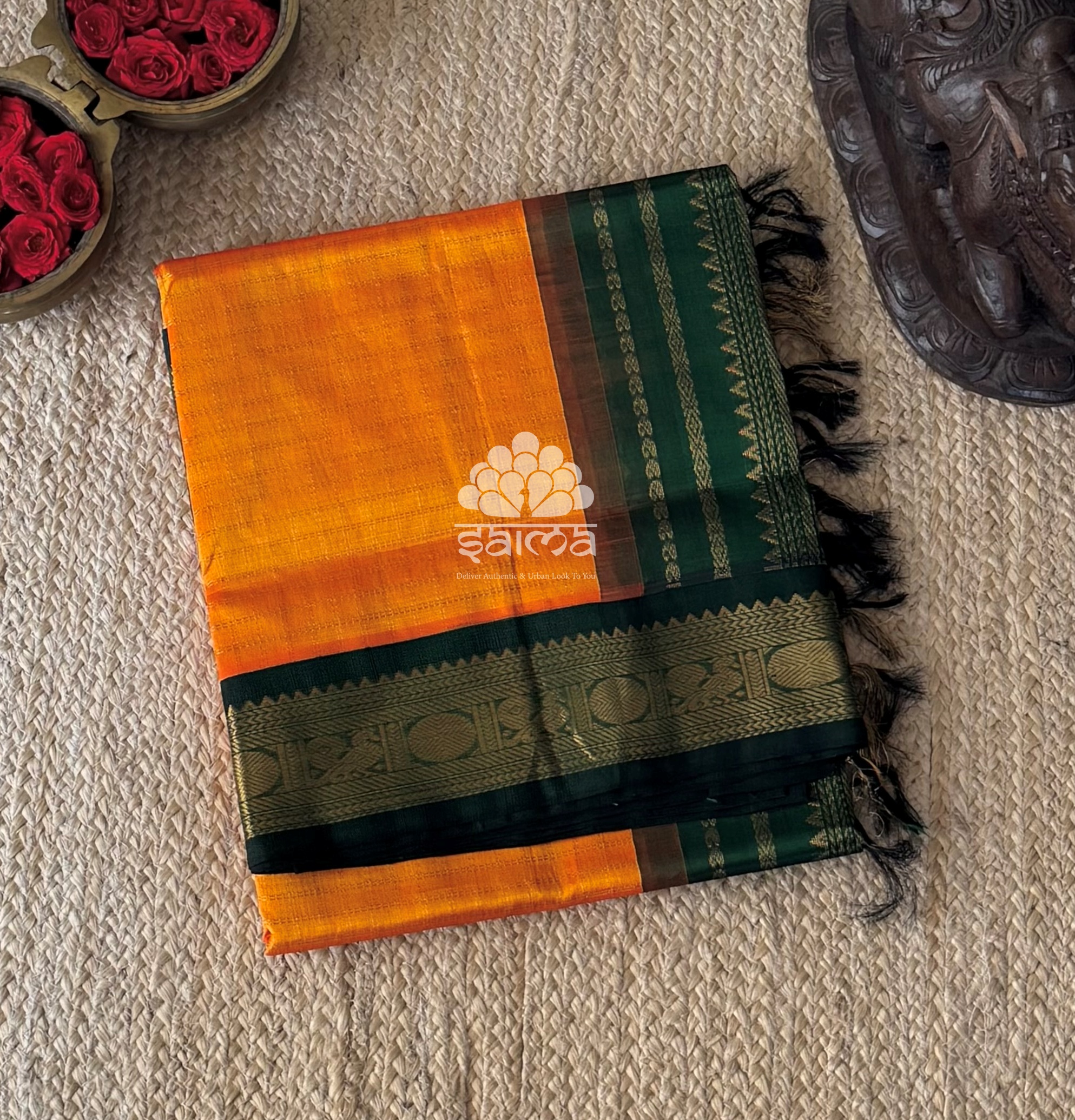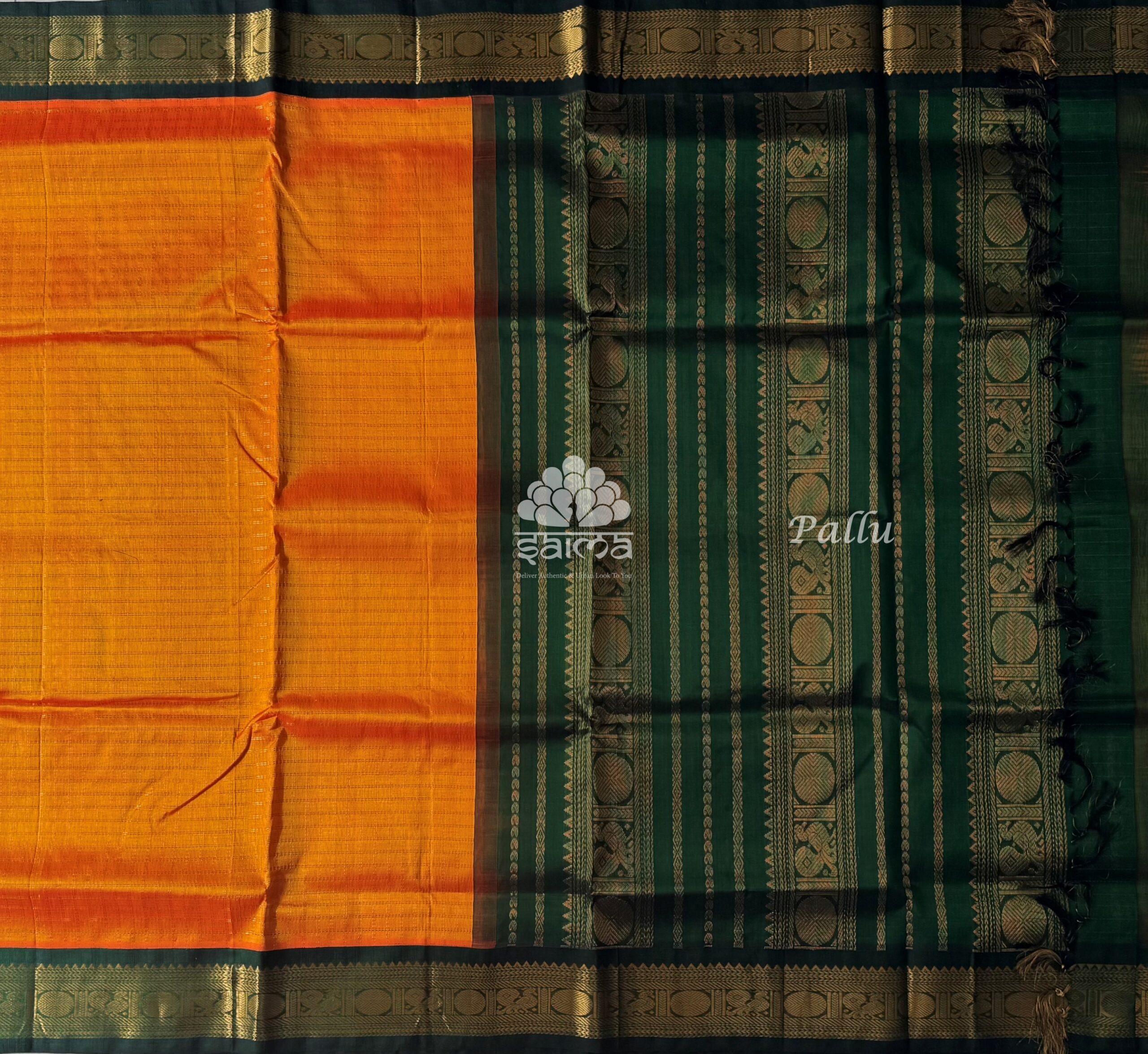 Kanchi korvai silk cotton in deep blue violet color having kattam design all over the saree and mango with zari design korvai border. Pallu and blouse in karumpachai color.