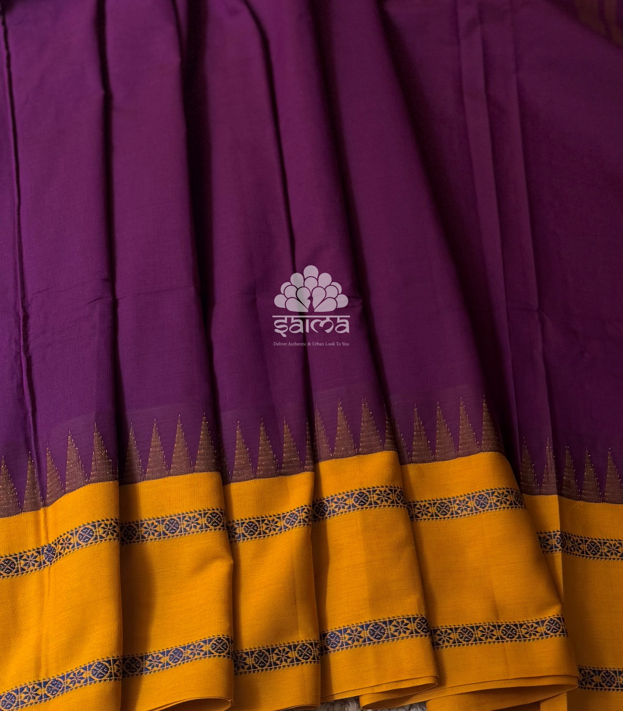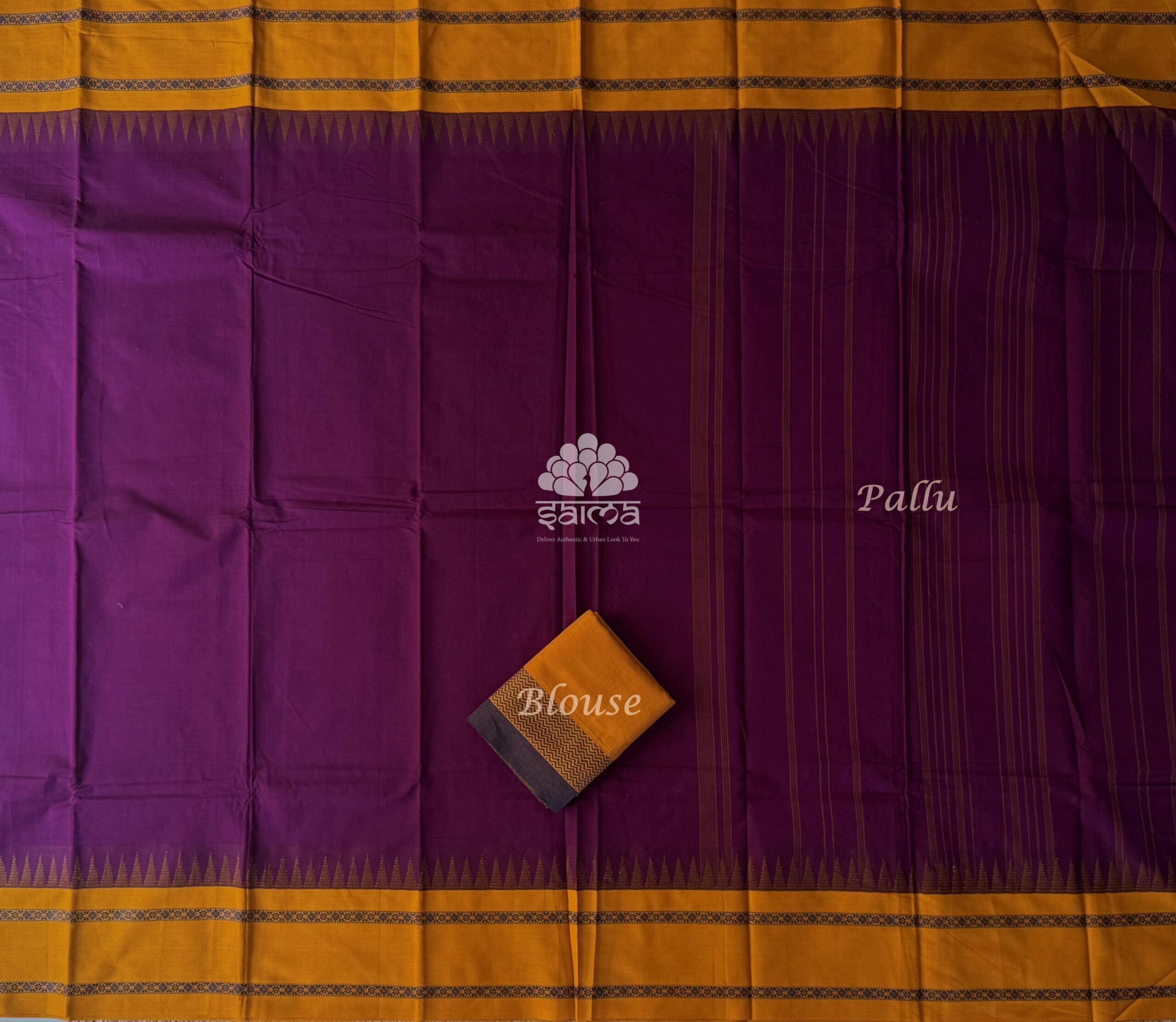 Premium chetti cotton in purple color having plain design and rettai pettu with temple design border. Saree has a running blouse yet attached silk cotton with self border design fabric as additional blouse.