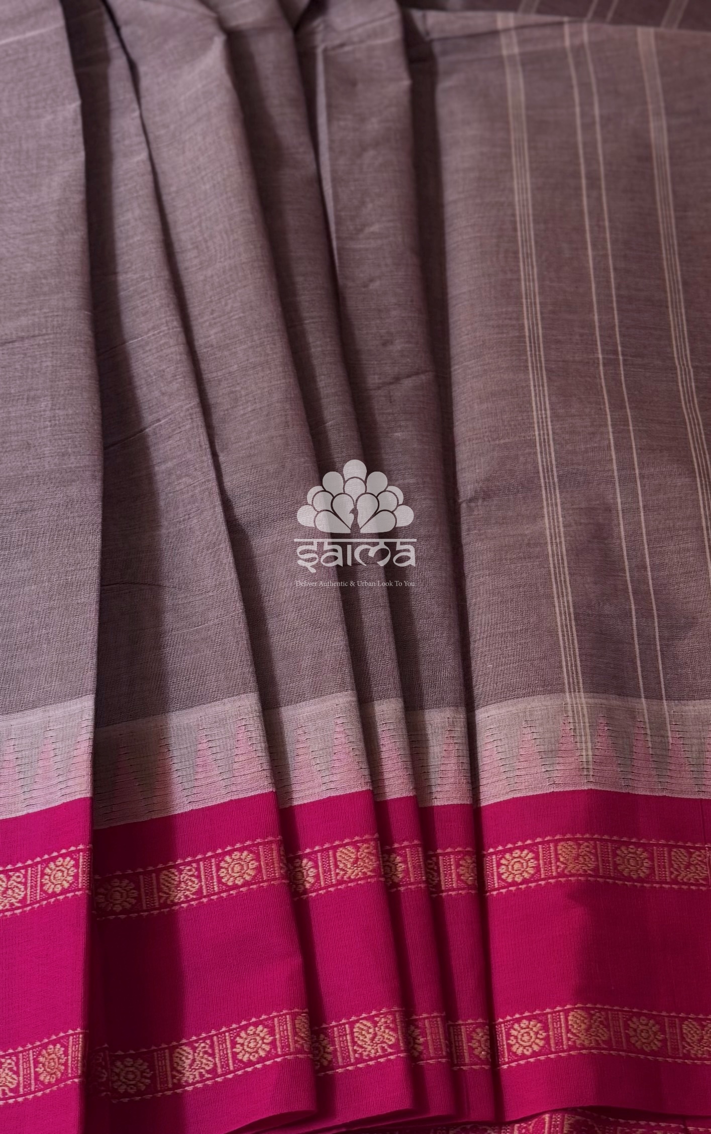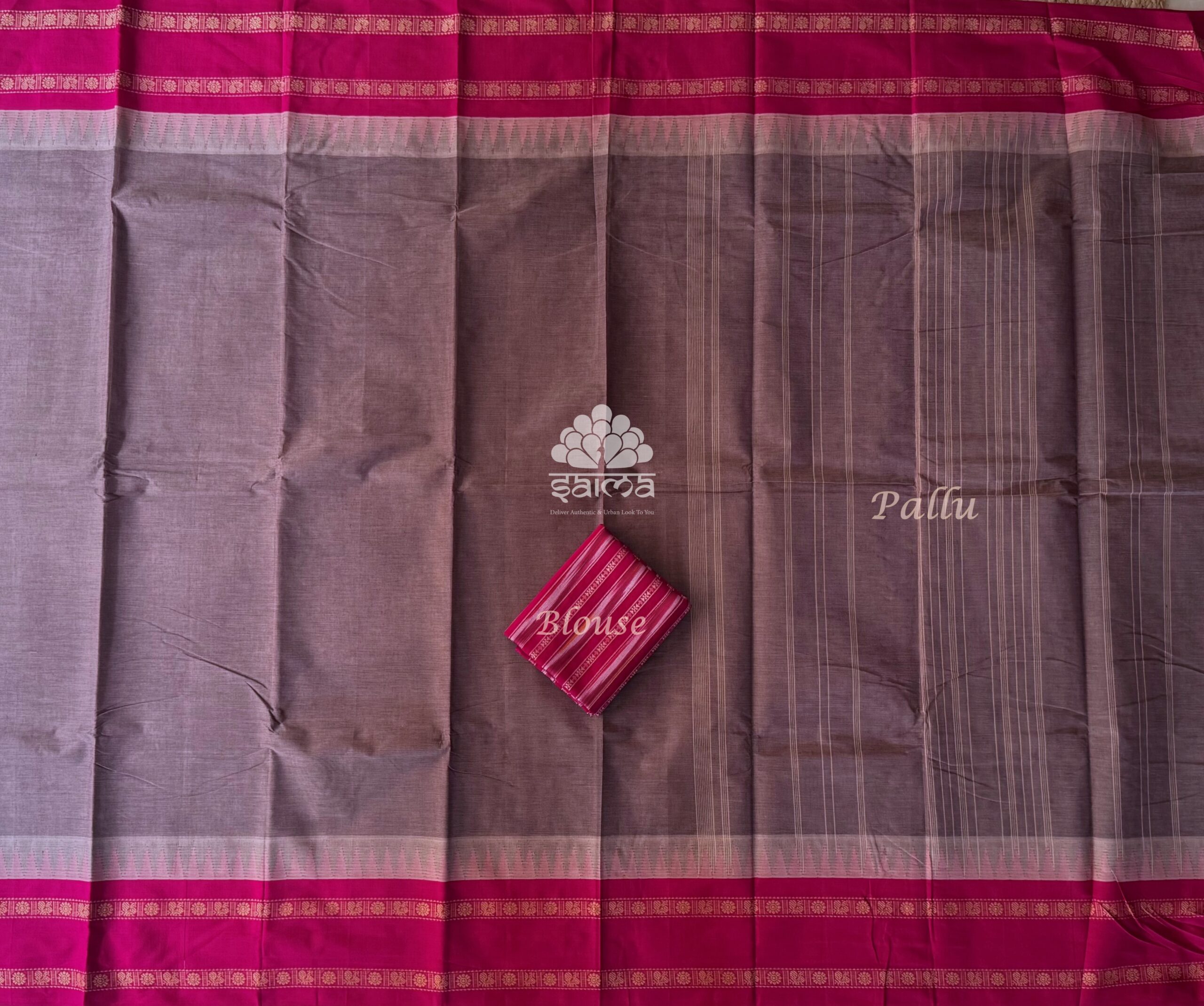 Premium chetti cotton in taupe grey shaded color having plain design and rettai pettu with temple design border. Saree has a running blouse yet attached silk cotton with unique design fabric as additional blouse.