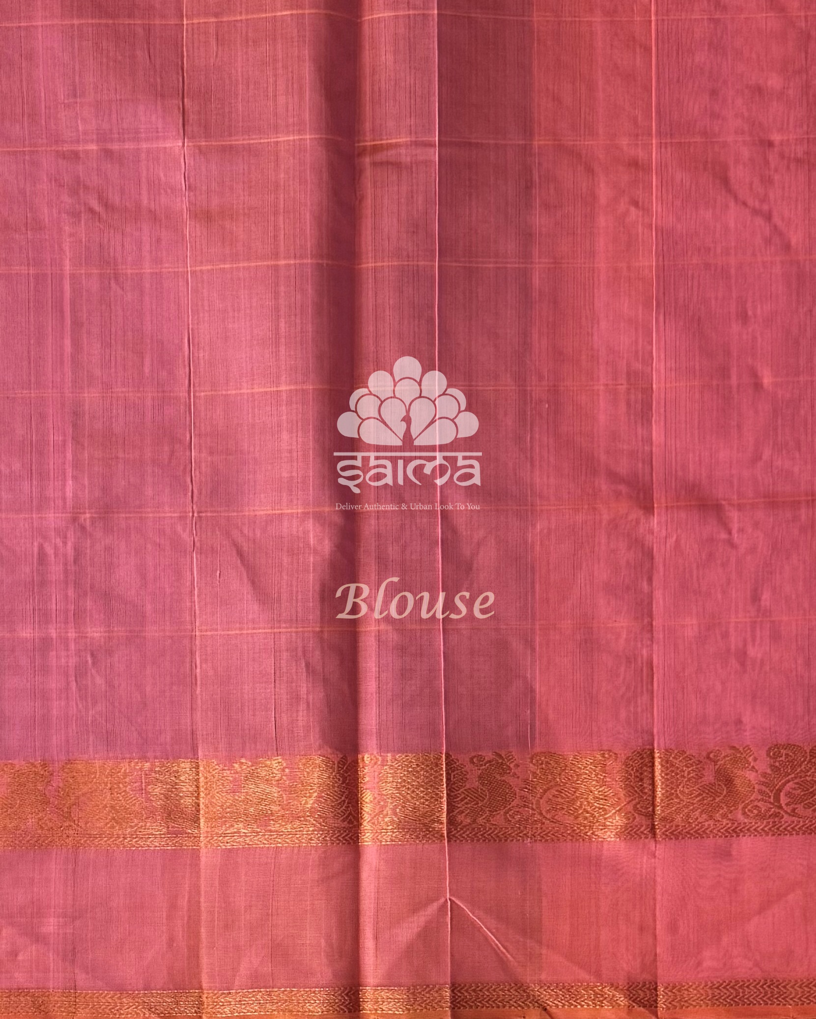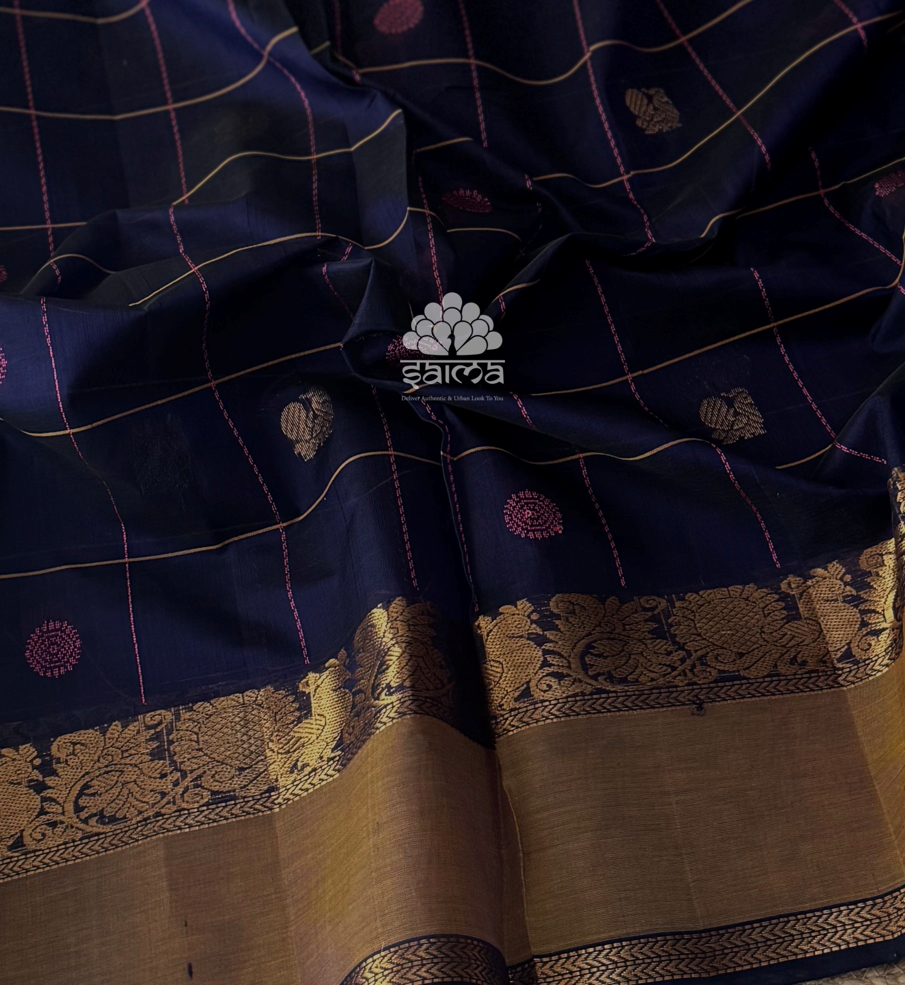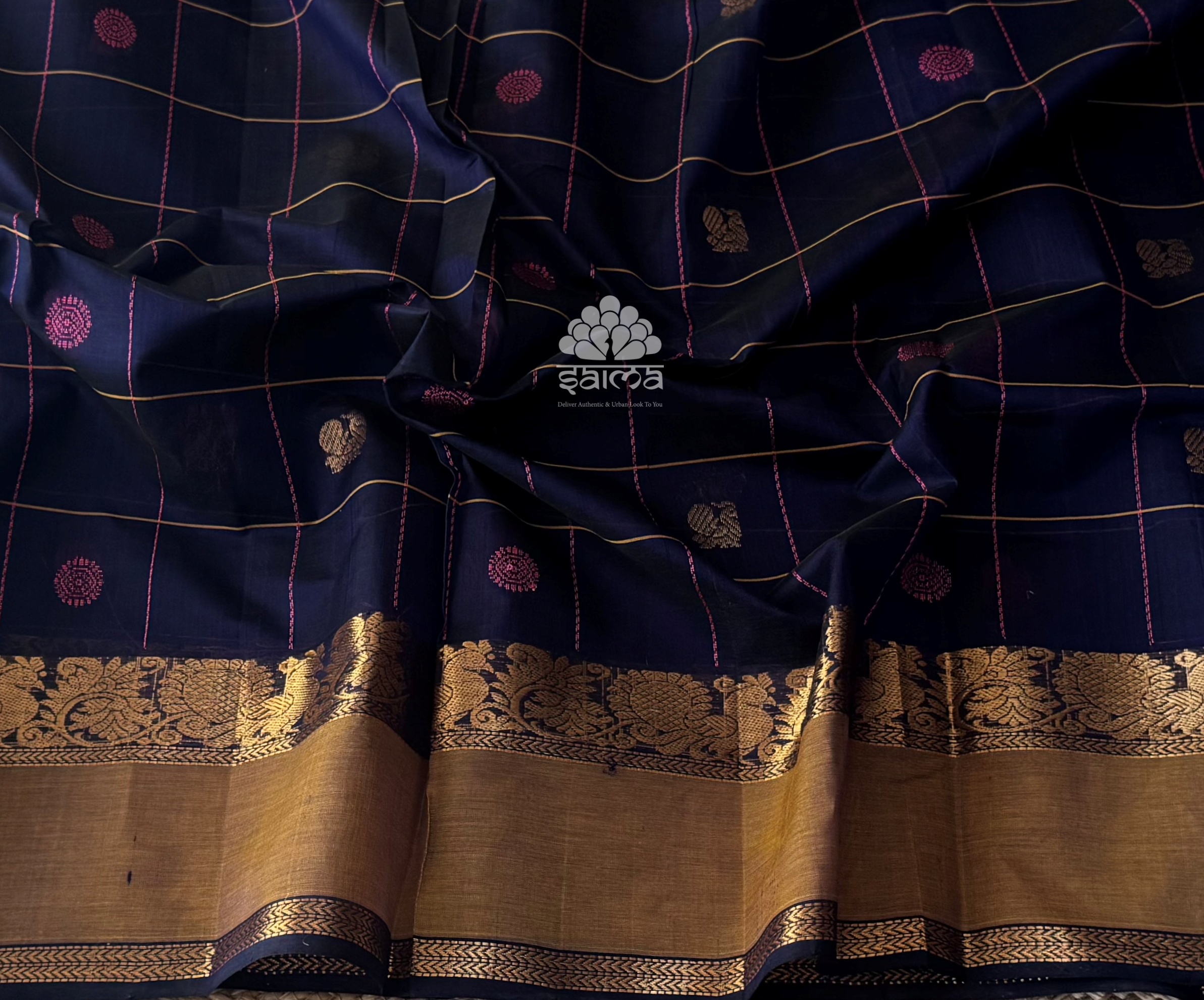 Kanchi silk cotton in deep navy blue shaded color having thread checks bhuttas design all over the saree and annapakshi design border. Pallu and blouse in warm rosie pink color.