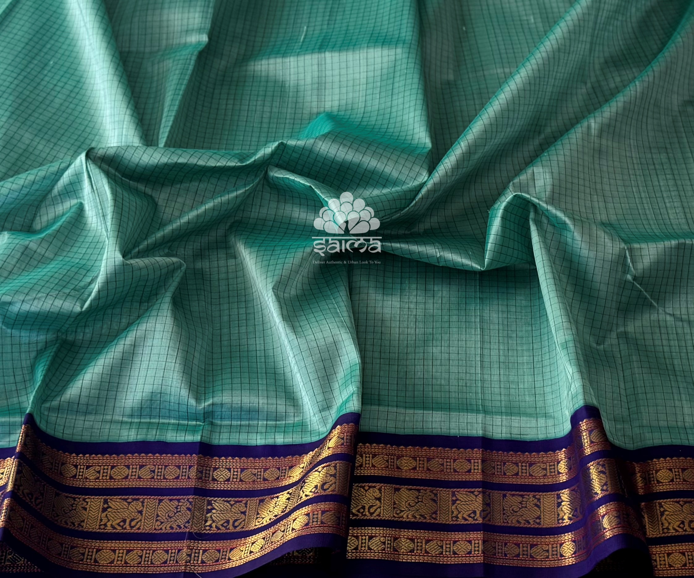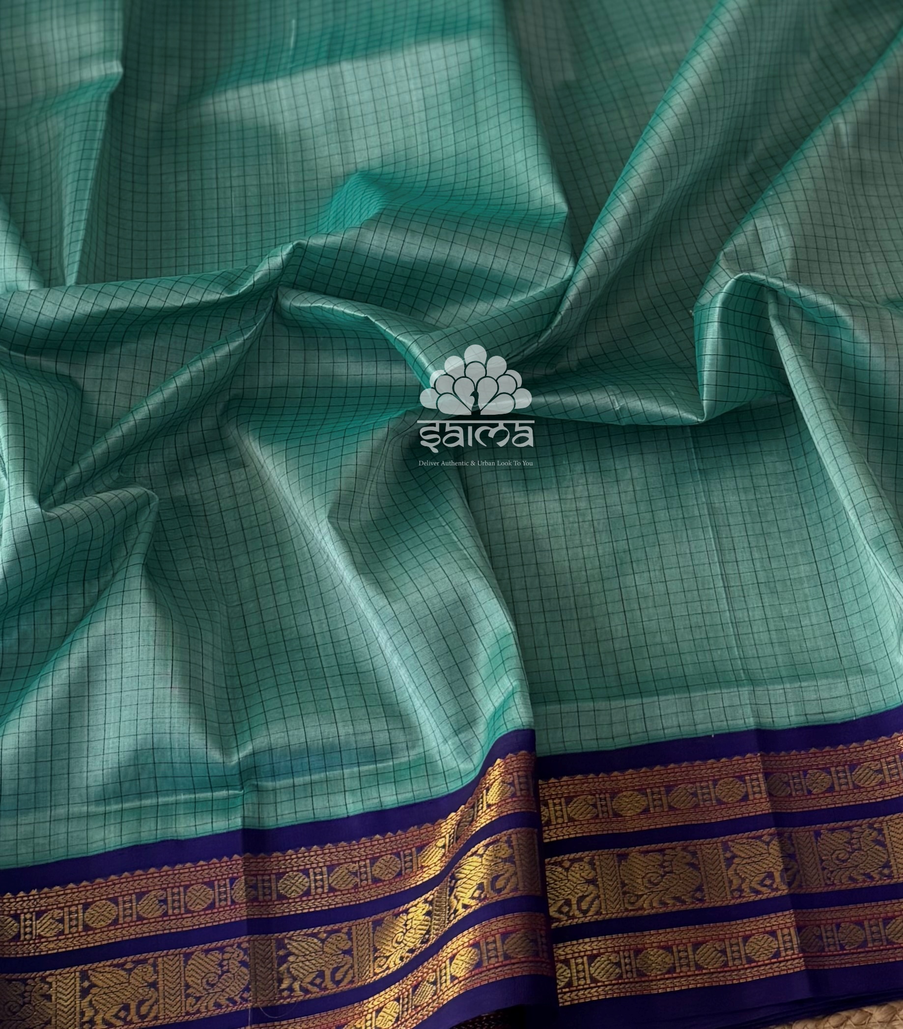 Kanchi korvai silk cotton in aqua blue color having thread checks design all over the saree and rich annapakshi, mango with coin designed korvai border. Pallu and blouse in ink blue color.