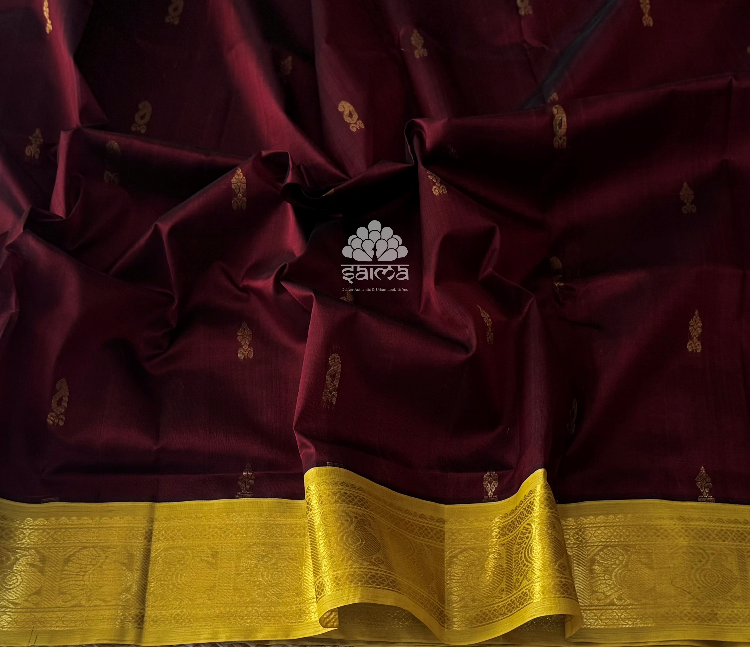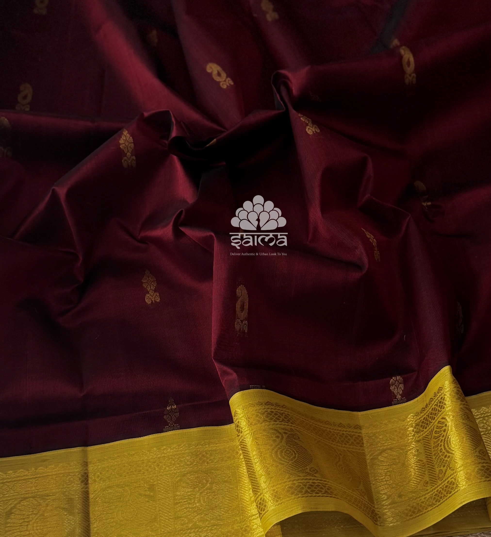 Kanchi korvai silk cotton in deep maroon color having small mango bhuttas all over the saree and rich annapakshi designed korvai border. Pallu and blouse in mustard green color.