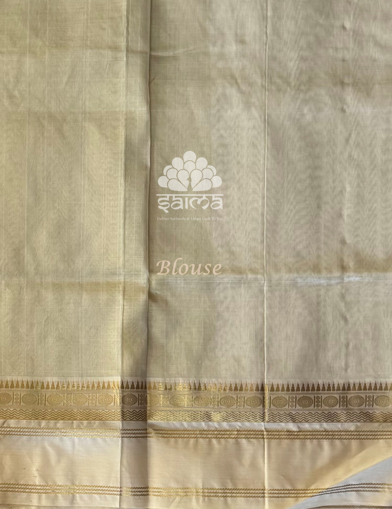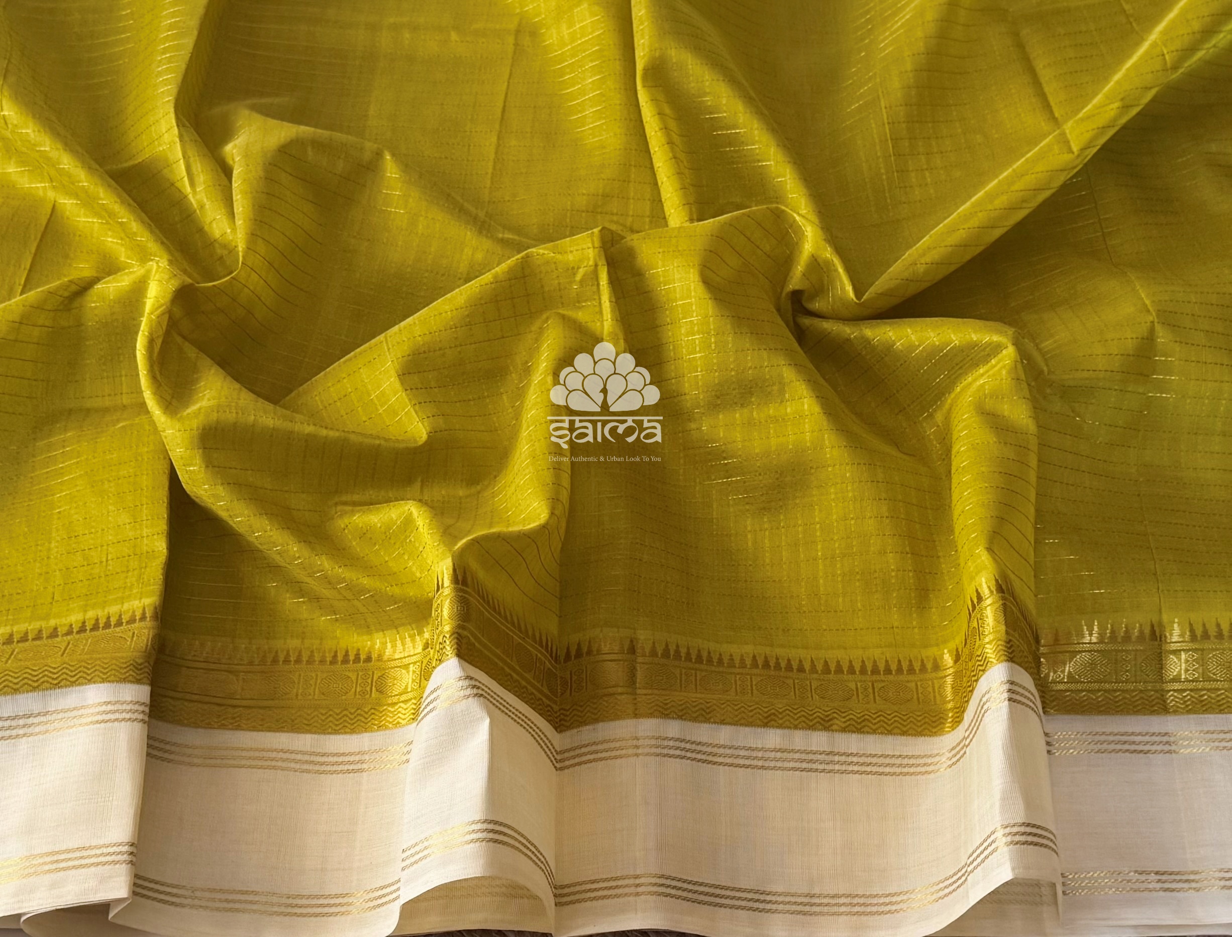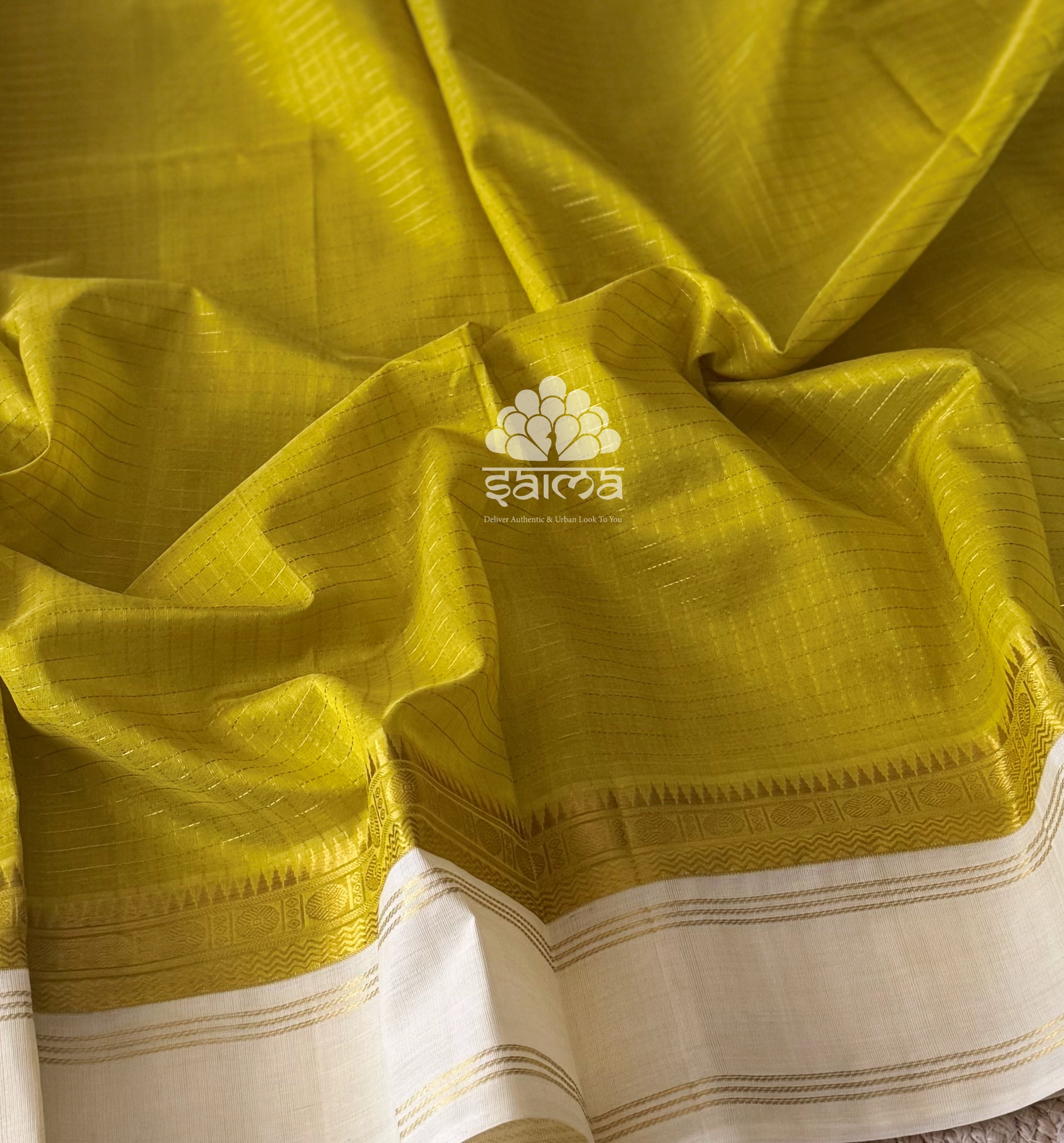 Kanchi korvai silk cotton in raw mango yellow color having zari kattam design all over the saree and rich korvai designed border. Pallu and blouse in ivory shaded color.