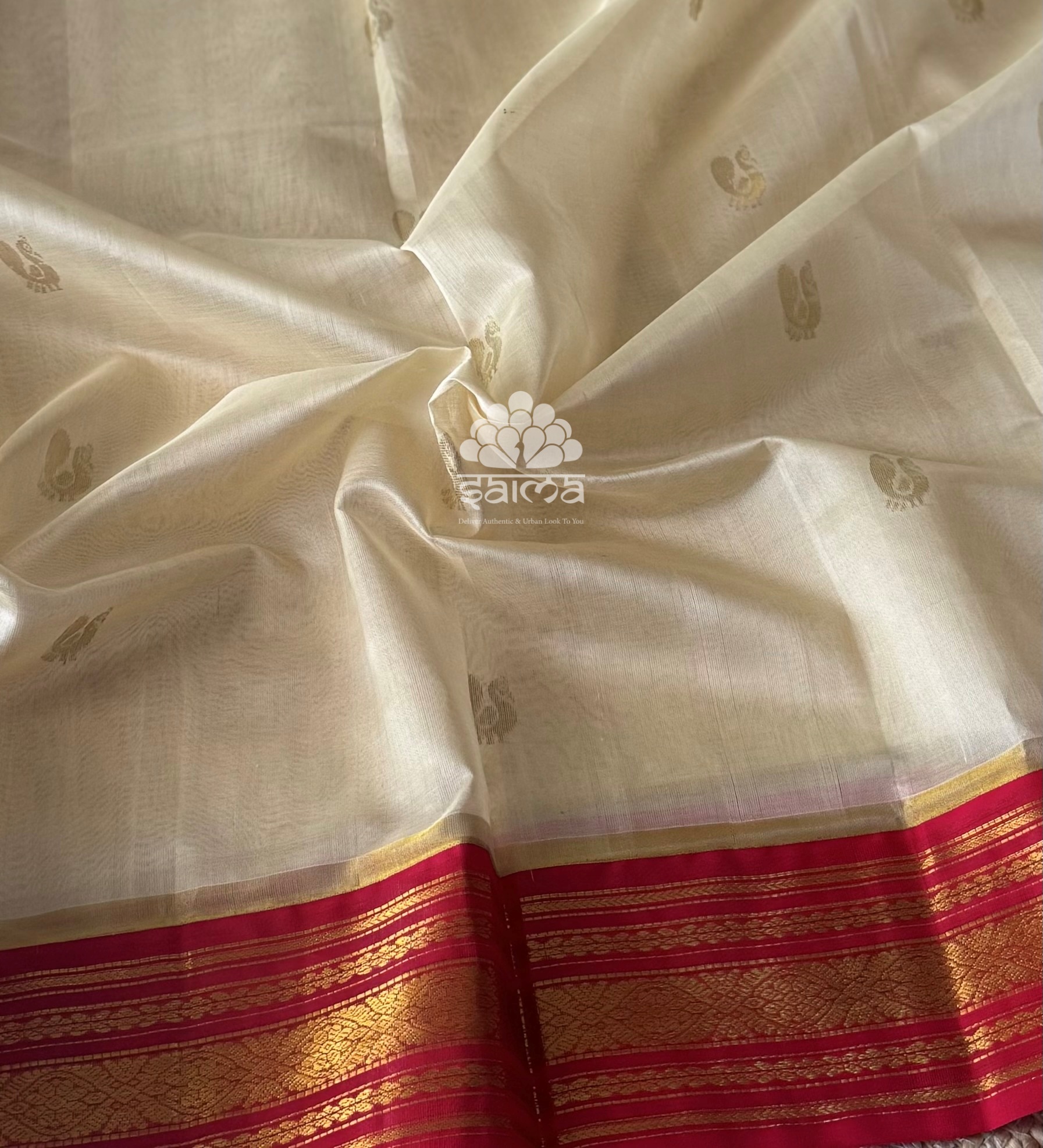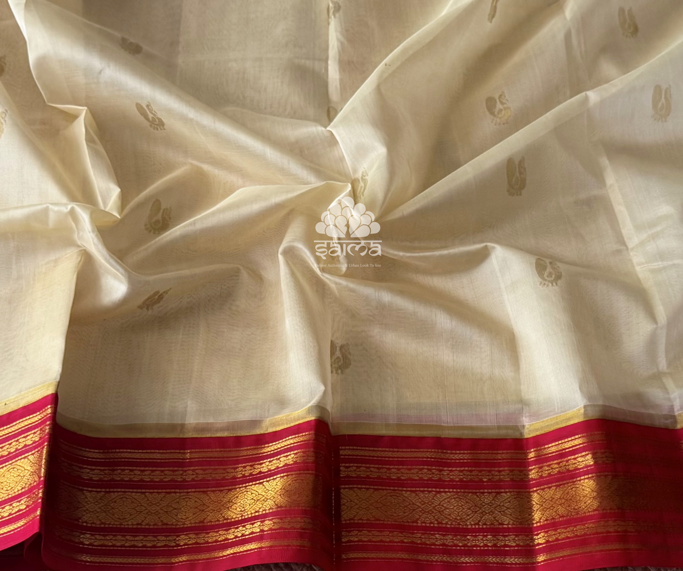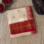 Kanchi korvai silk cotton in off white color having annapakshi bhuttas design all over the saree and rich floral design border. Pallu and blouse in red color.