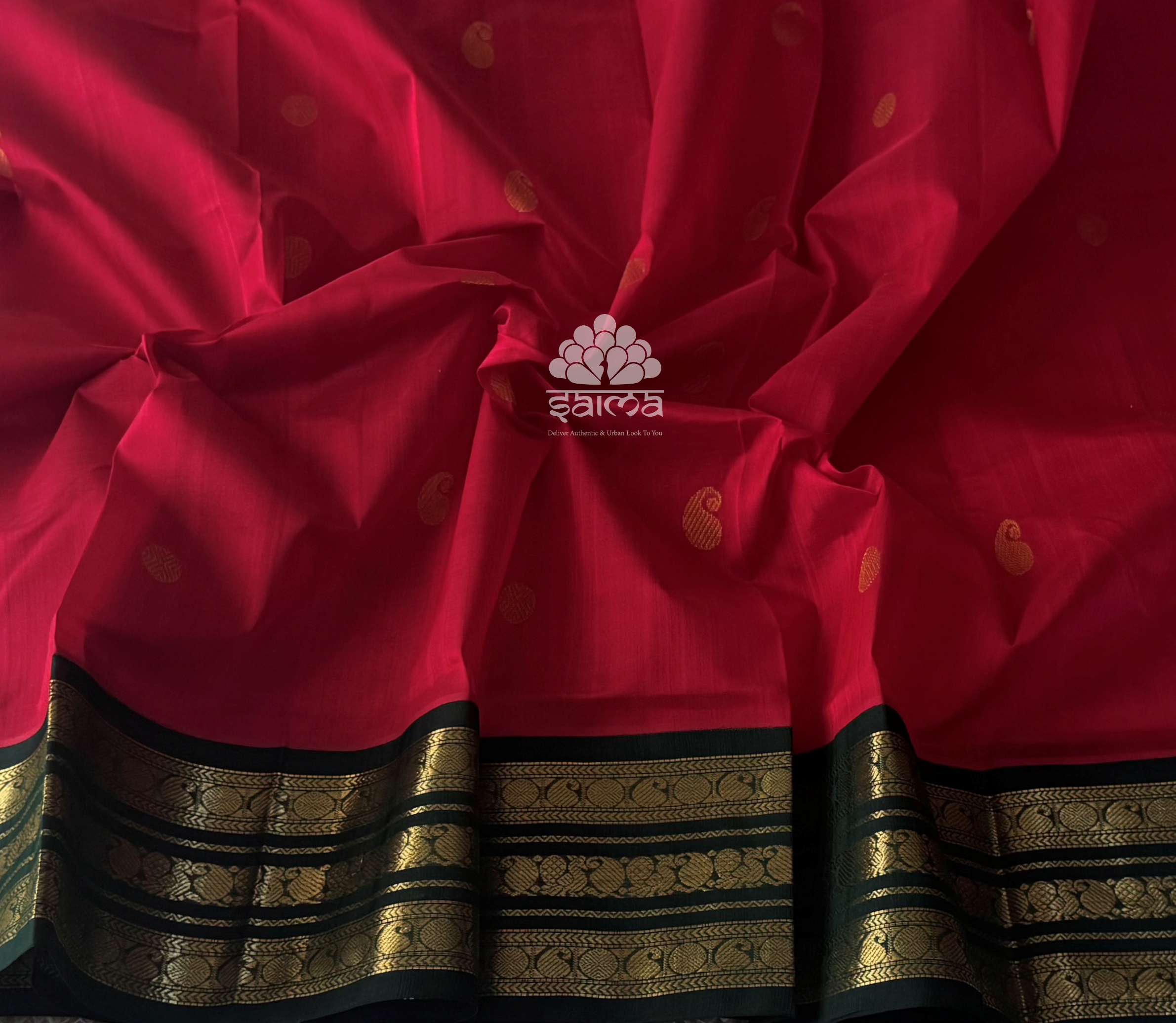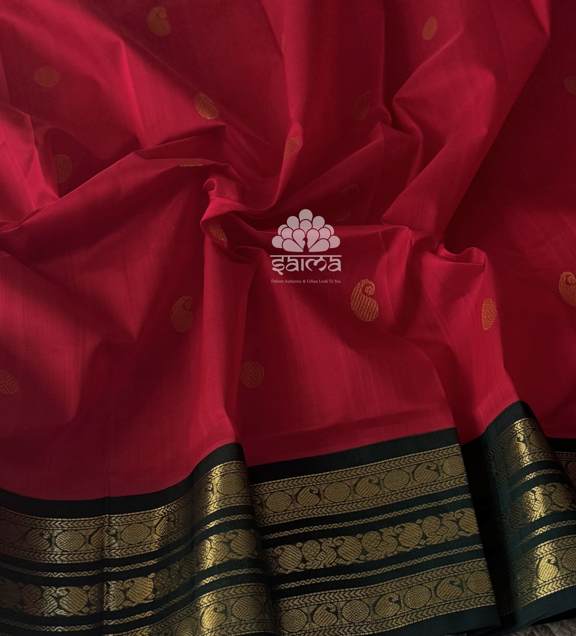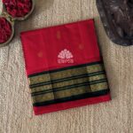 Kanchi korvai silk cotton in red color having mango bhuttas design all over the saree and rich annapakshi designed korvai border. Pallu and blouse in dark green color.