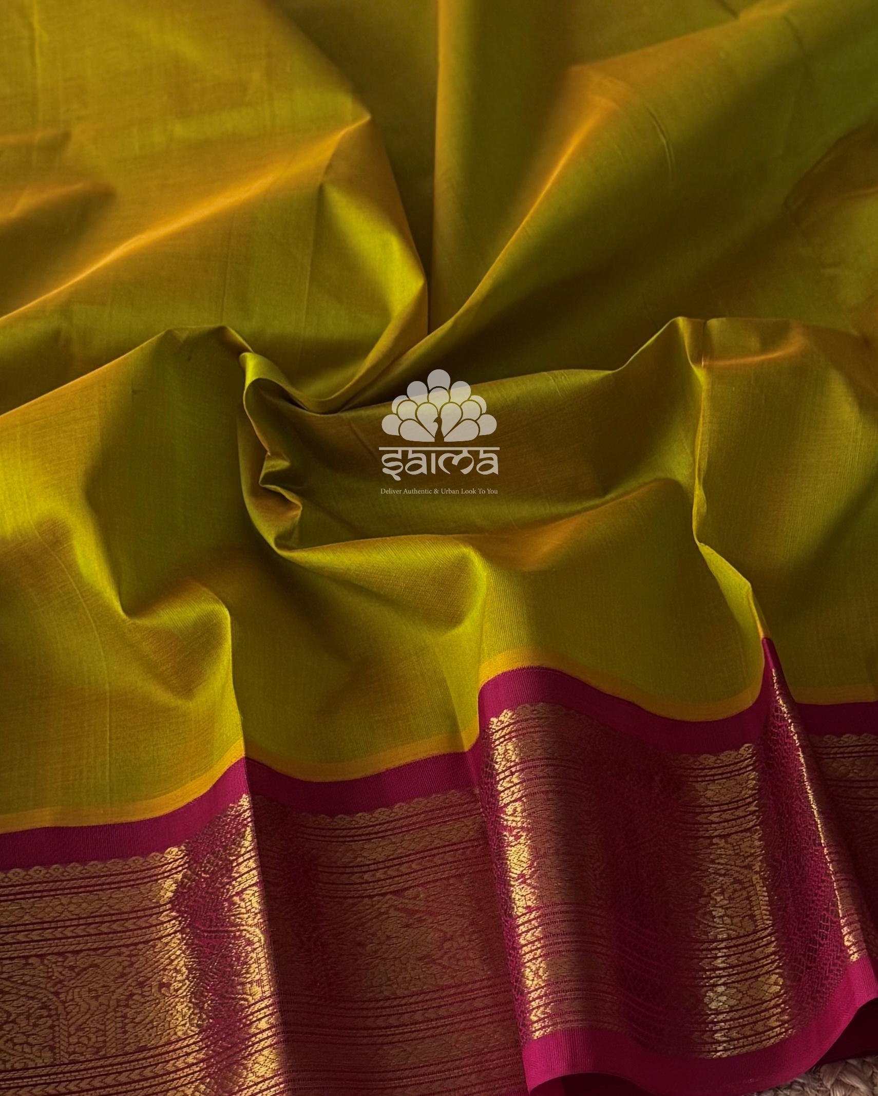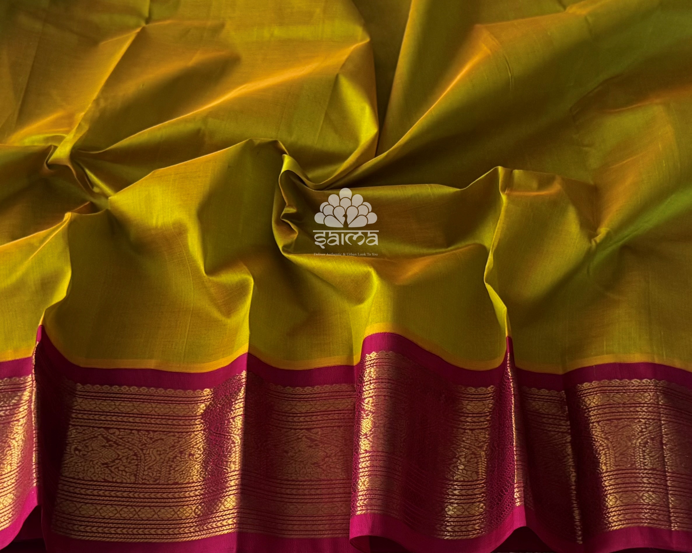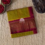 Kanchi korvai silk cotton in mango yellow with subtle green dual tone color having plain design yet with grand annapakshi designed korvai border. Pallu and blouse in dark berry pink color.