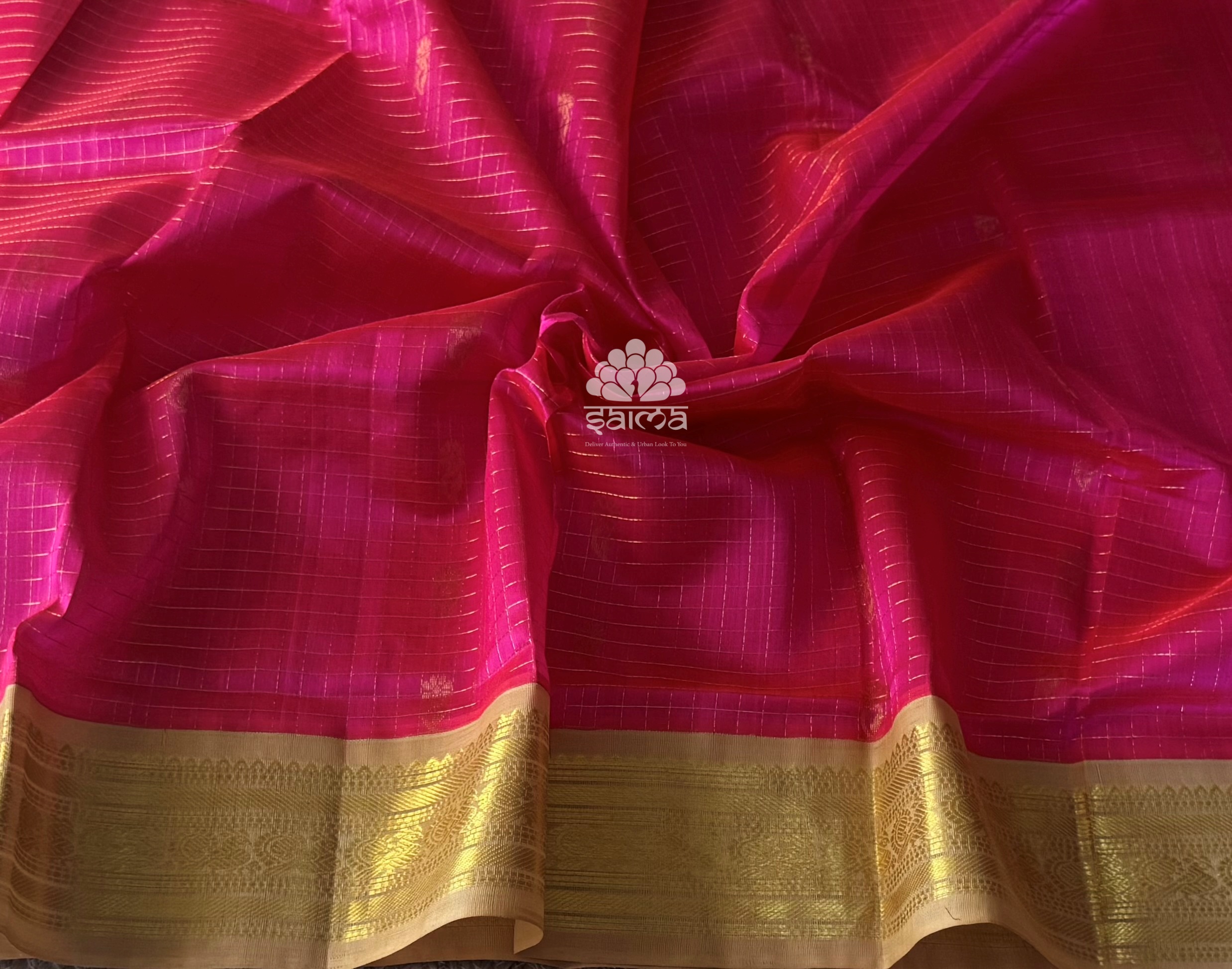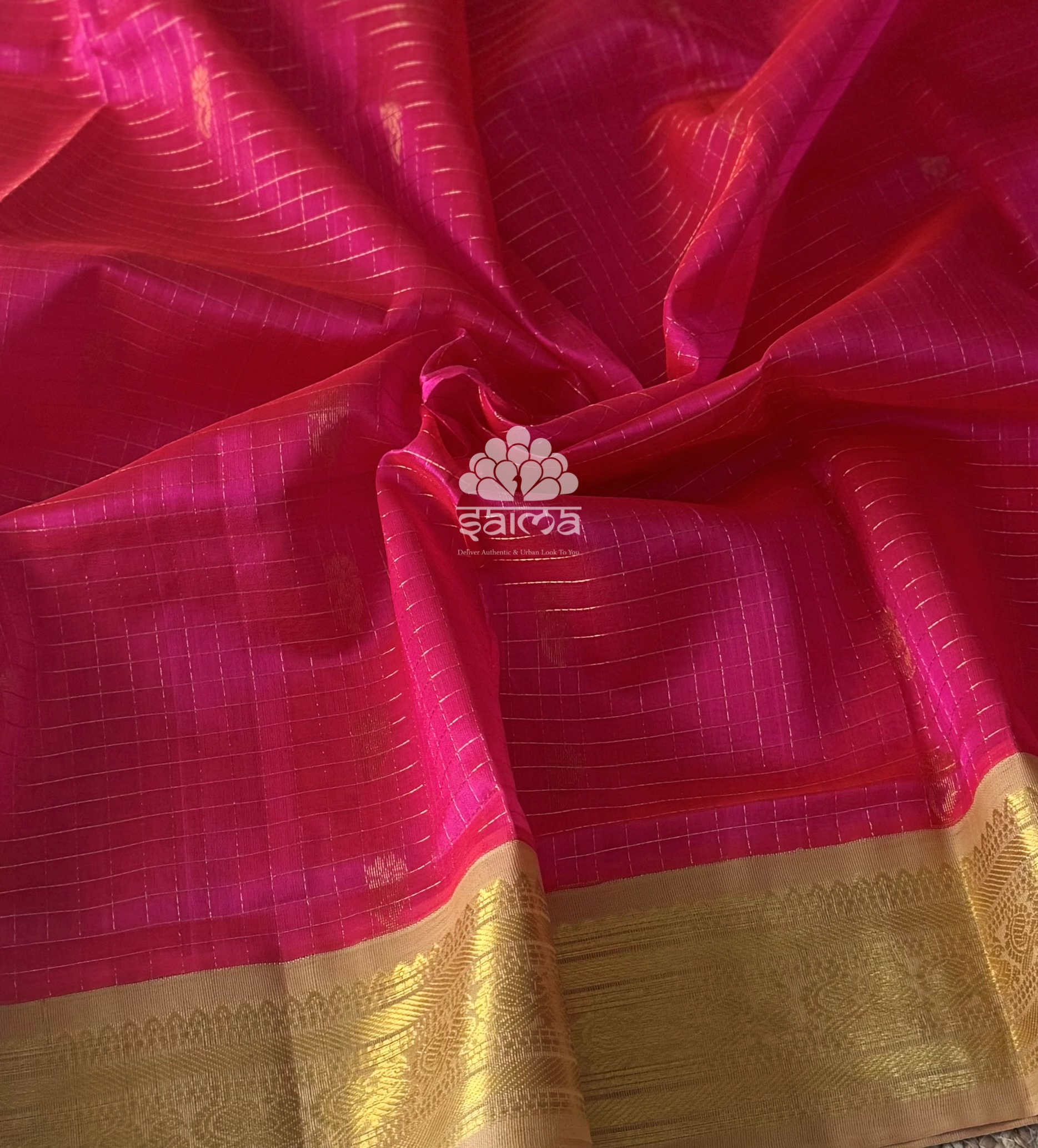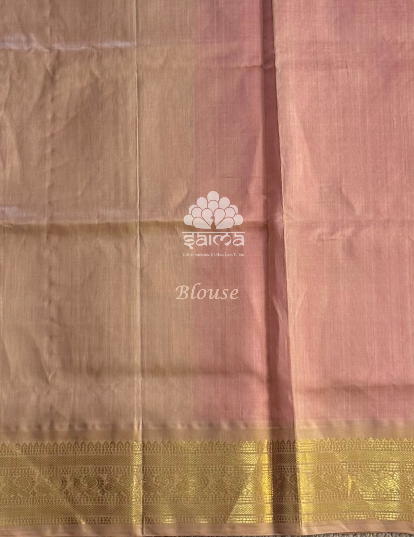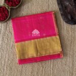 Kanchi korvai silk cotton in hot pink color having zari kattam with bhuttas design body and annapakshi design korvai border. Pallu and blouse in rich light beige shaded color.