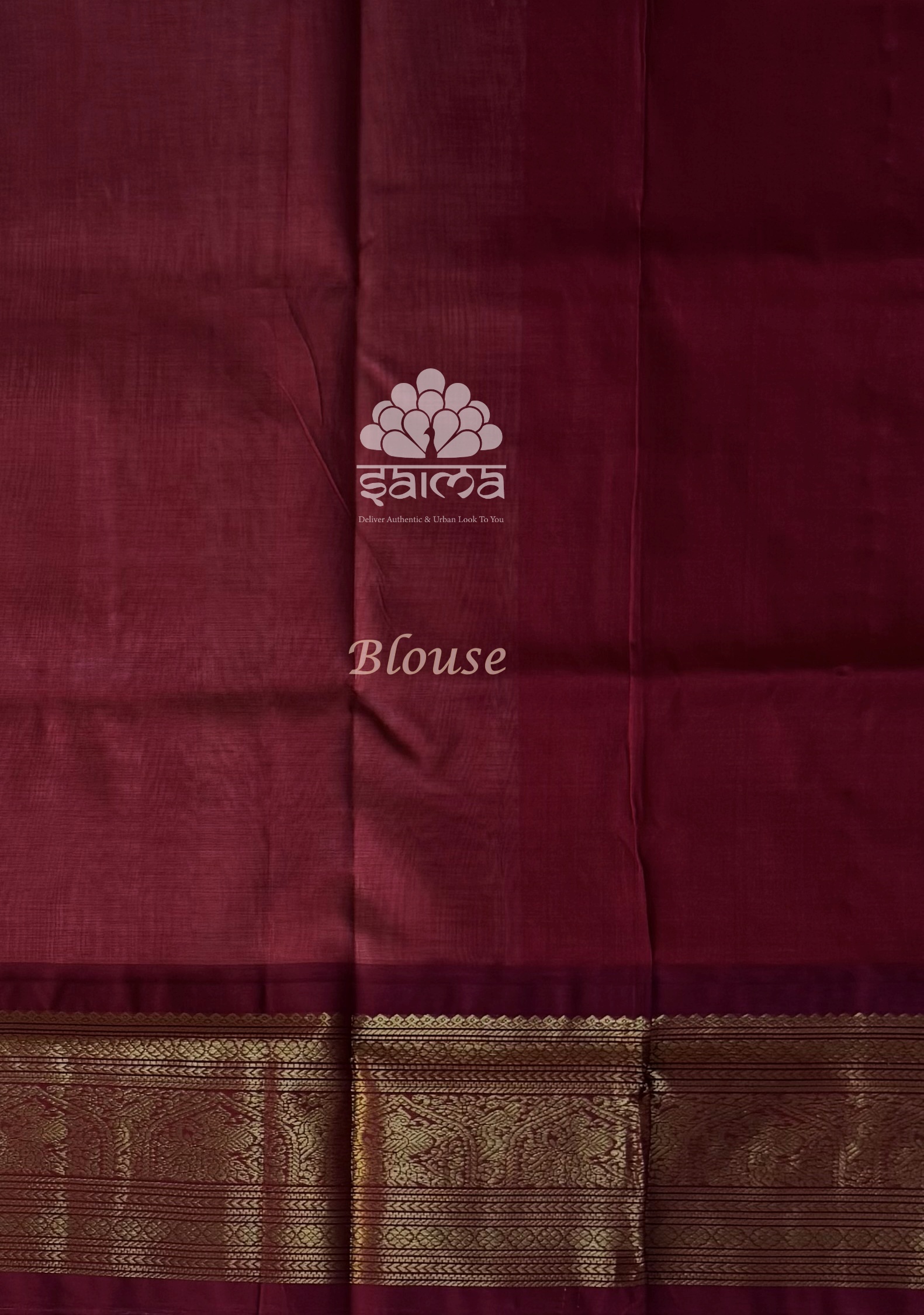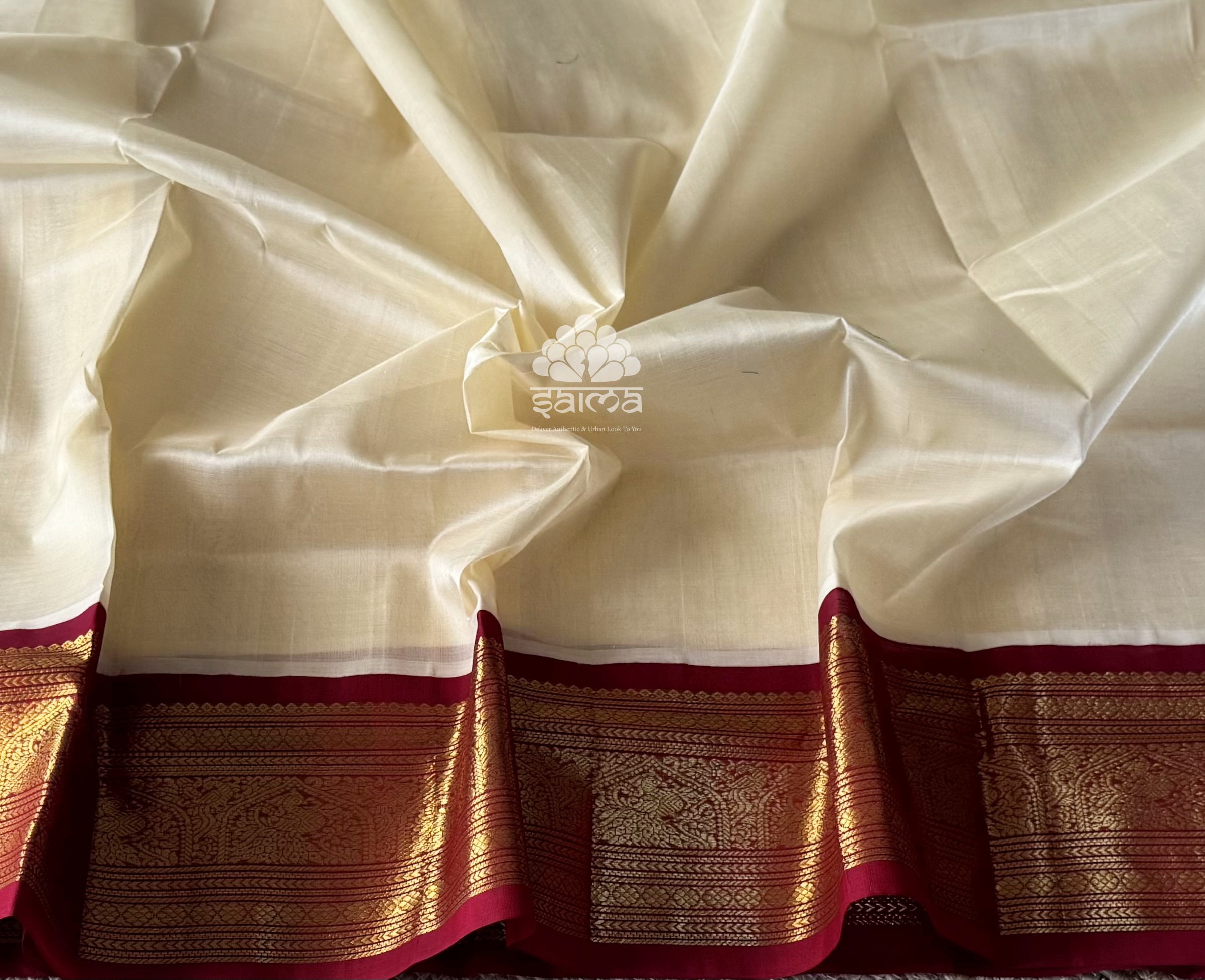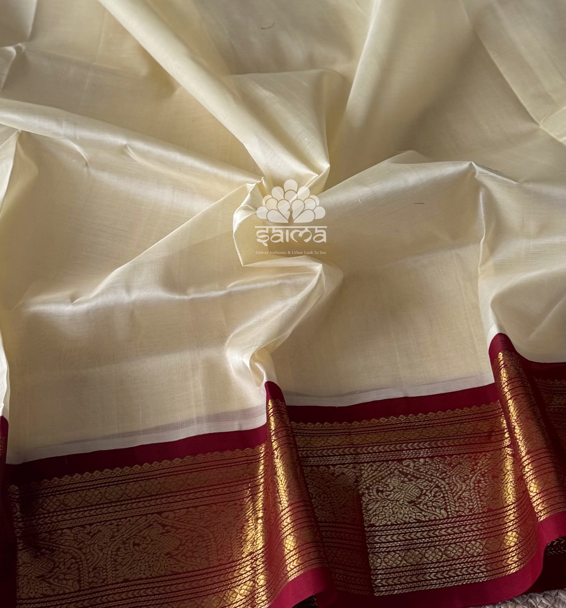 Kanchi korvai silk cotton in off white color having plain design yet with grand annapakshi designed korvai border. Pallu and blouse in reddish maroon color.
