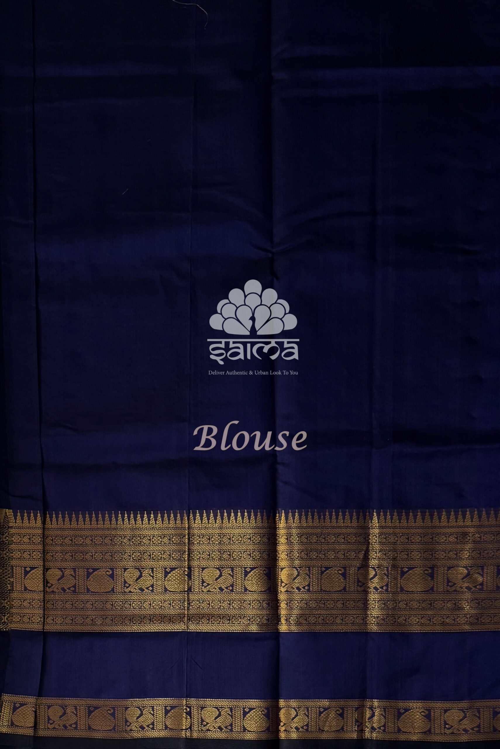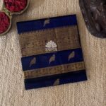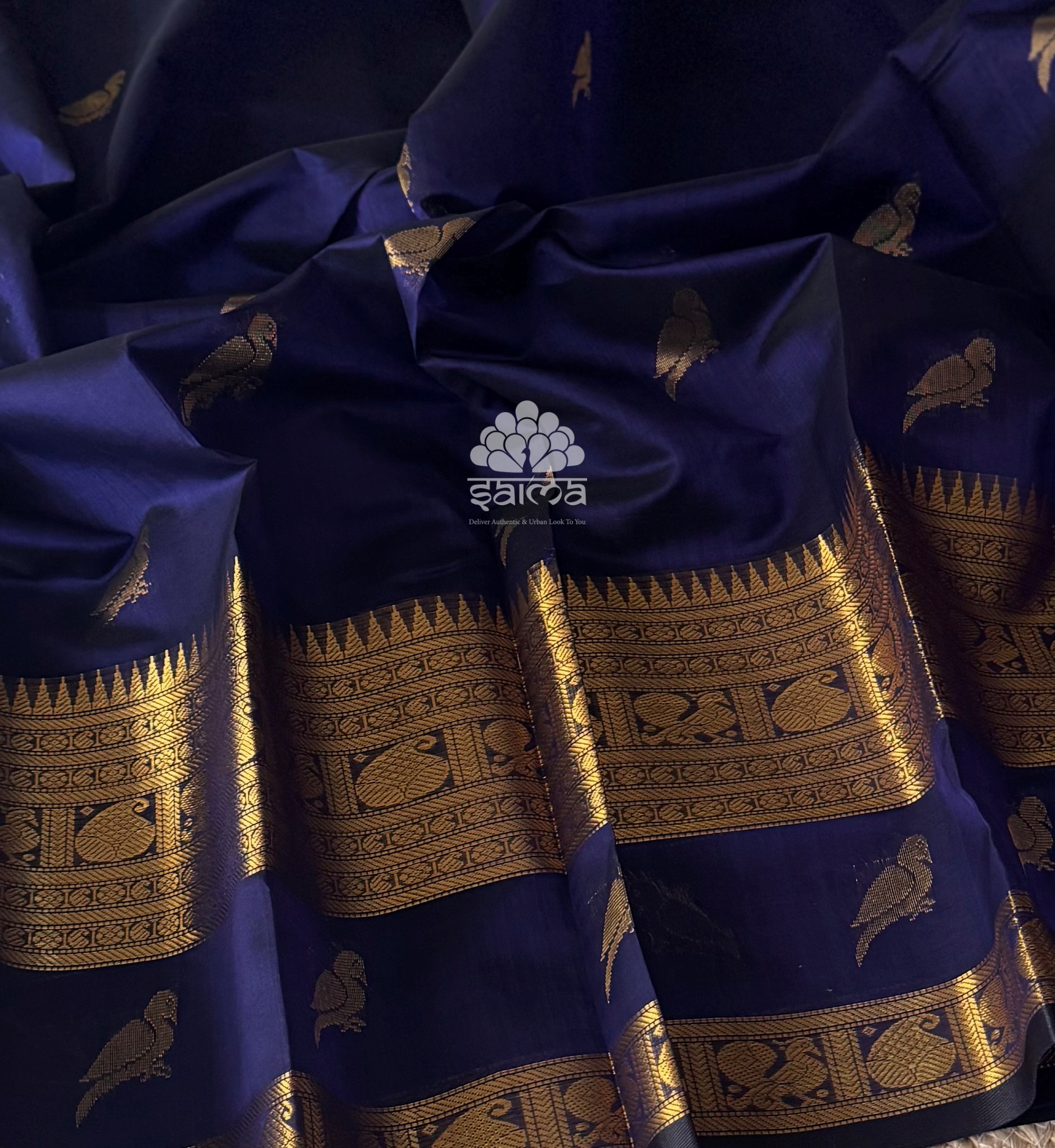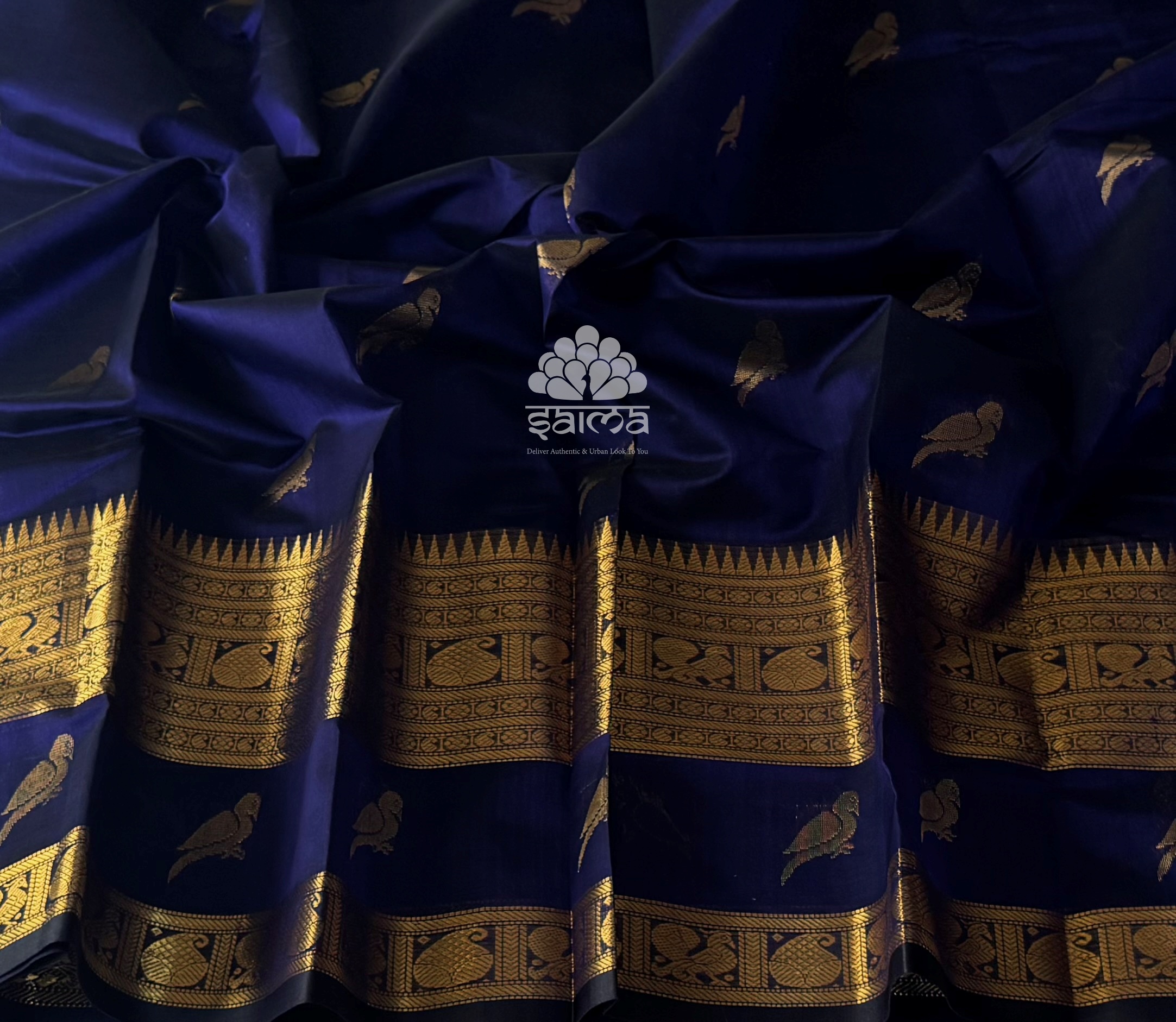 Kanchi silk cotton in navy blue color and having parrot bhuttas all over the saree and grand designed border. Pallu and blouse in self color.