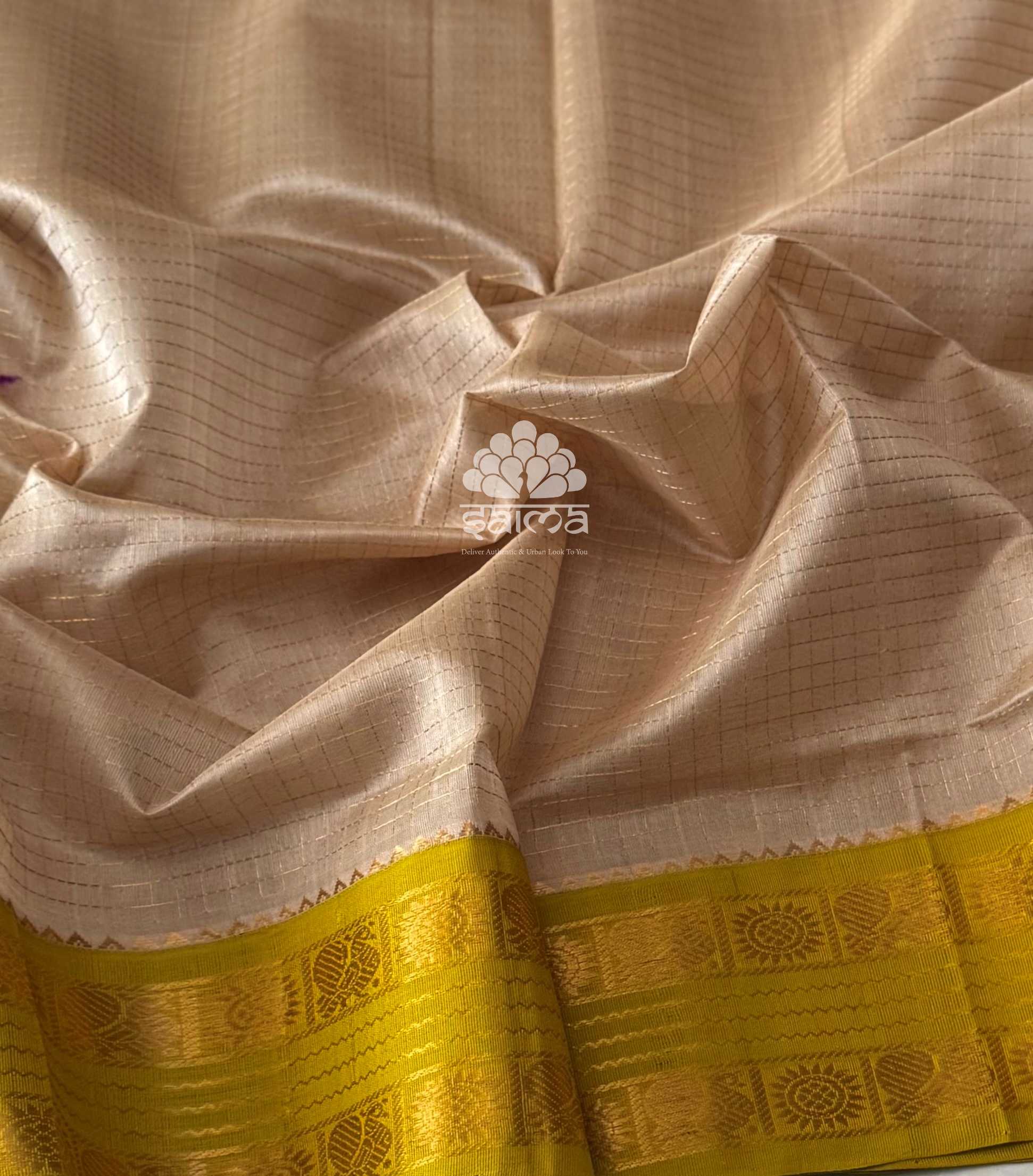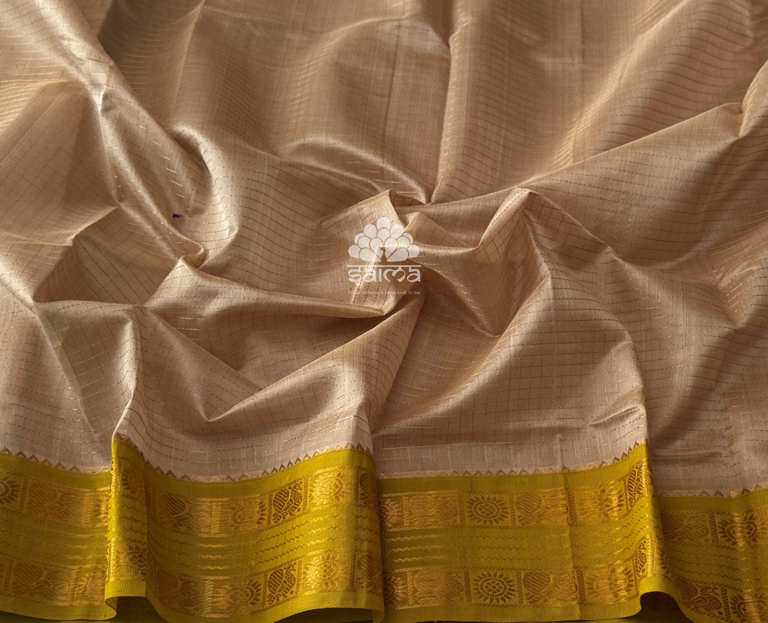 Kanchi korvai silk cotton in soft champagne beige shaded color and having zari kattam design body and rettai pettu korvai design border. Pallu and blouse in lemon yellow with light green tint color.