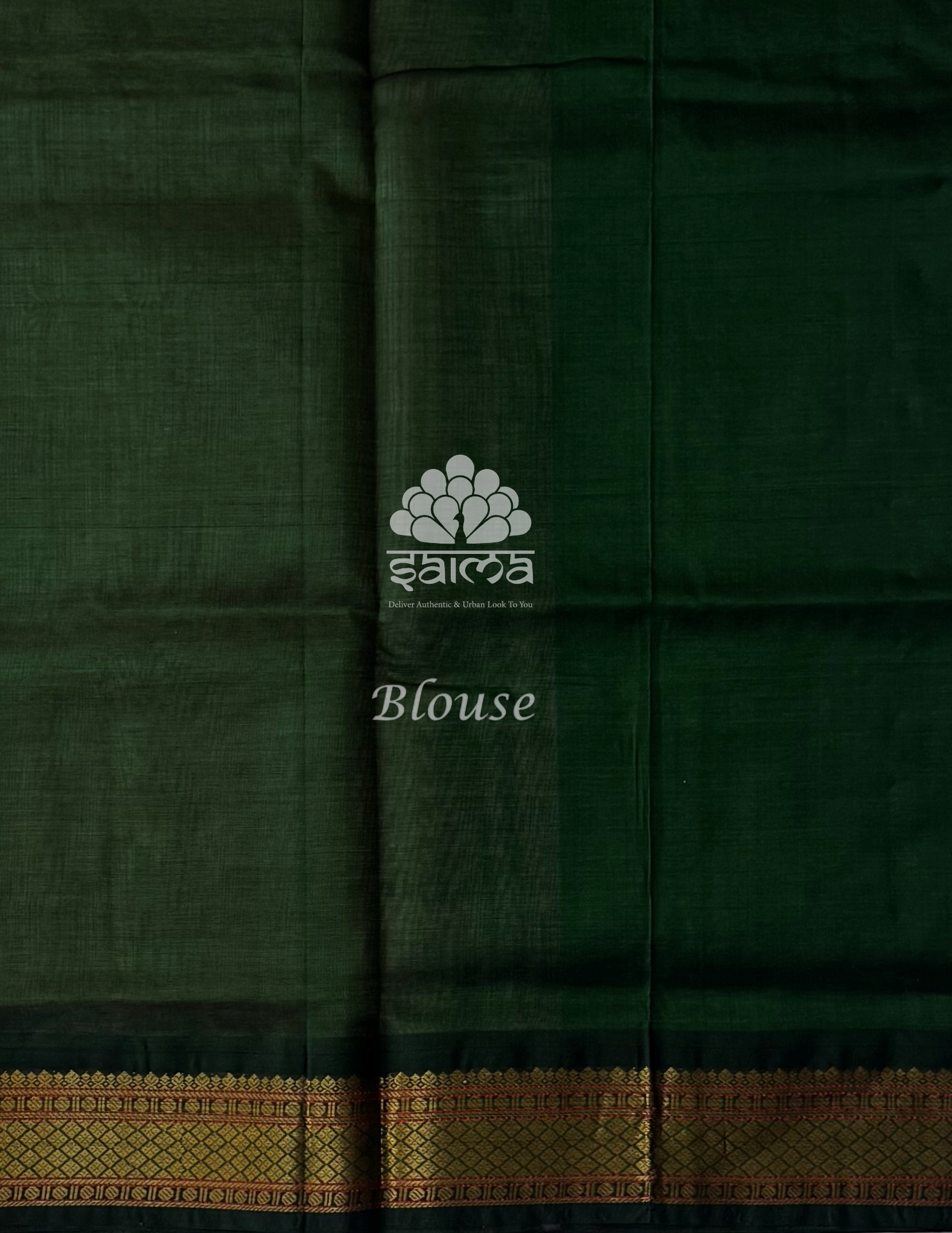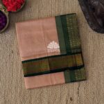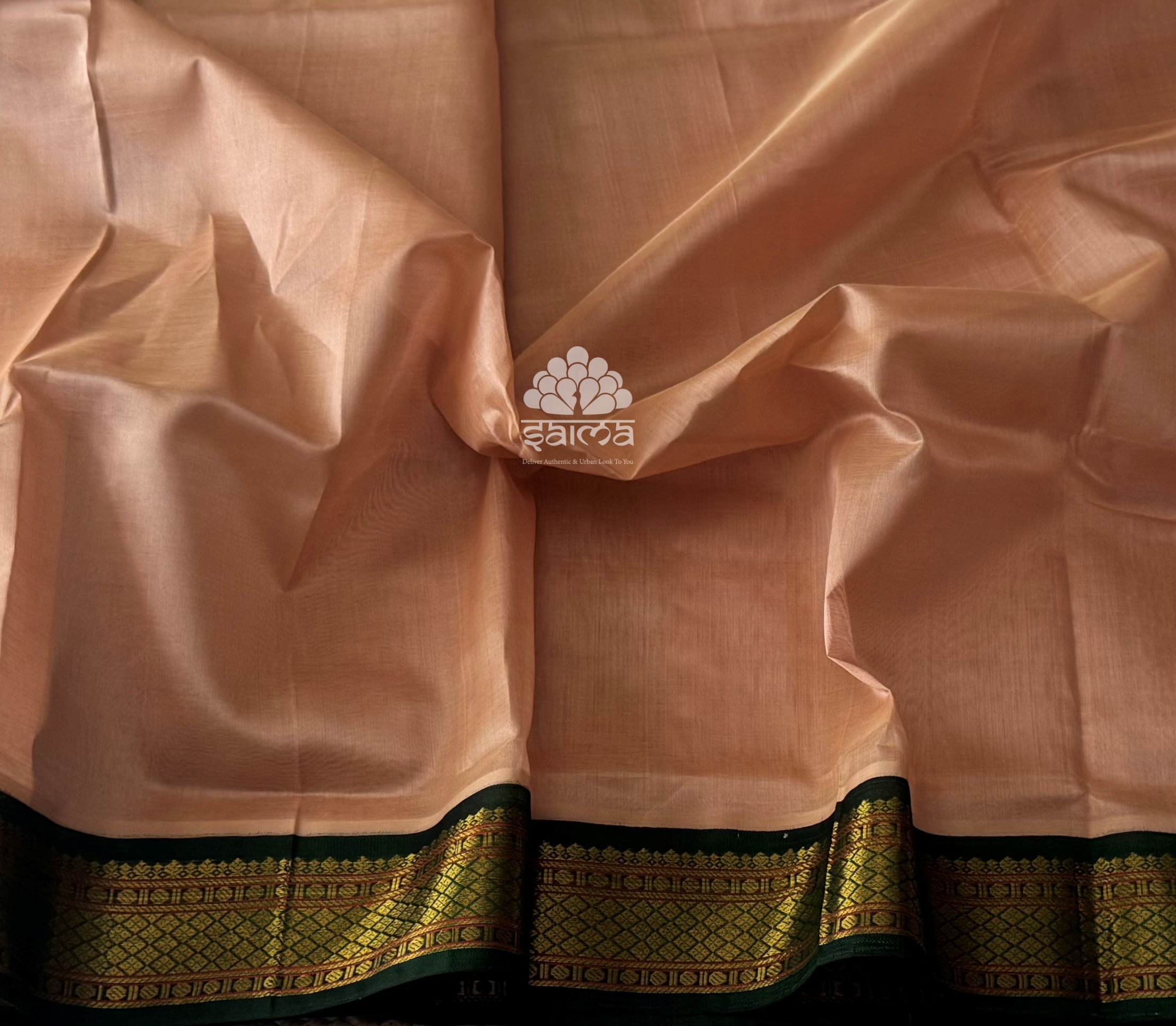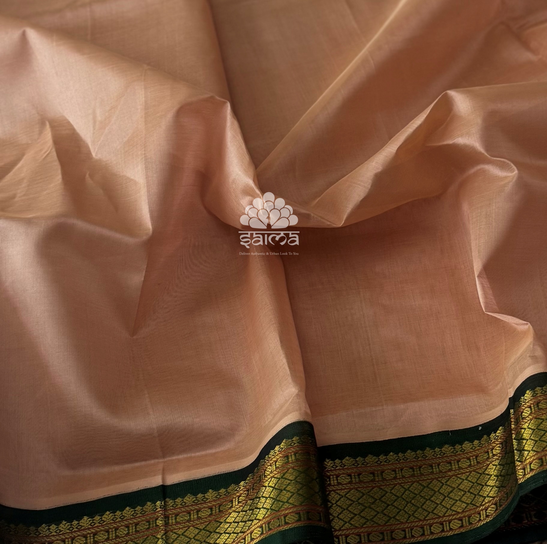 Kanchi korvai silk cotton in sandy beige color having plain designed body and rich zari korvai border. Pallu and blouse in dark green color.