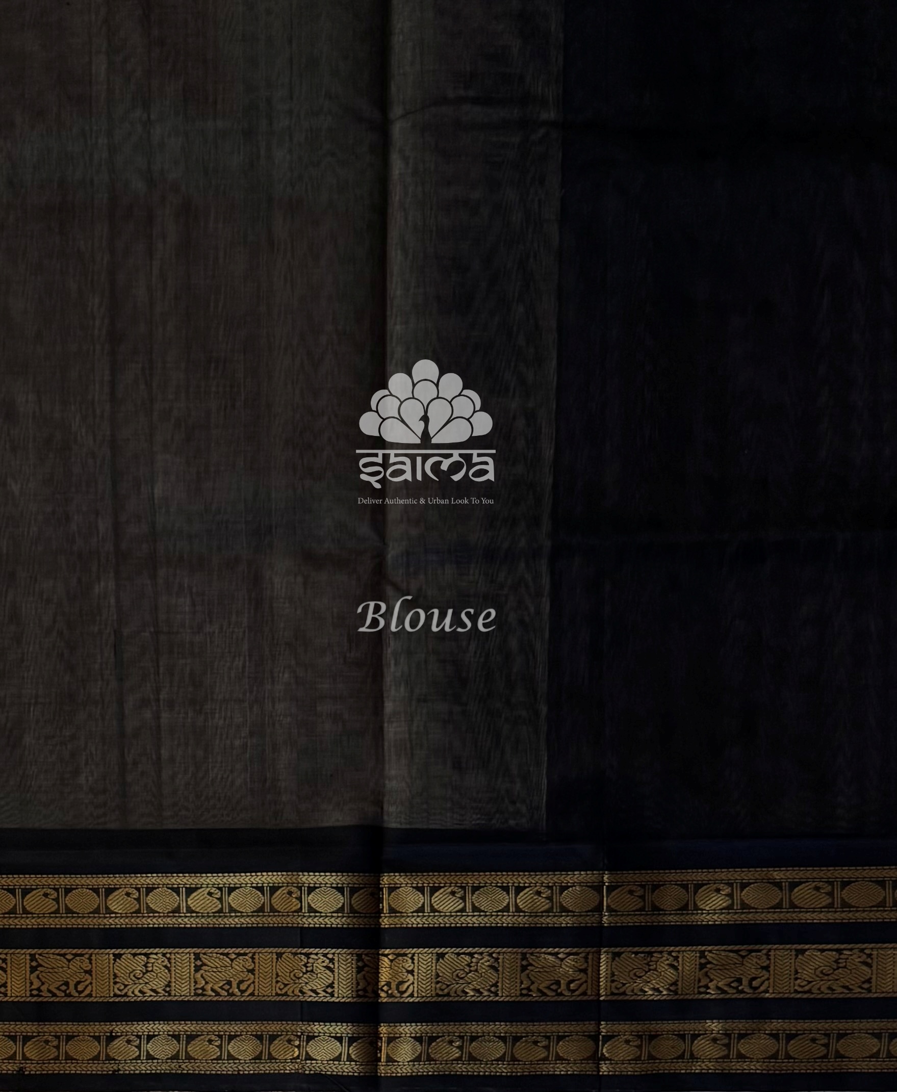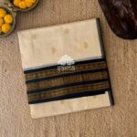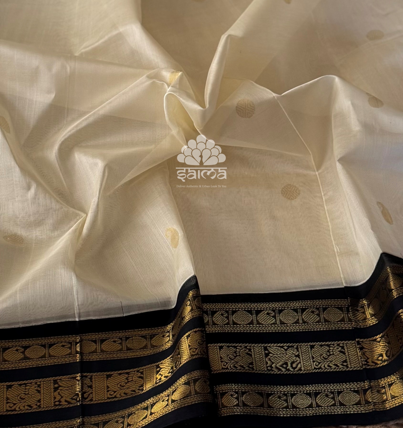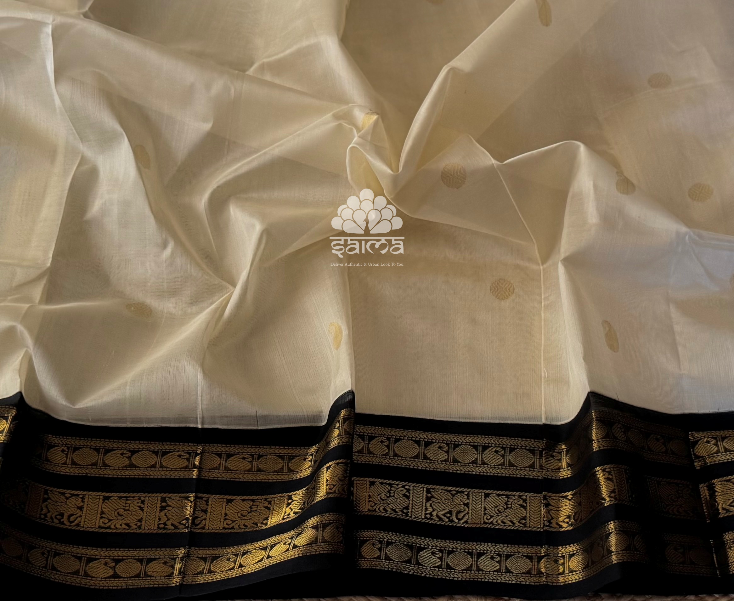 Kanchi korvai silk cotton in half white color having mango bhuttas design body and rich mango, polka and annapakshi designed korvai border. Pallu and blouse in black color.