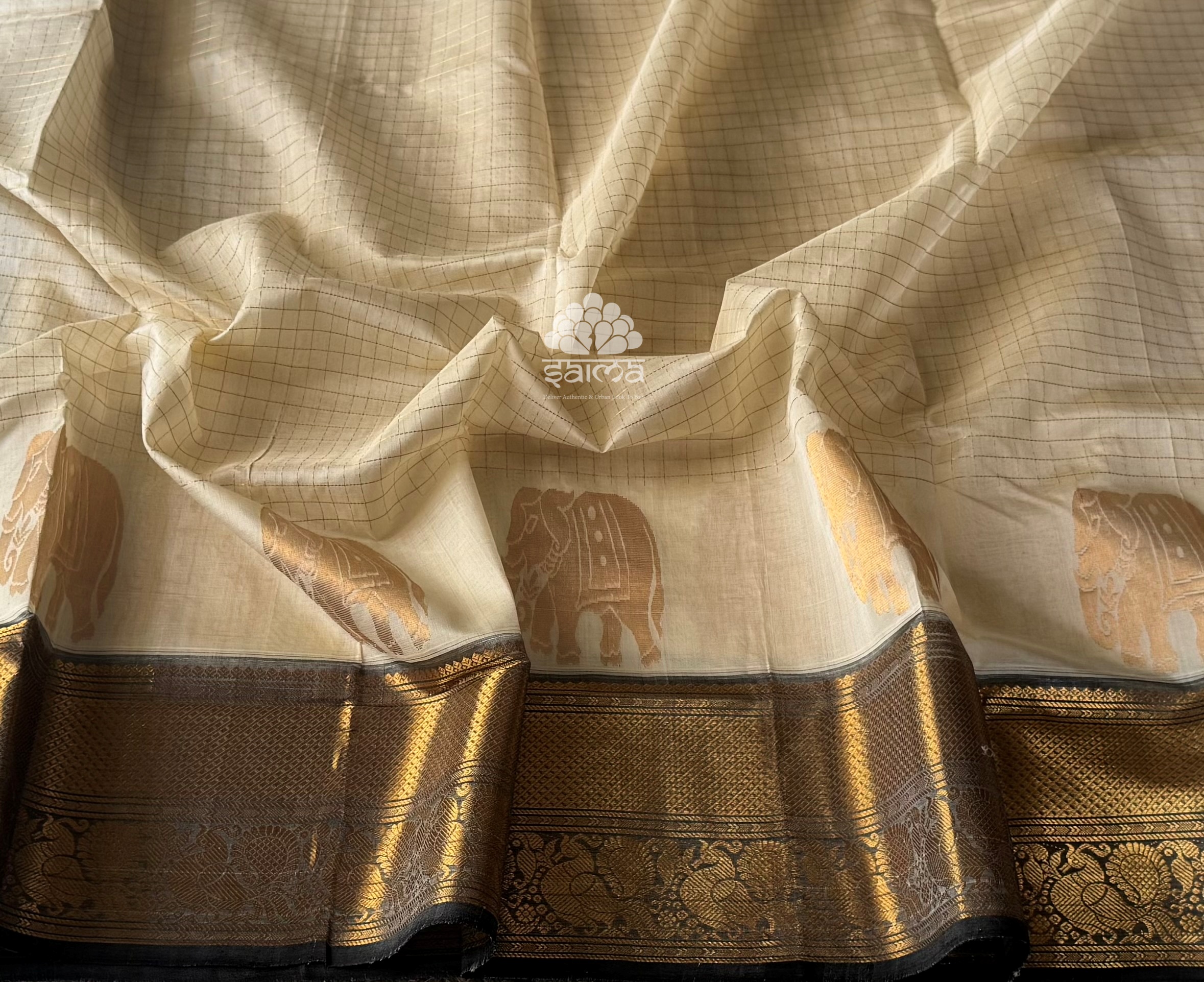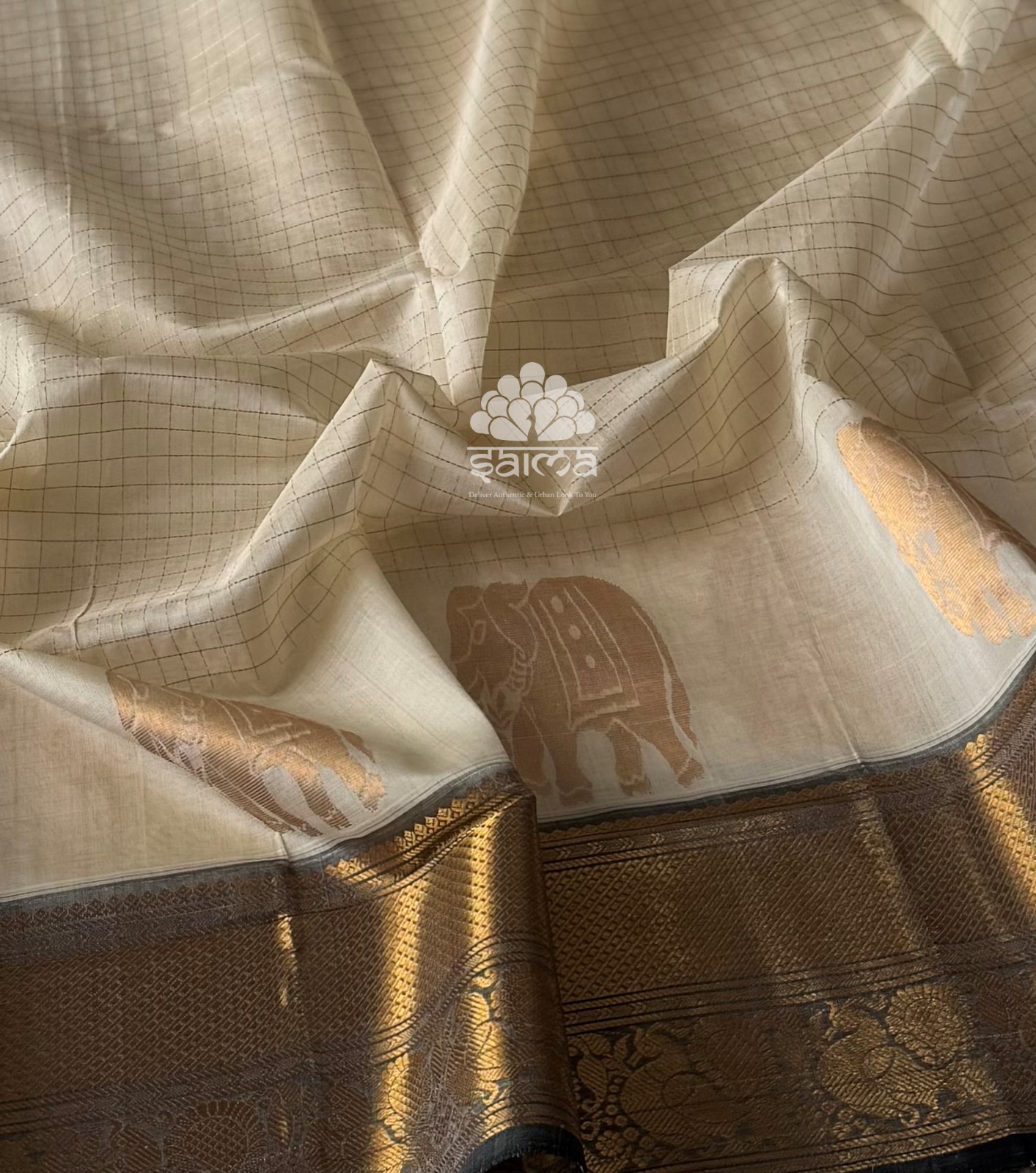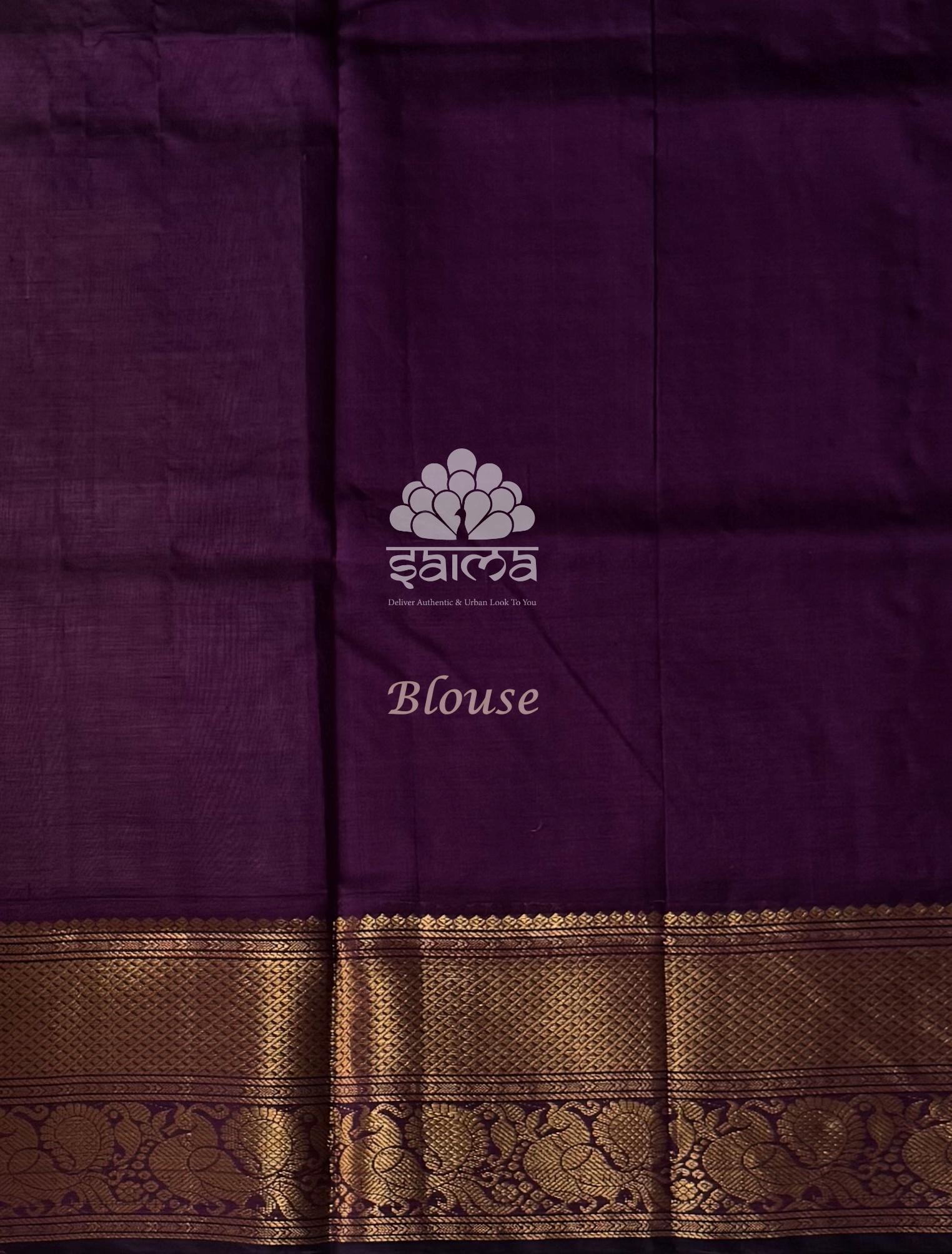 Kanchi silk cotton off white color having zari kattam all over the saree and elephant designed bottom border. Pallu and blouse in purple color.