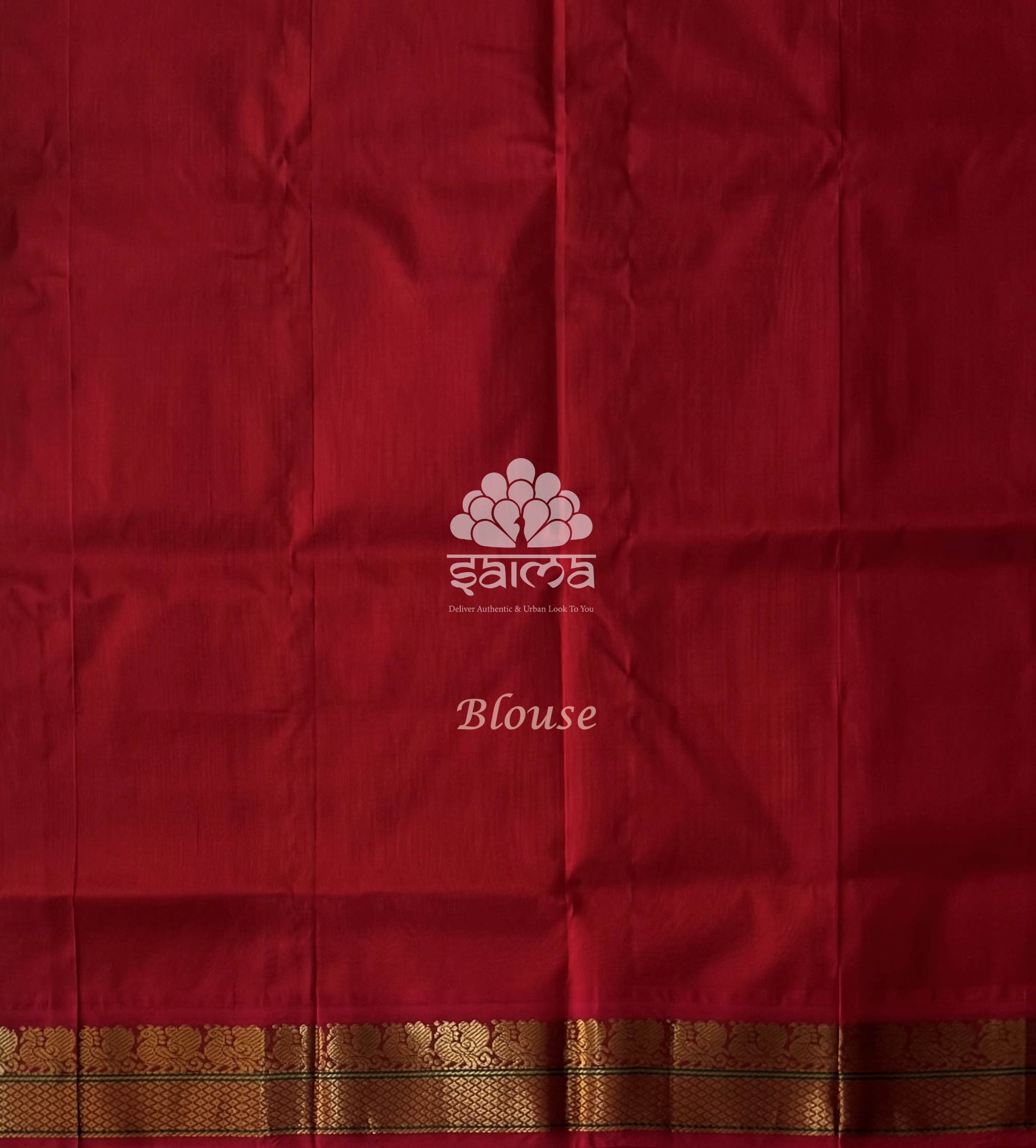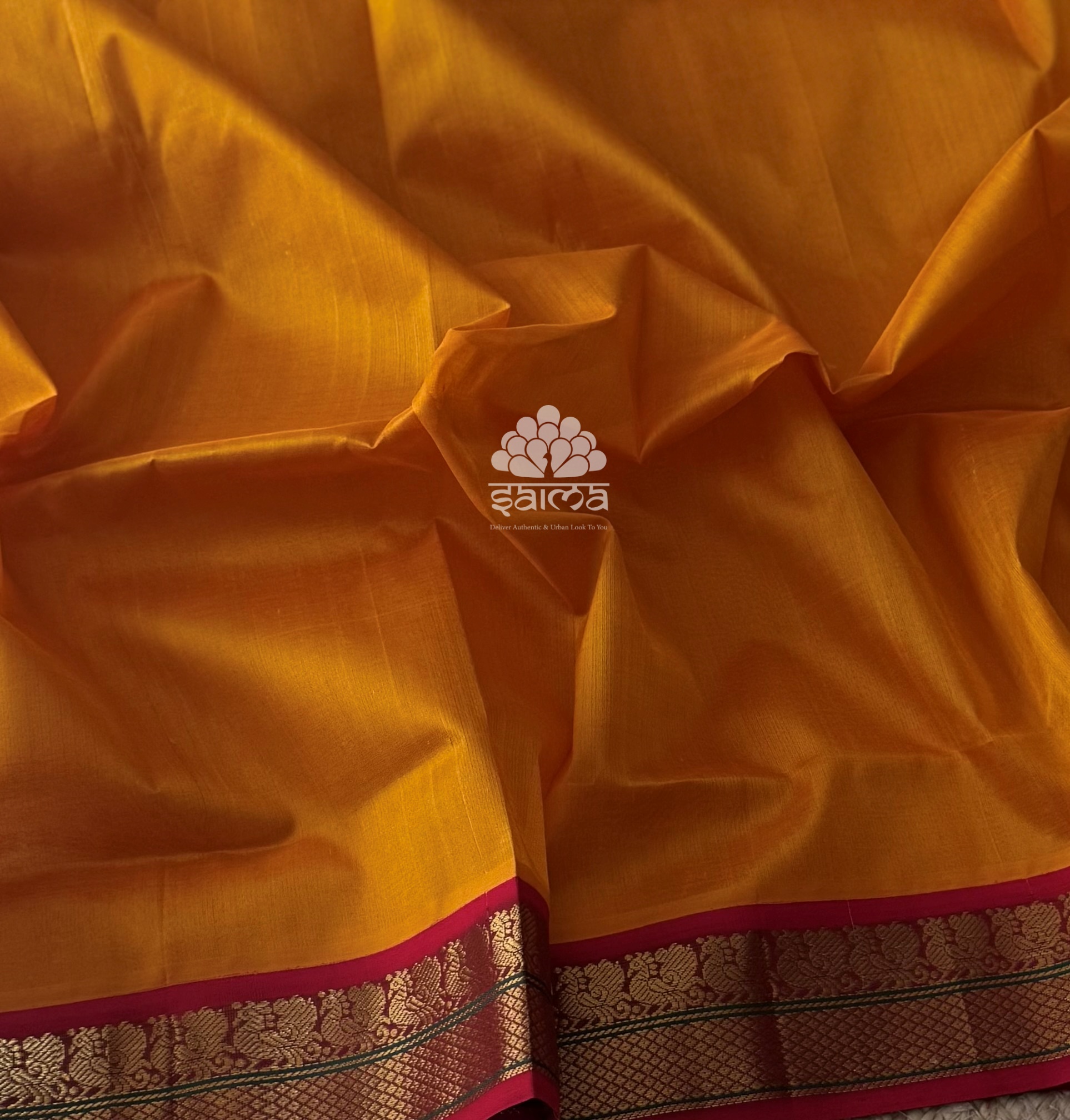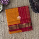 Kanchi korvai silk cotton in antique turmeric shaded color having plain design and annapakshi design korvai border. Pallu and blouse in red color.